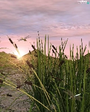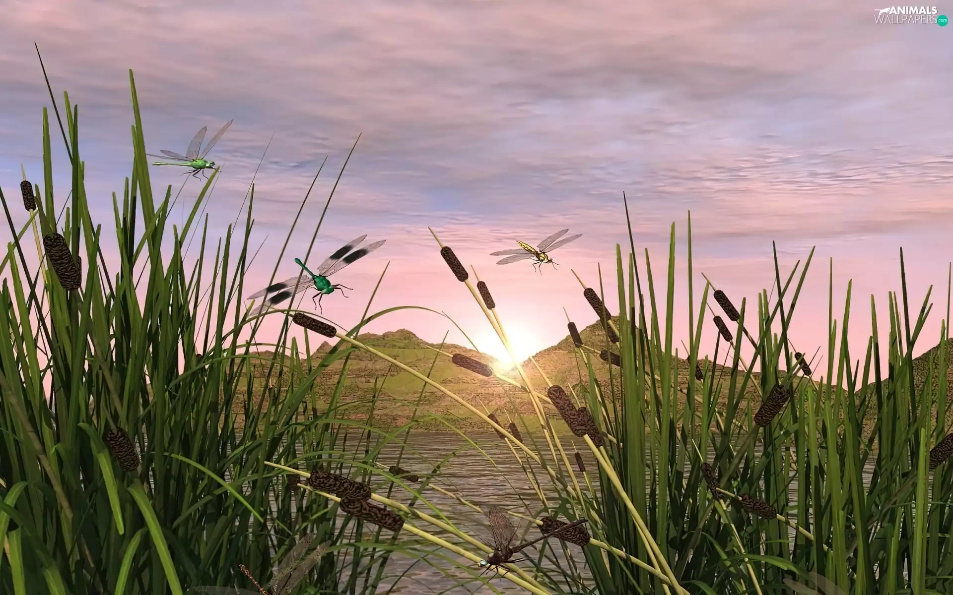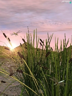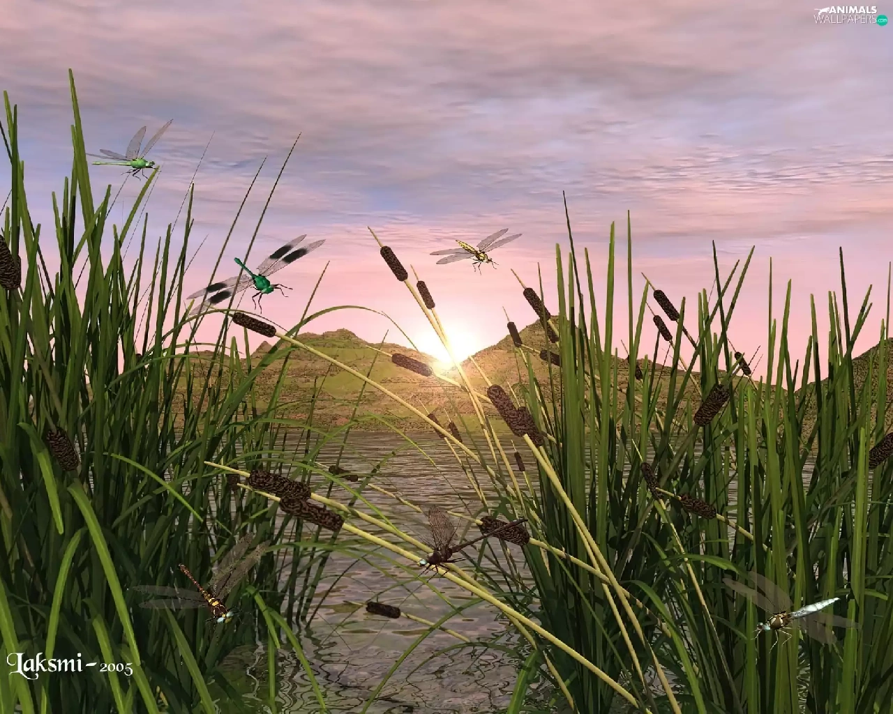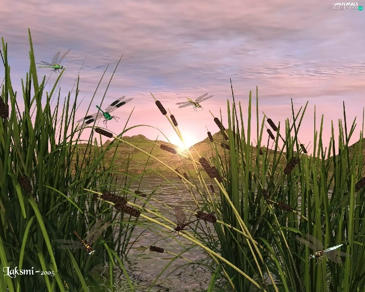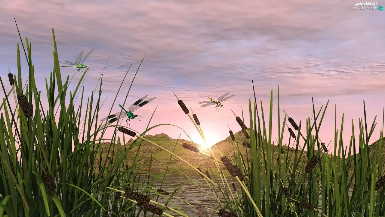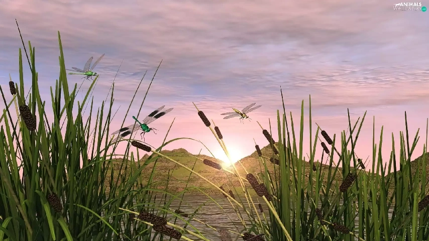 lake, dragon-fly, 3D, sweet flag