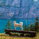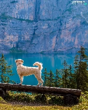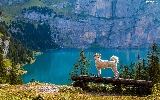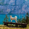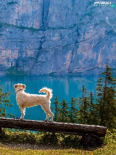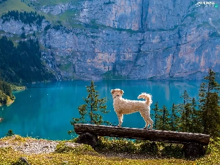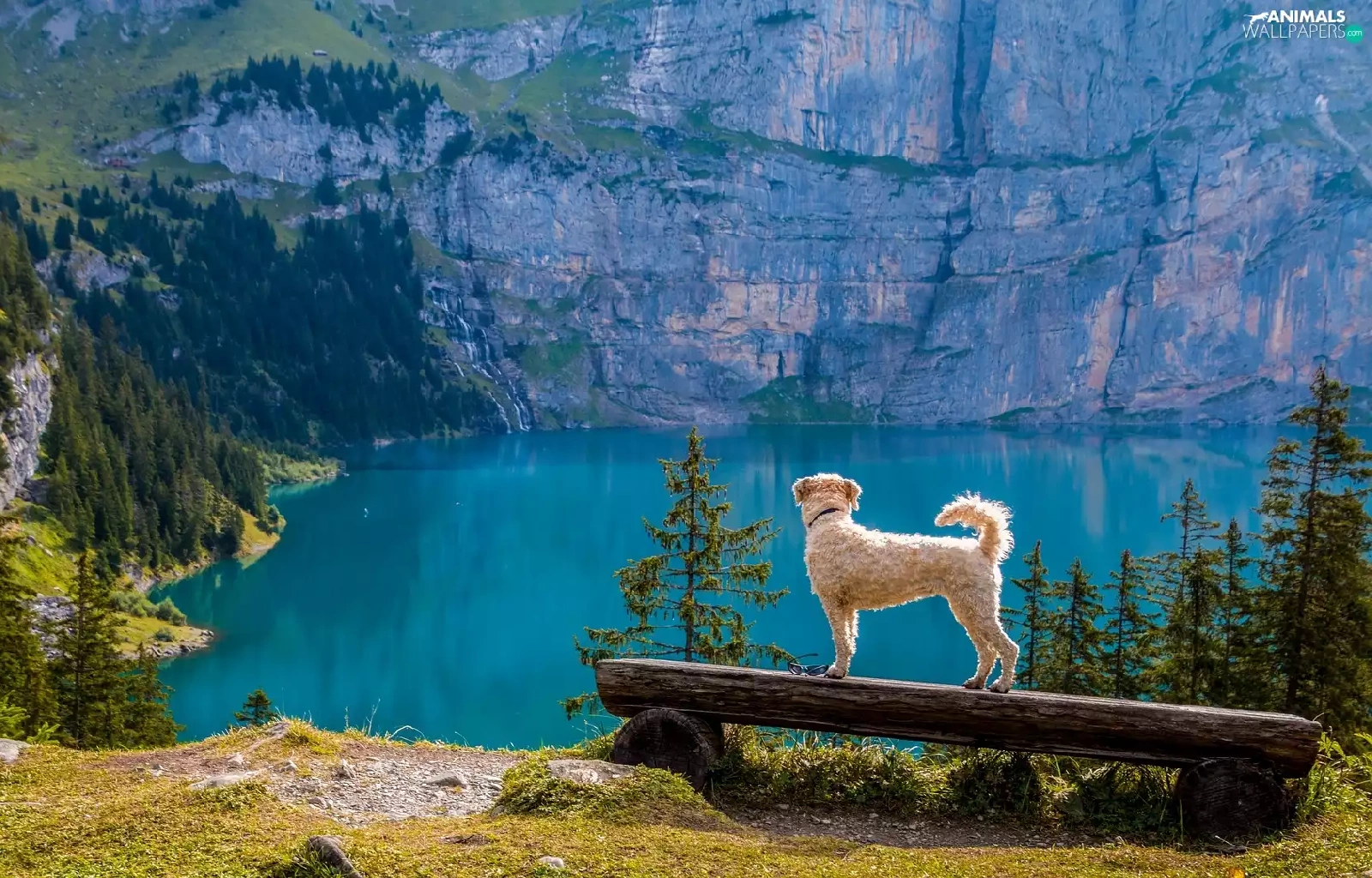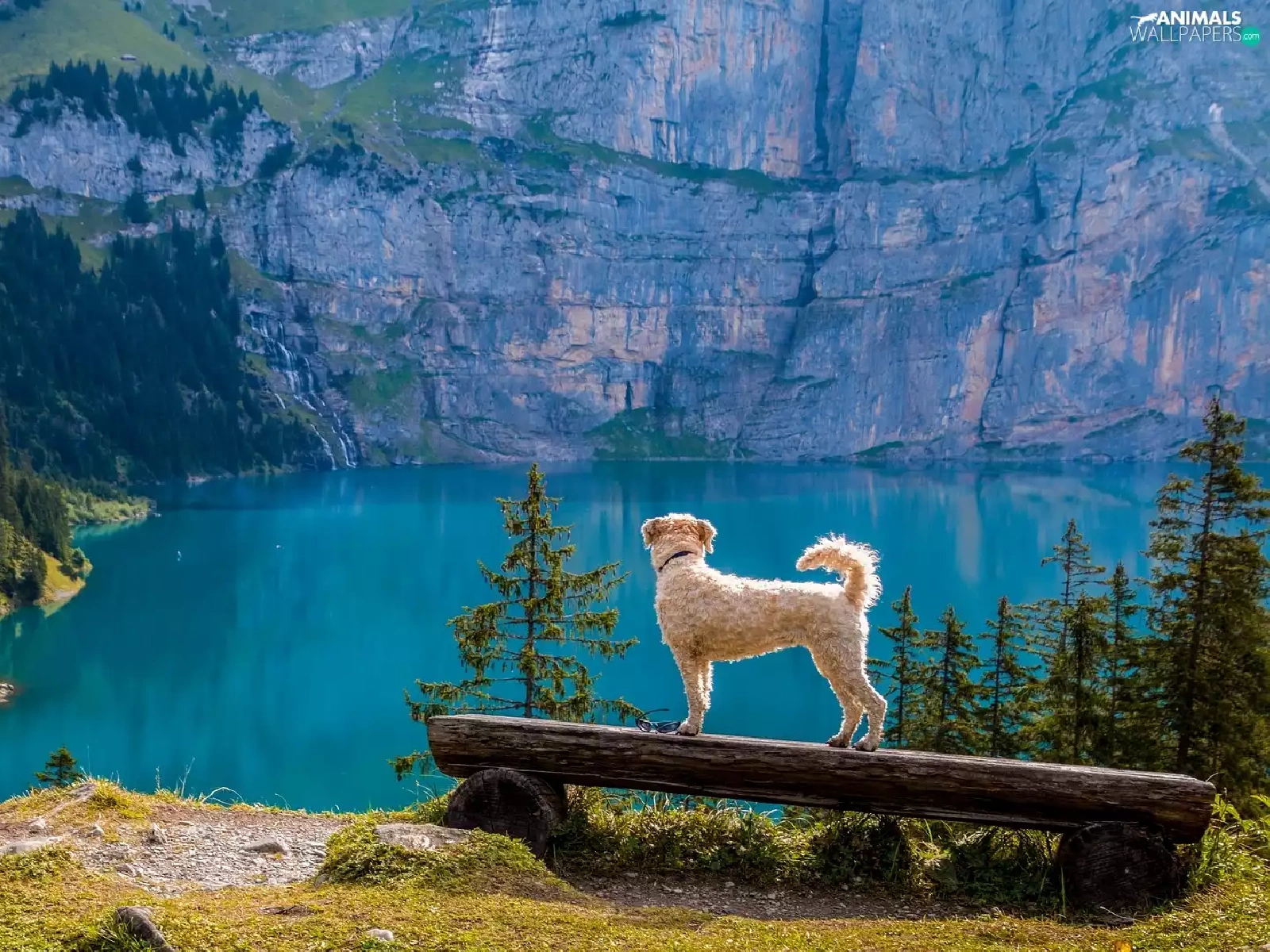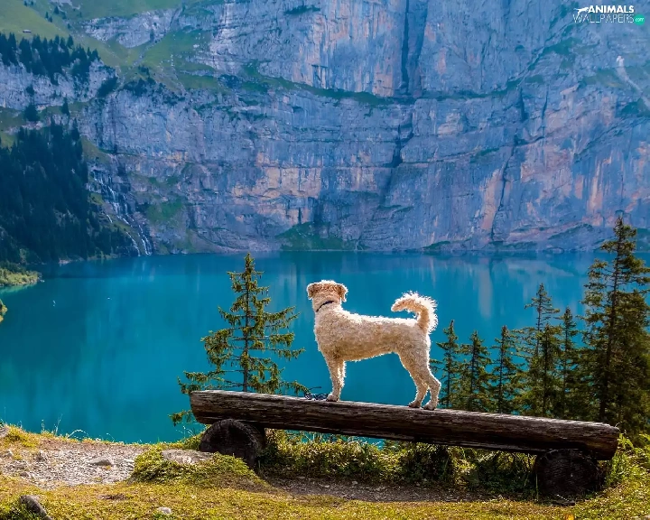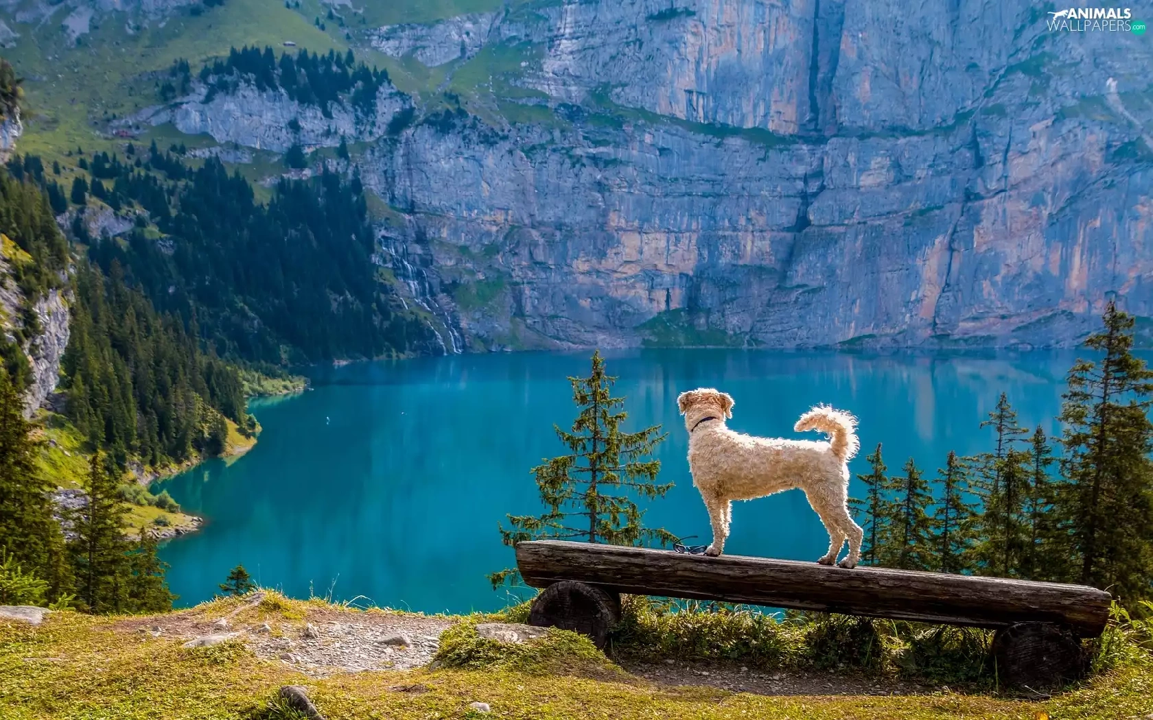 Bench, Mountains, Canton of Bern, Bernese Alps, Oeschinen Lake, dog, Switzerland