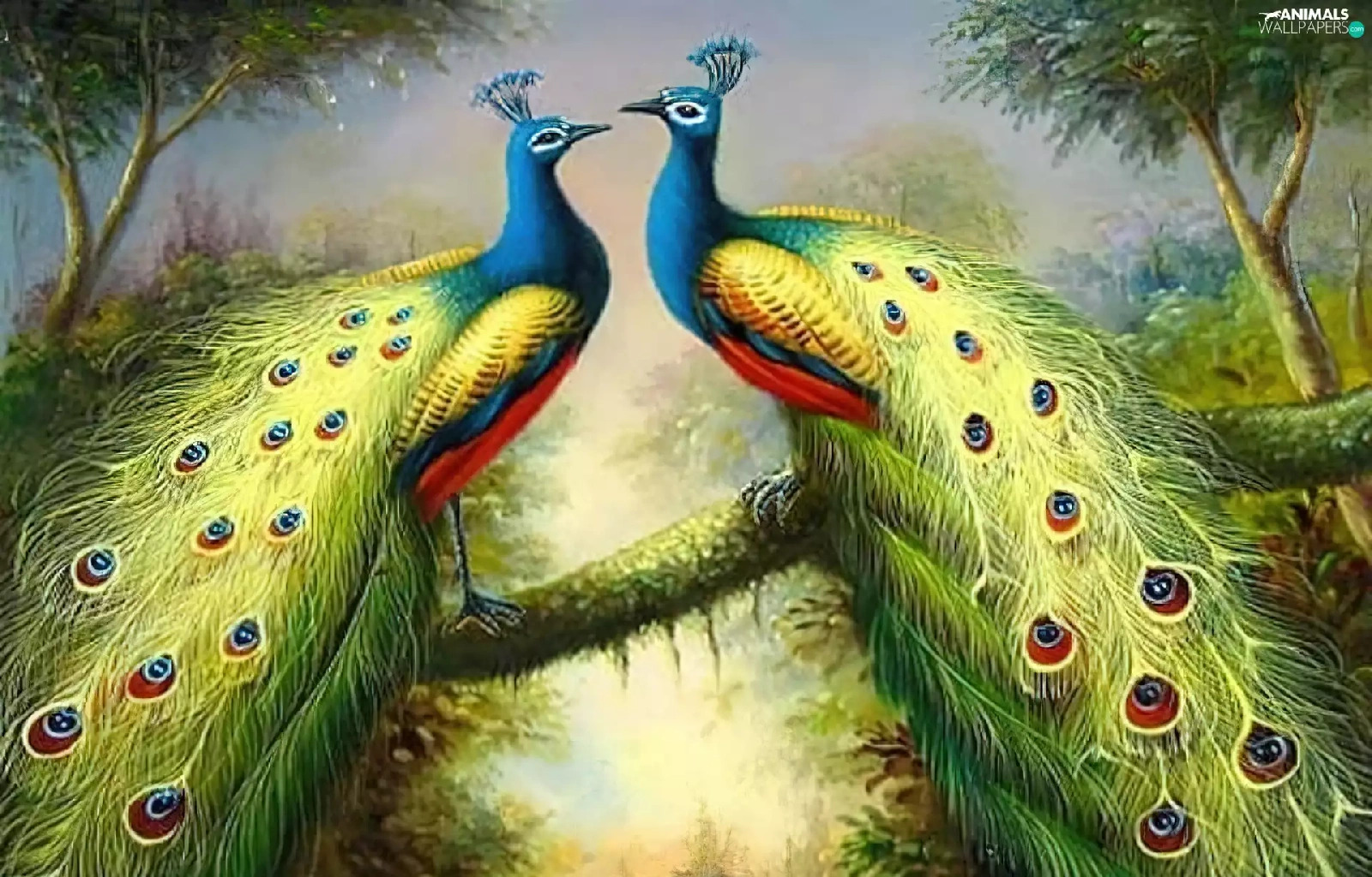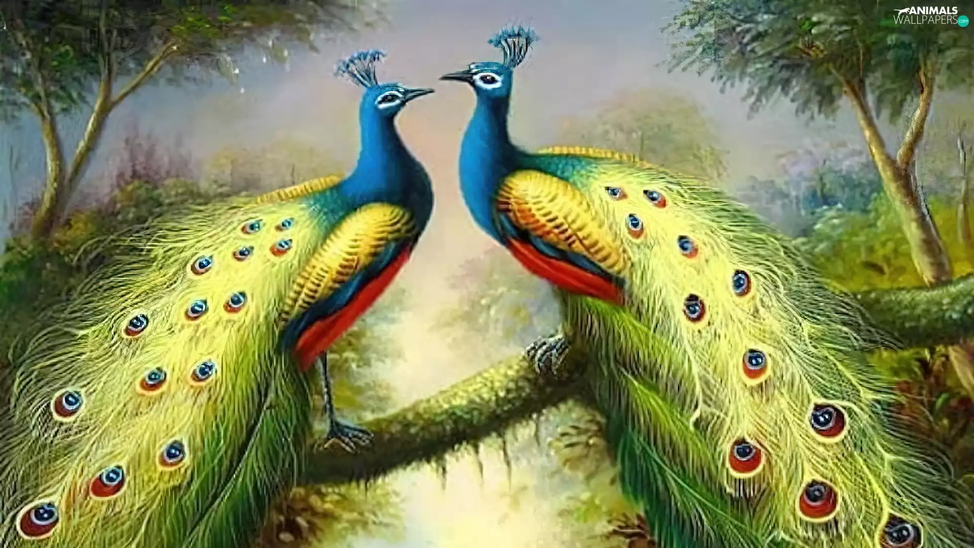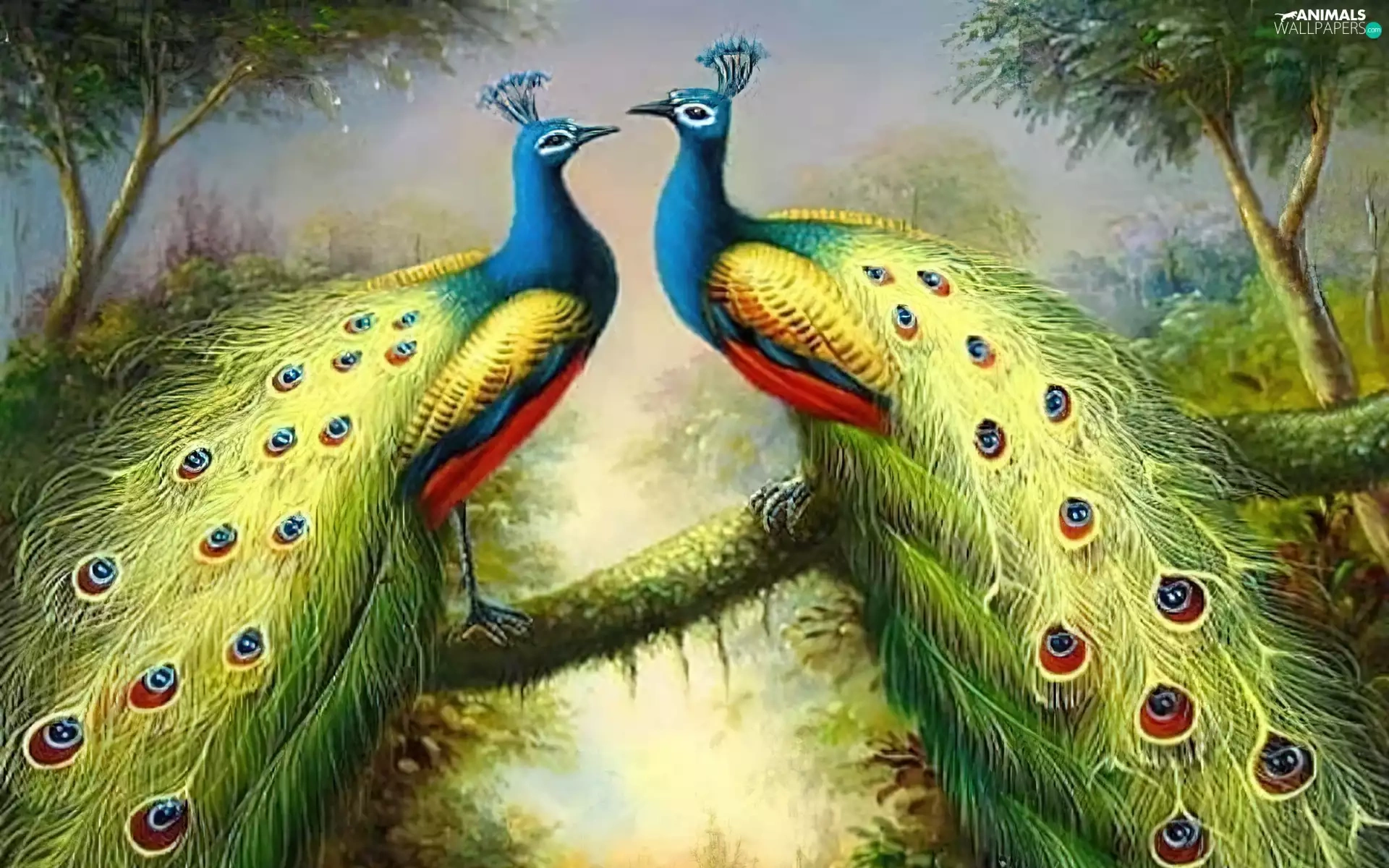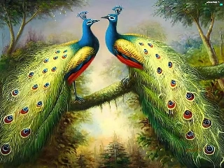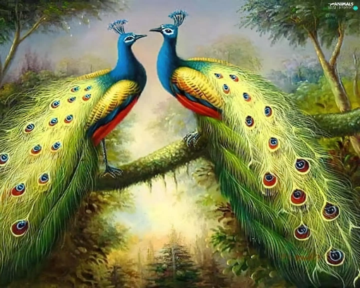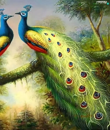 branch, copy, peacocks, an, Two cars
