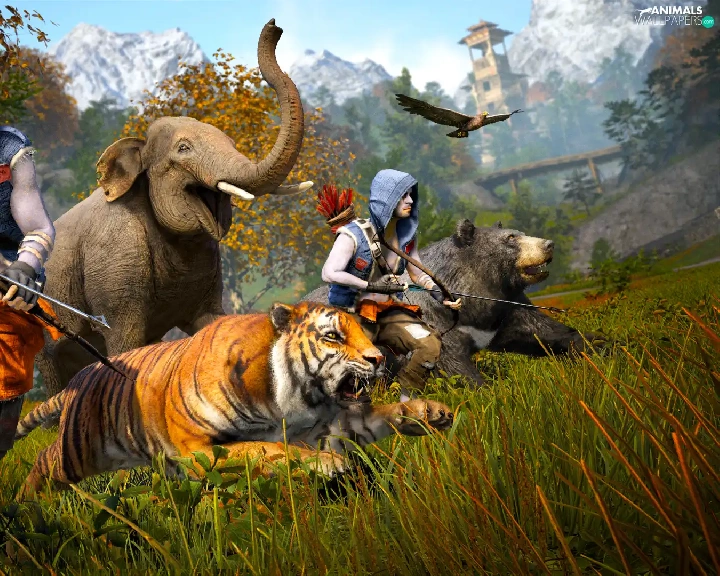 animals, Elephant, Characters, tiger, armed, Far Cry 4, game, Bear