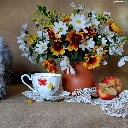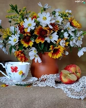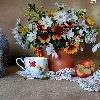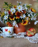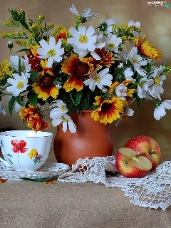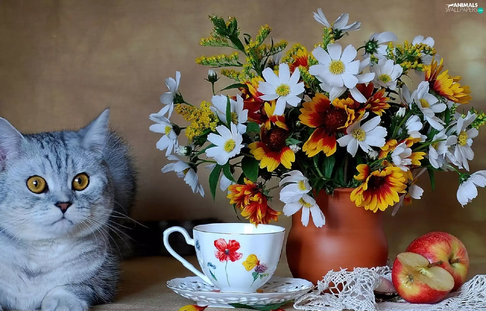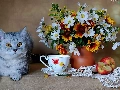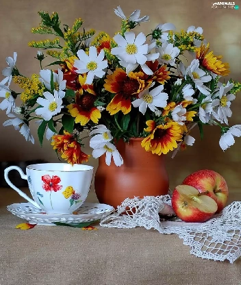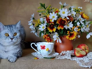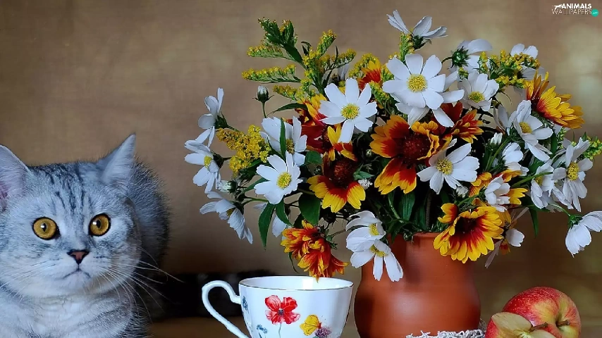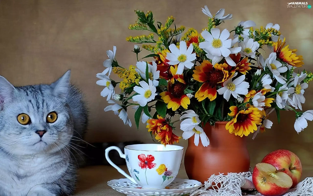 cup, Apple, Flowers, Vase, cat