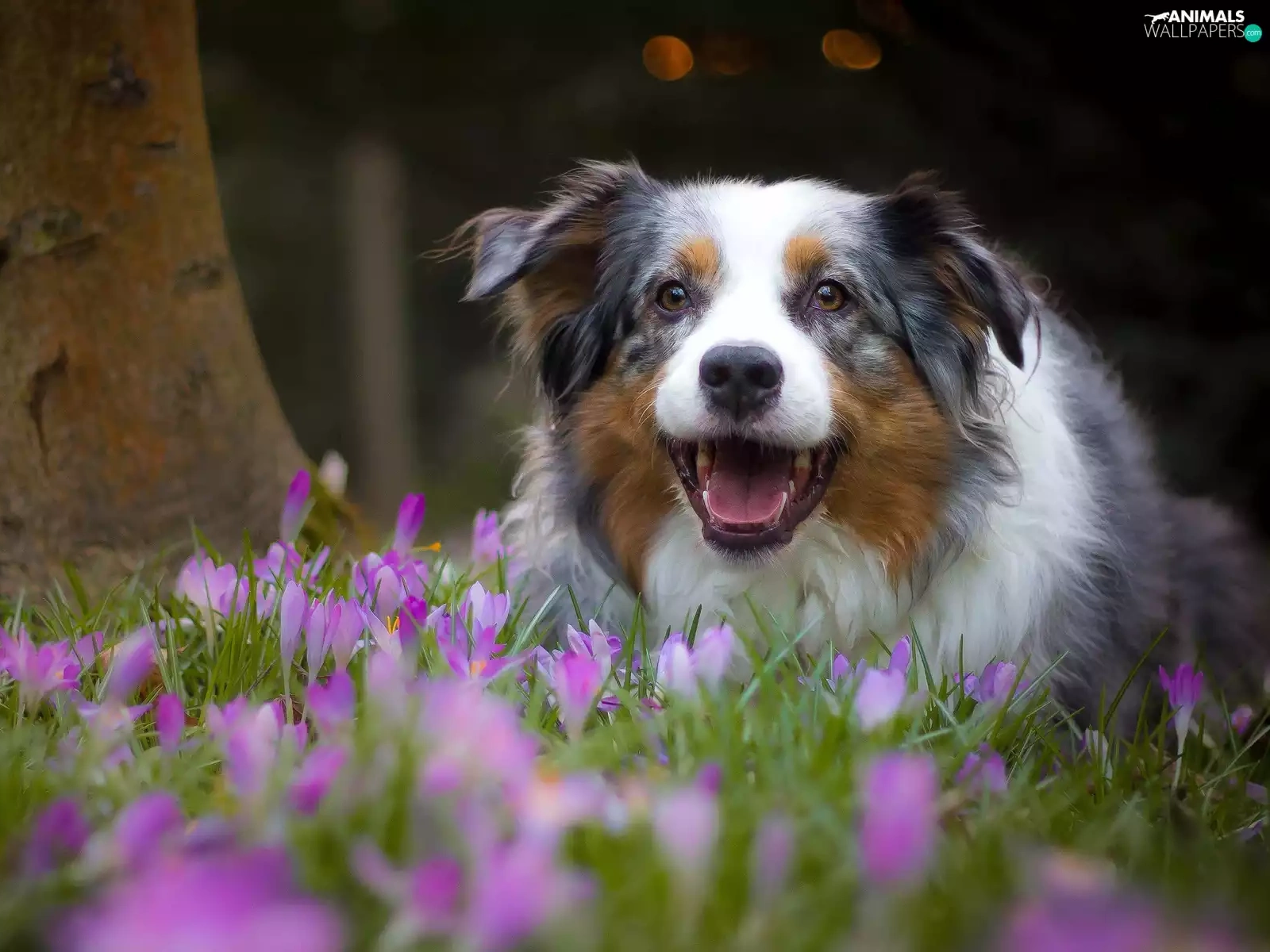Australian Shepherd, crocuses