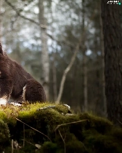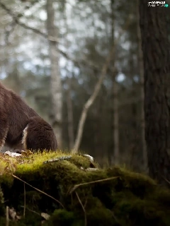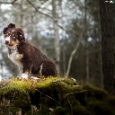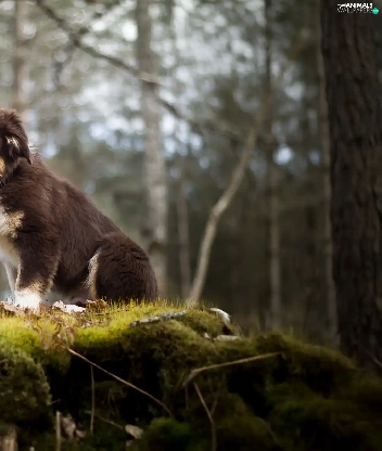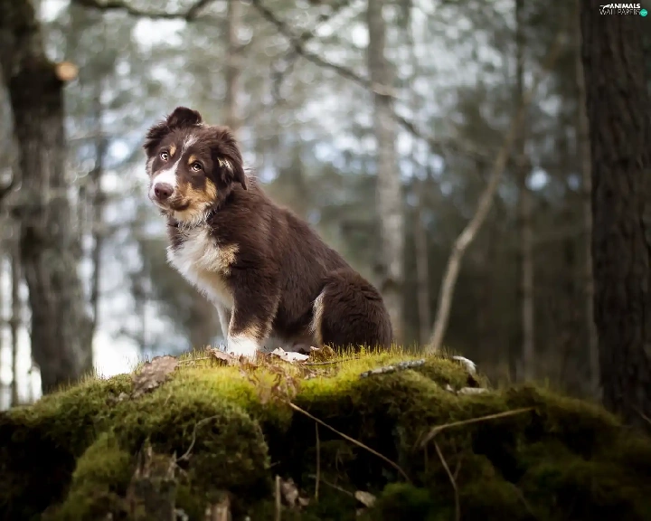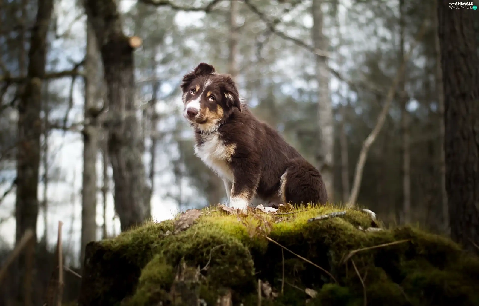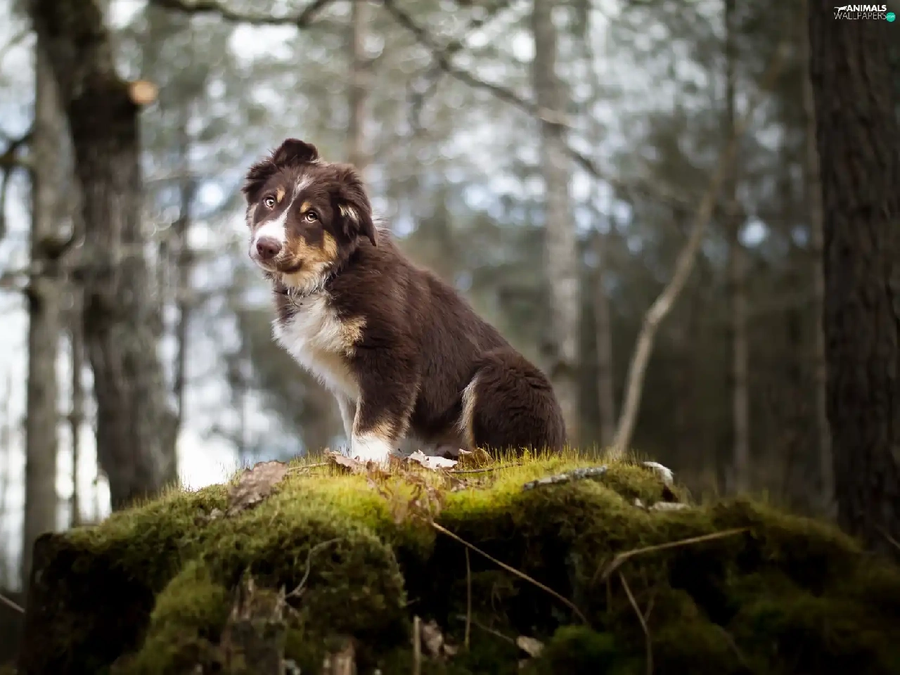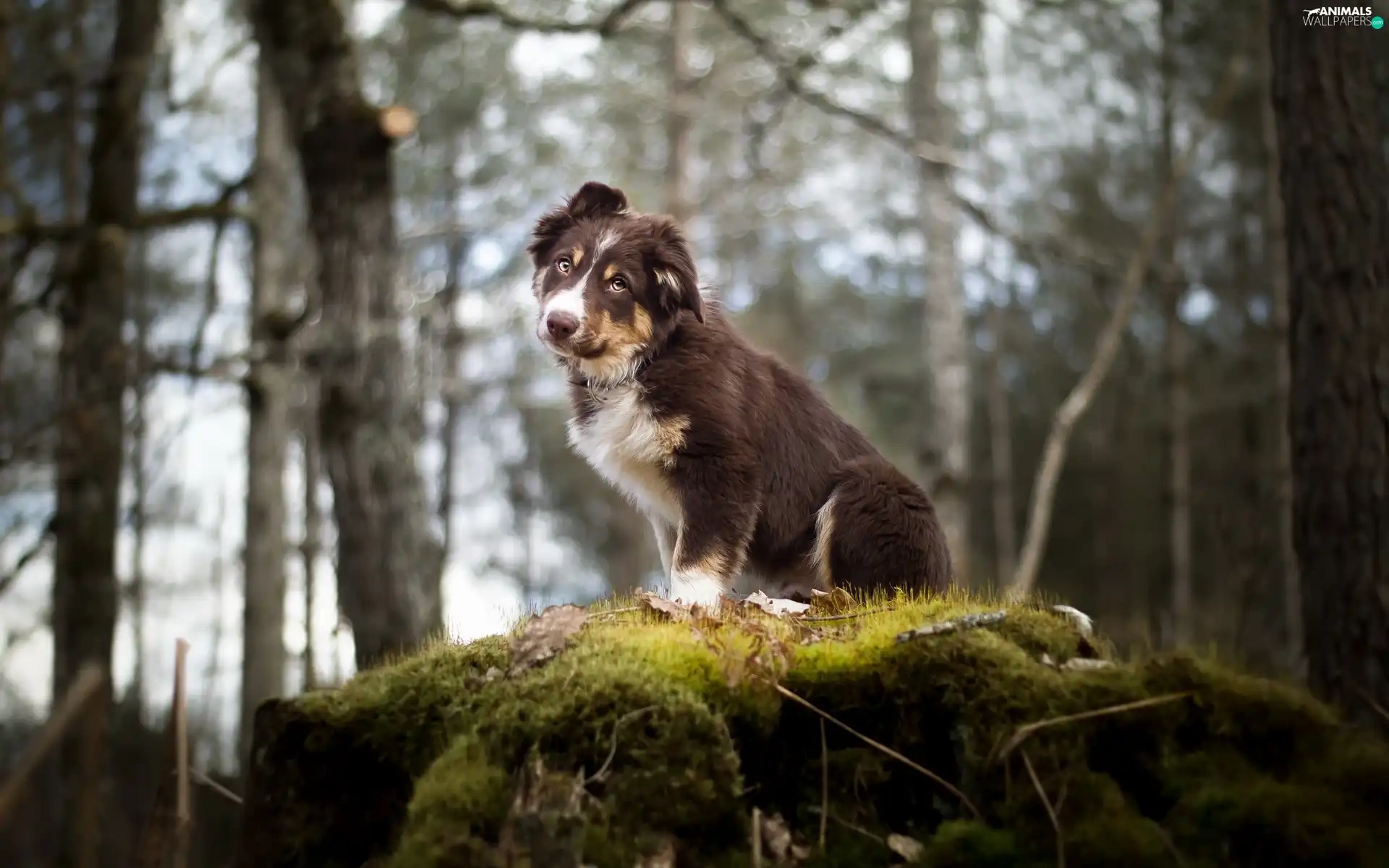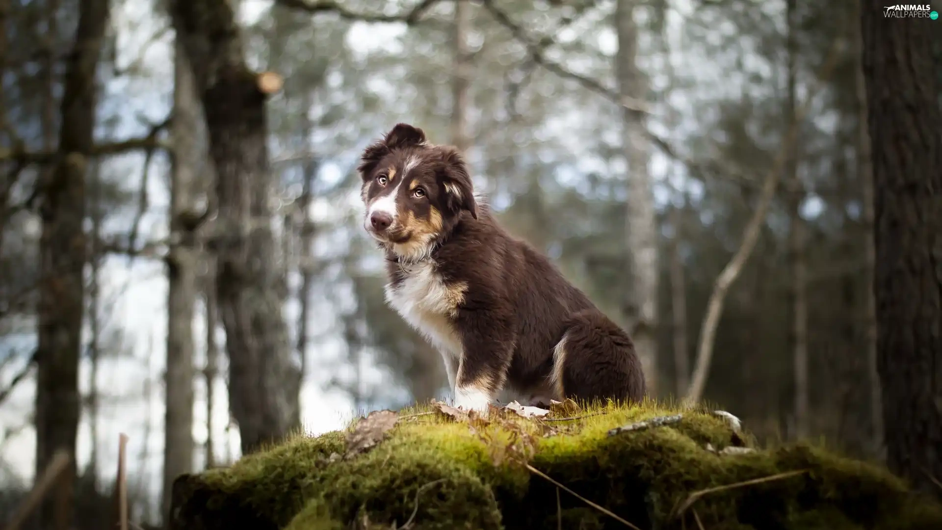 Australian Shepherd, The look, Bokeh, forest, Moss, Puppy, dog, scarp