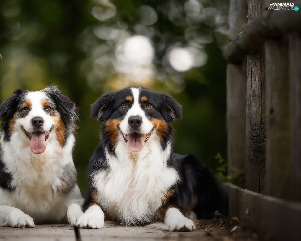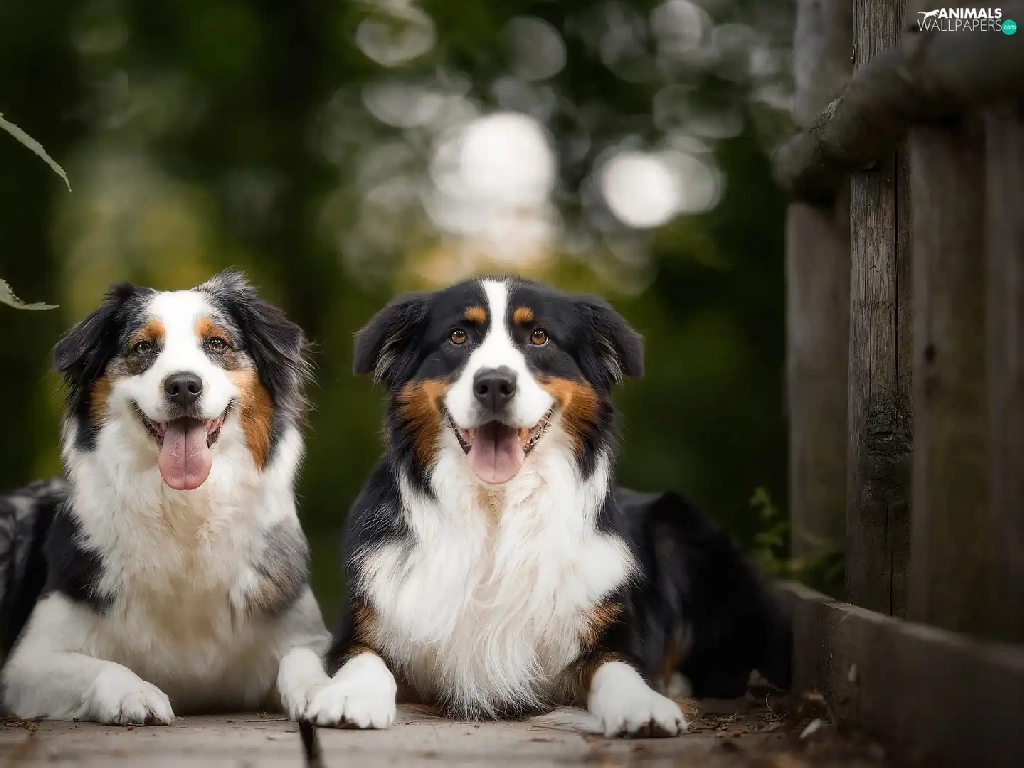 footbridge, nettle, Dogs, Australian Shepherds, Two cars