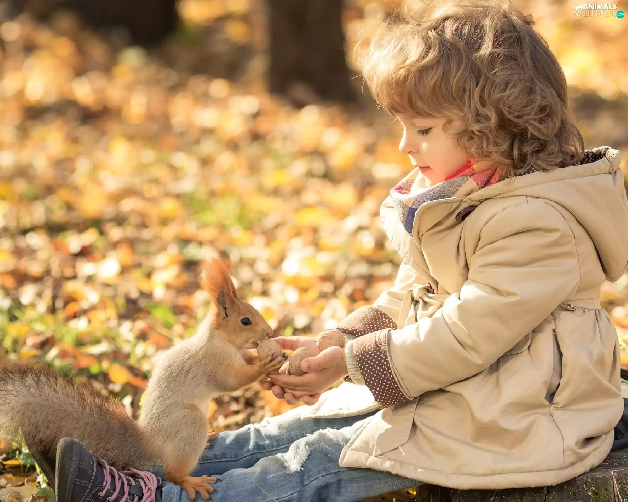Leaf, autumn, squirrel, Park, girl