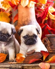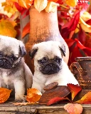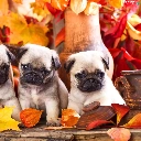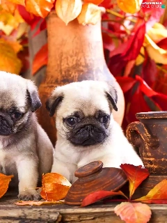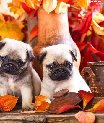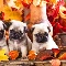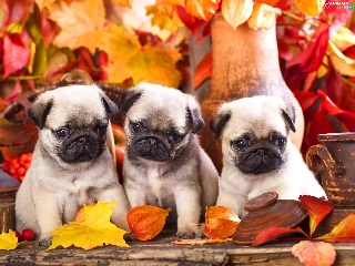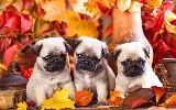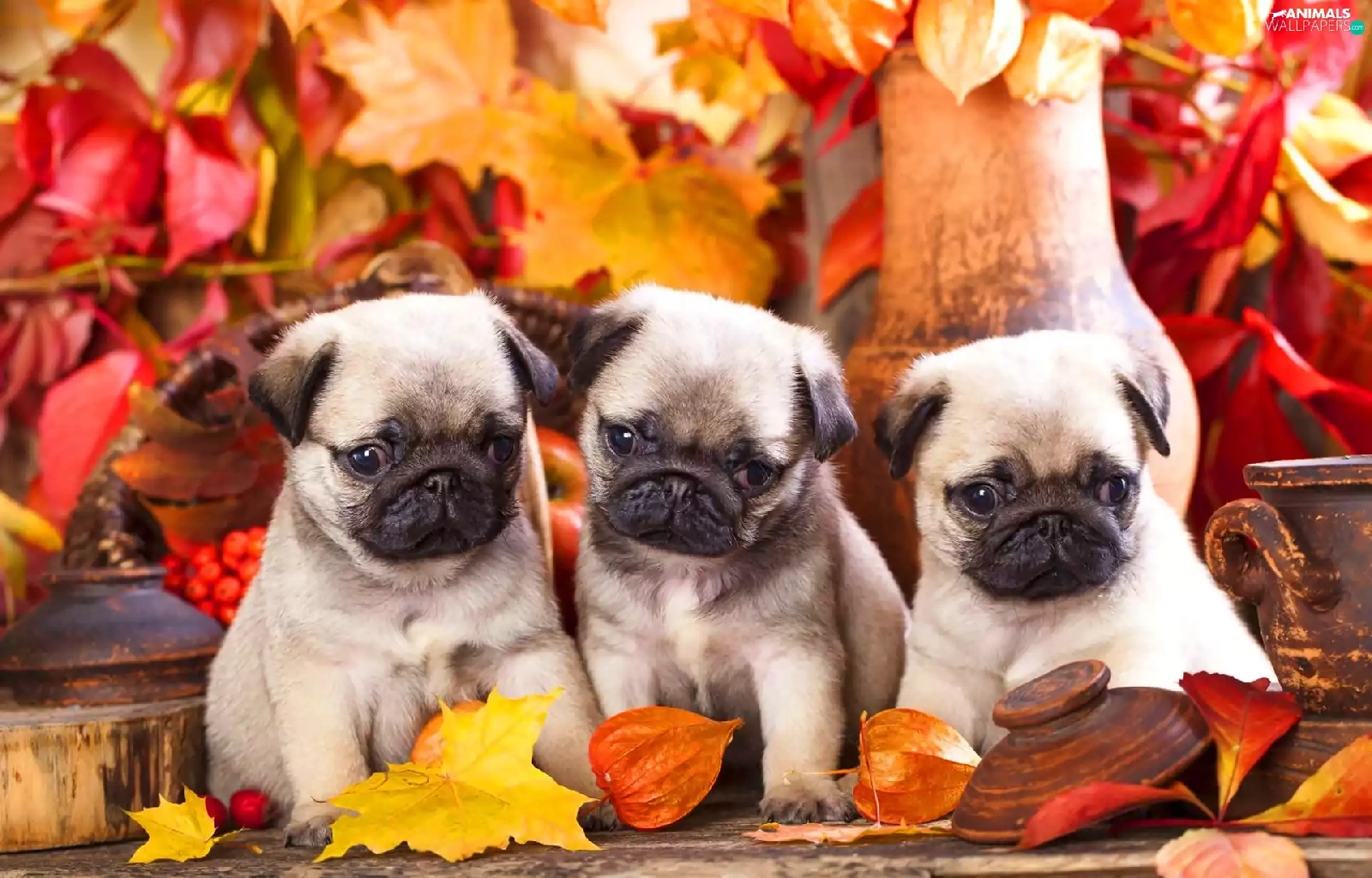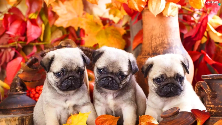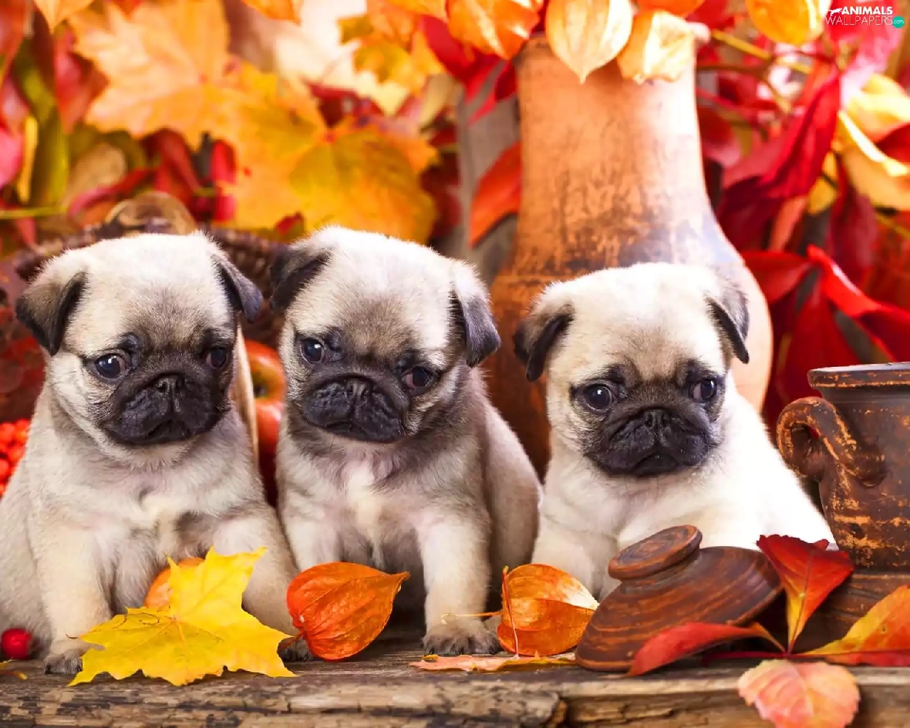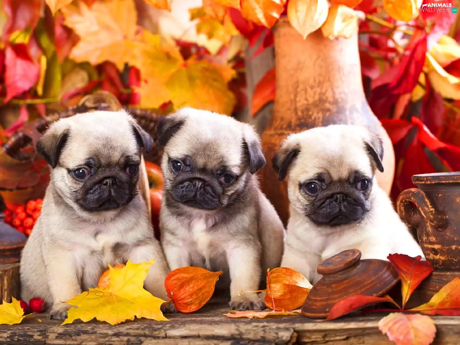 Puppies, Three, Leaf, autumn, pugs, sweet