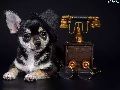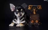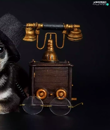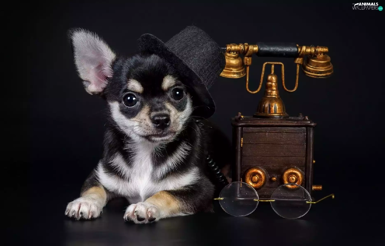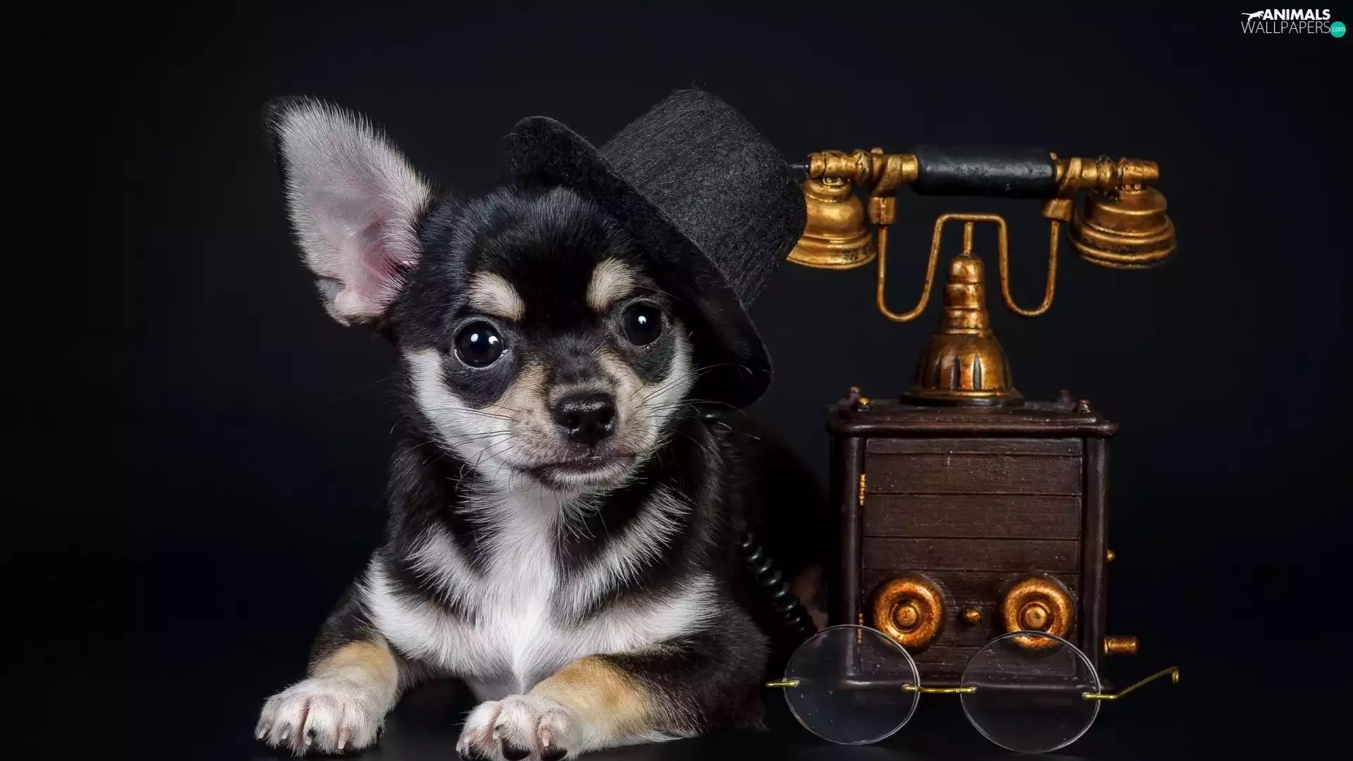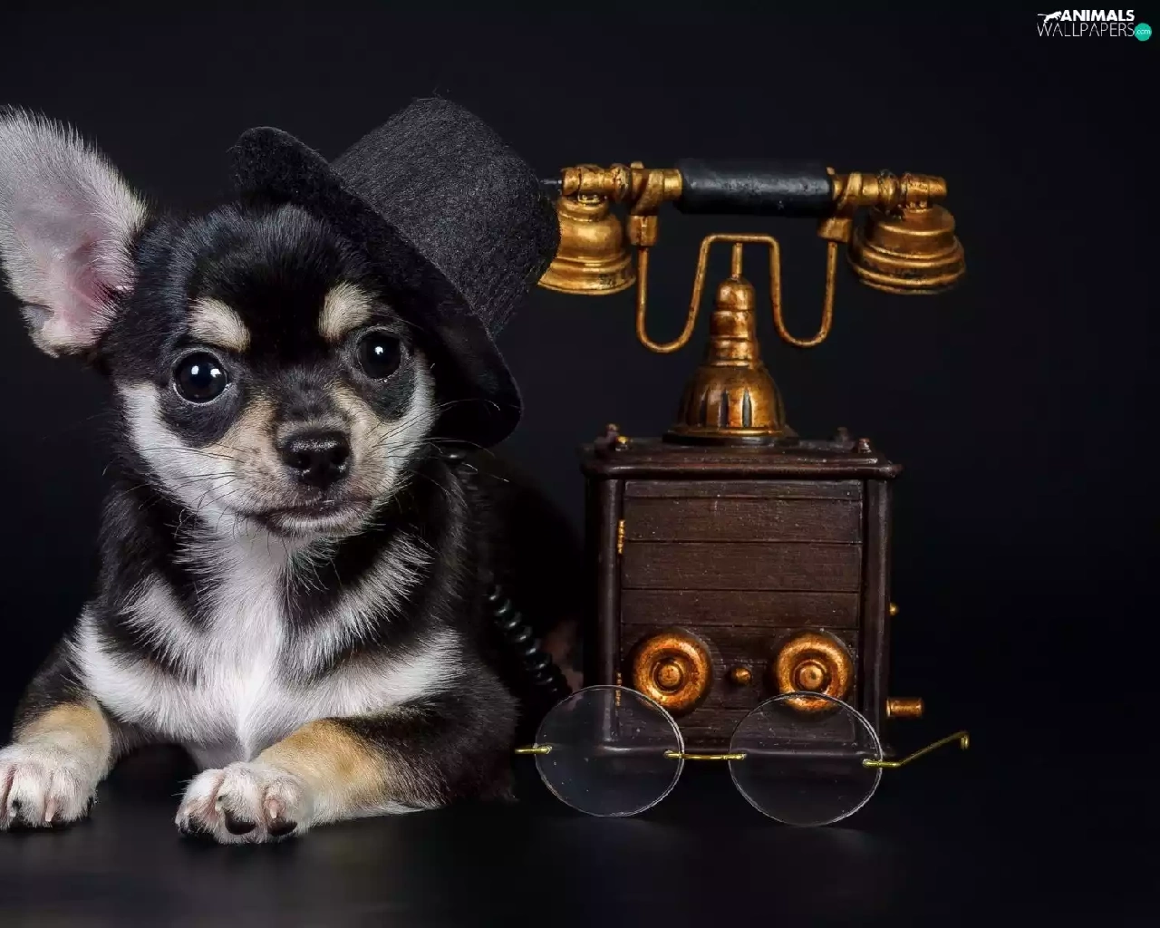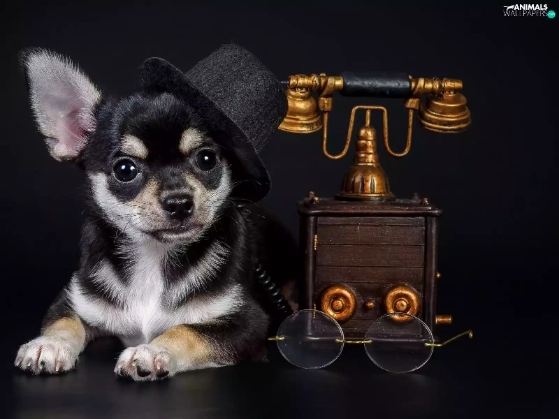 bowler, Chihuahua, Glasses, Hat, dog, Telephone, Dark Background