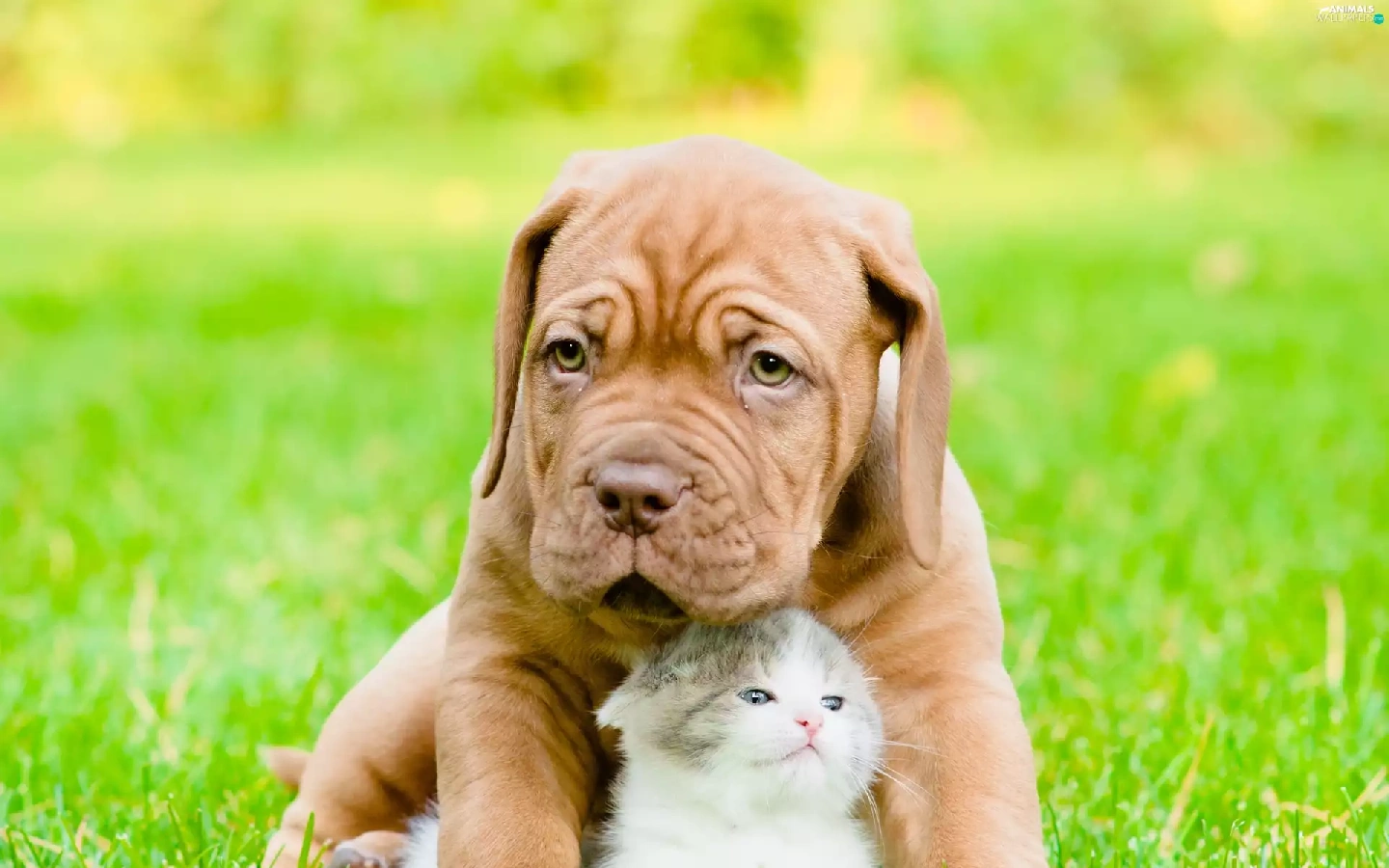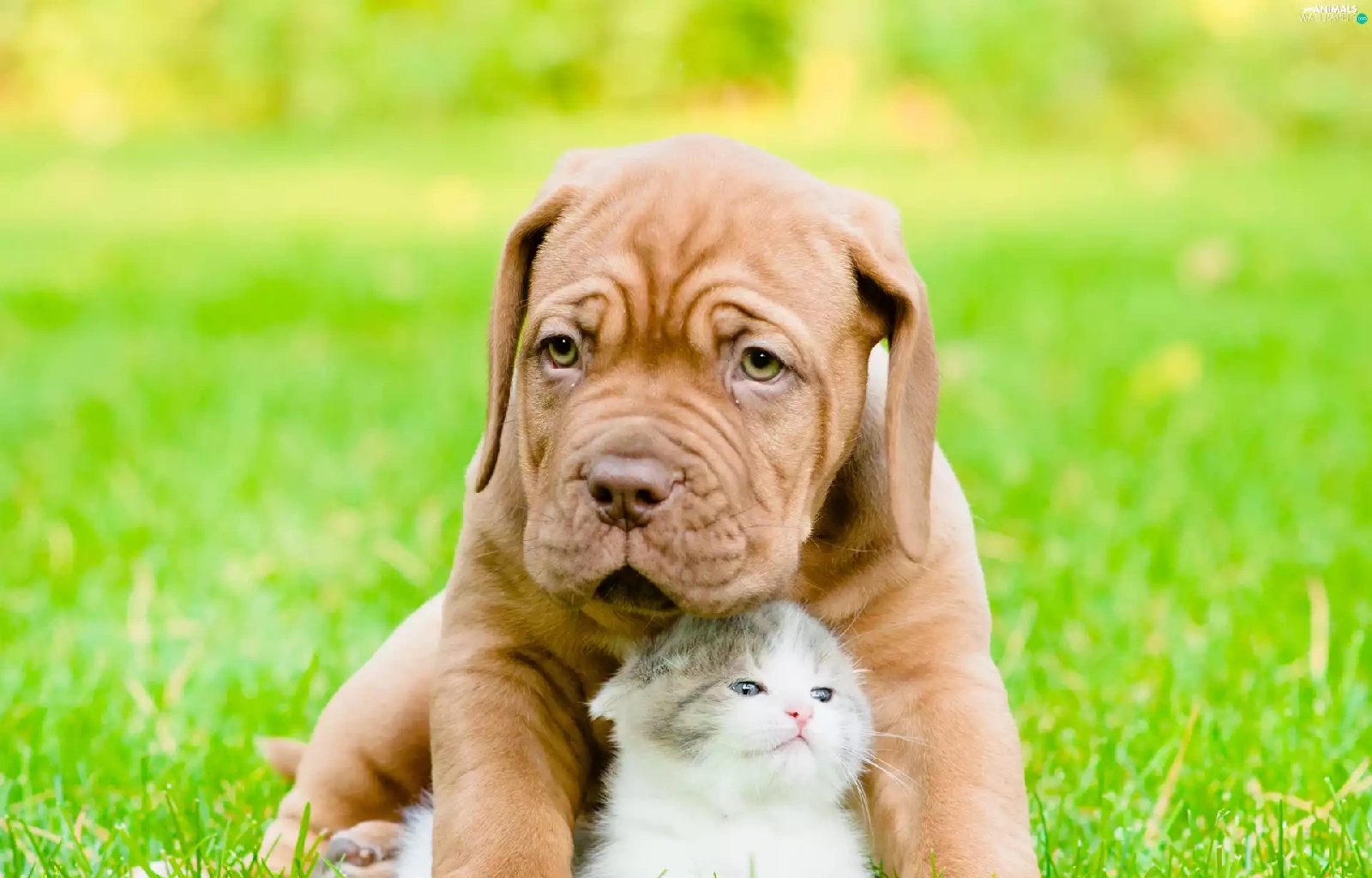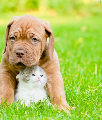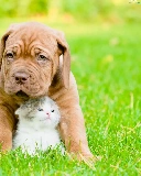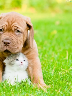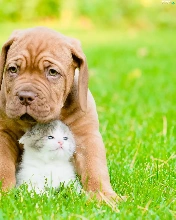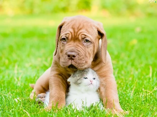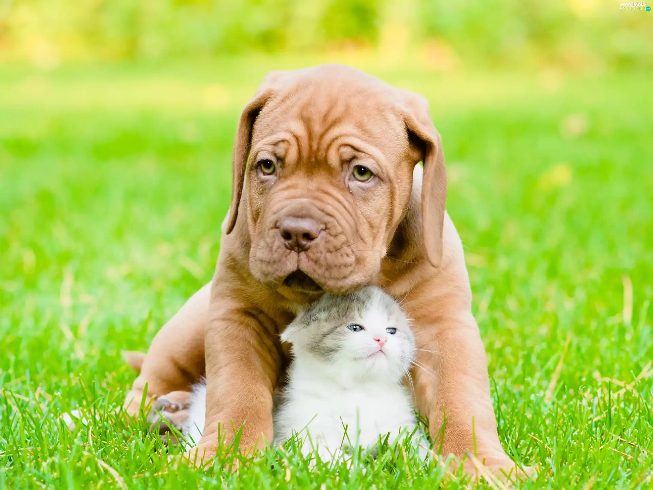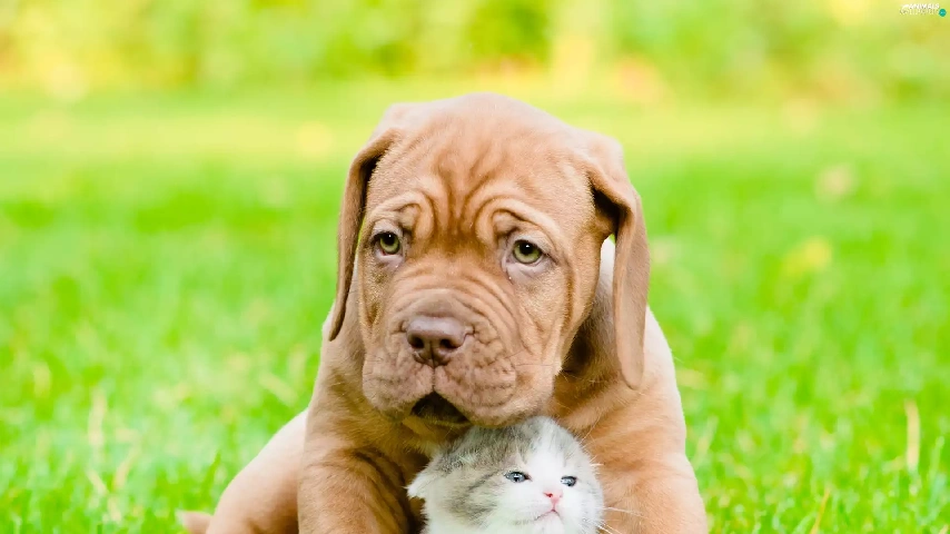 Puppy, small, fuzzy, background, hugging, kitten