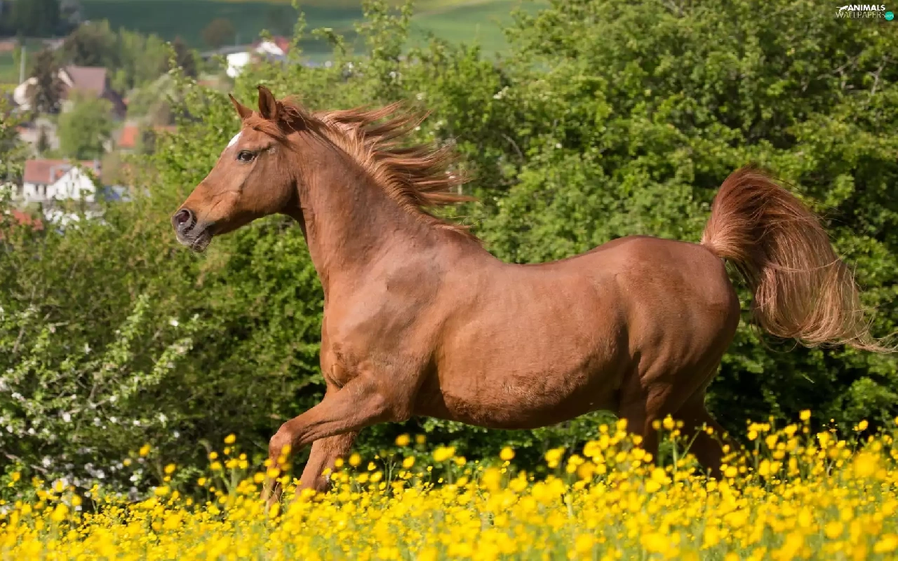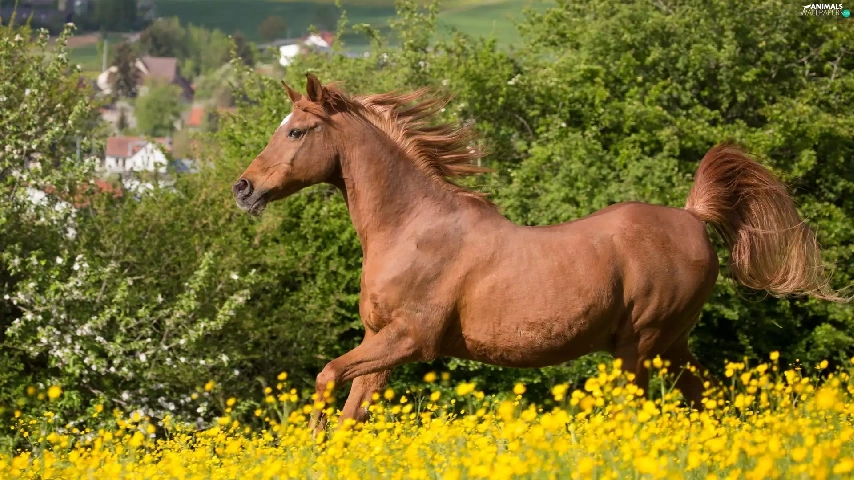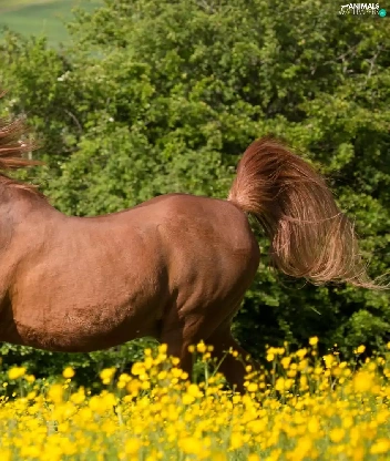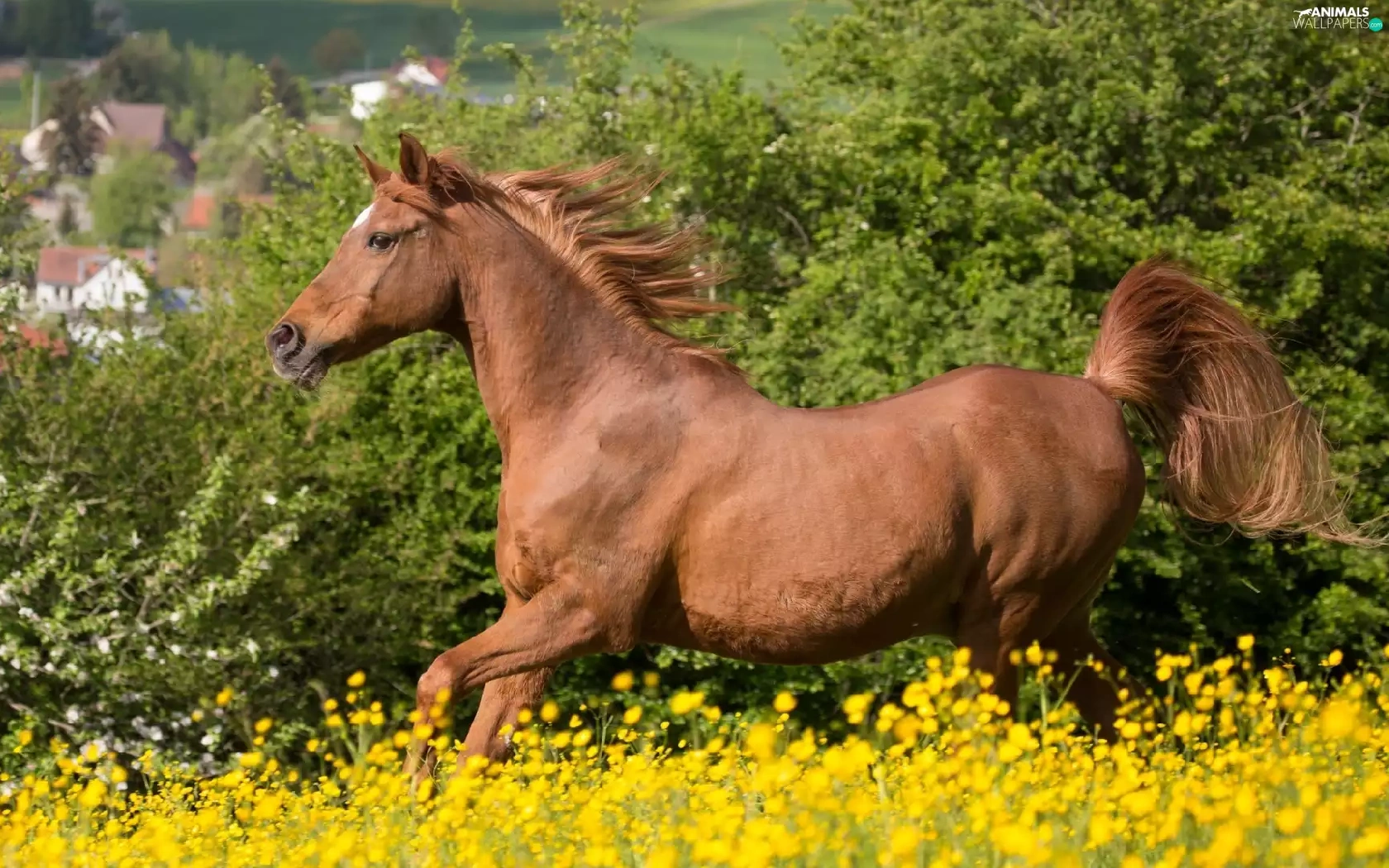 Yellow, Horse, fuzzy, background, Flowers, Meadow