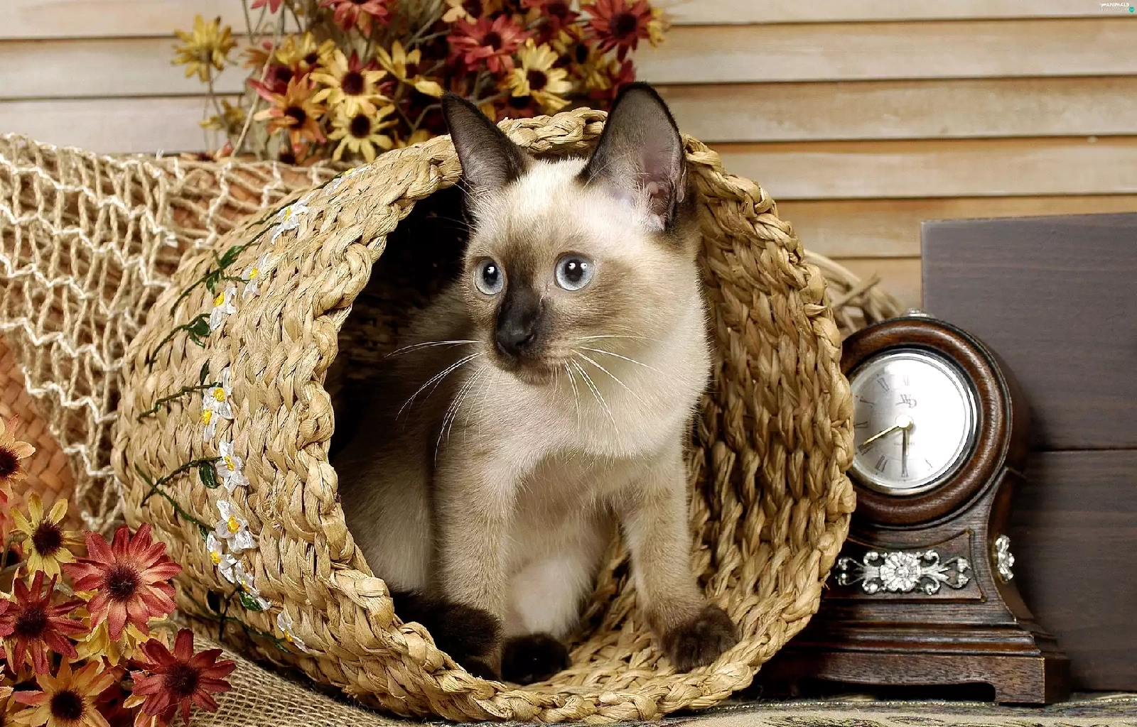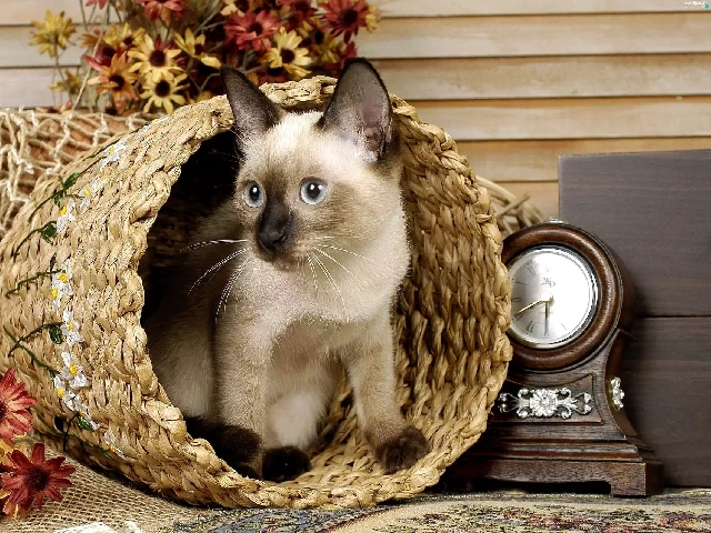 cat, Clock, Flowers, basket