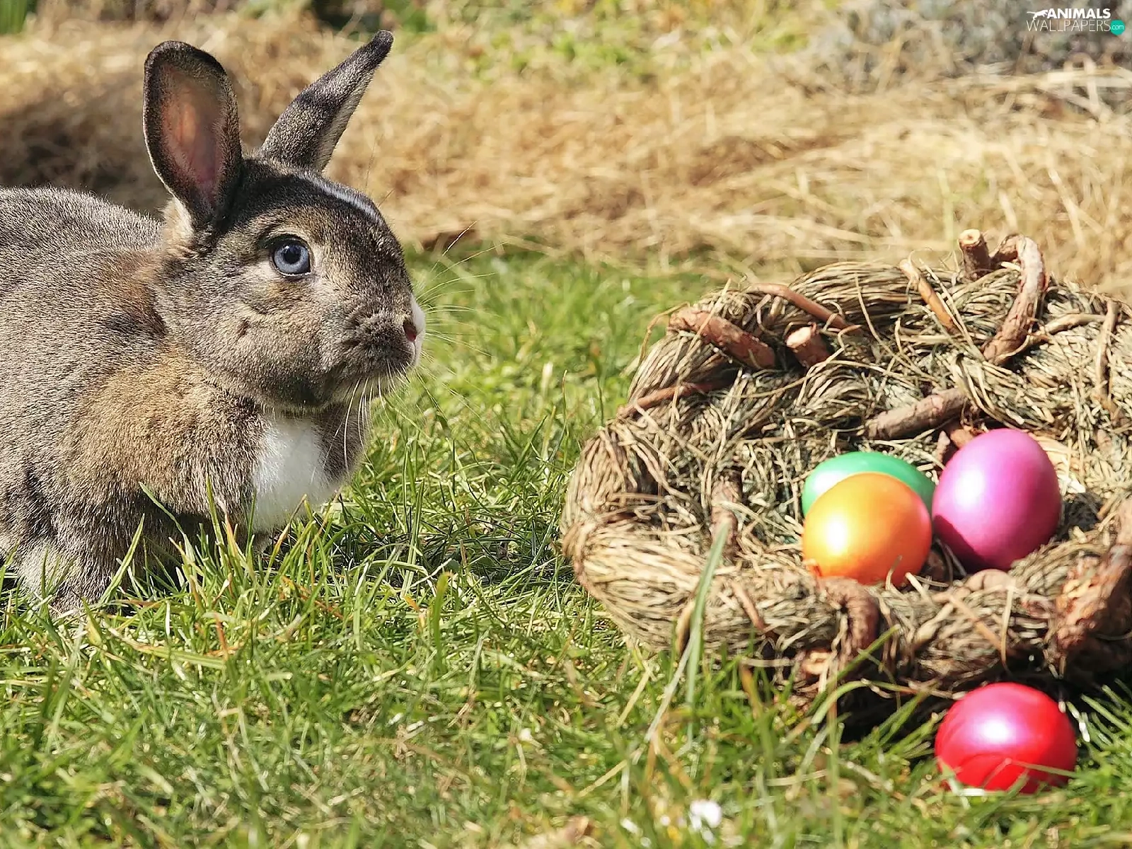 Rabbit, basket, Painted eggs, grass