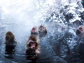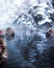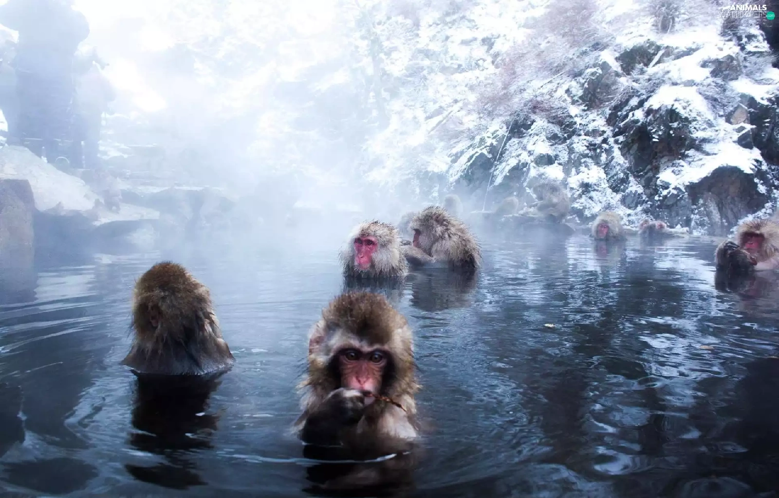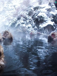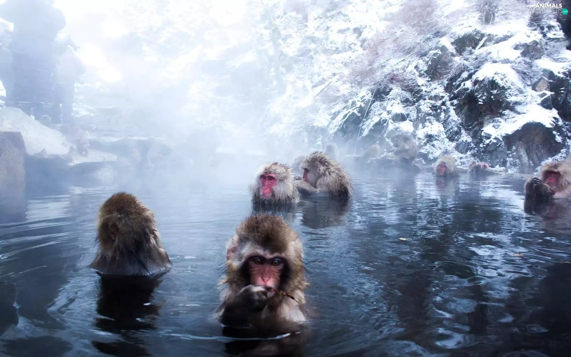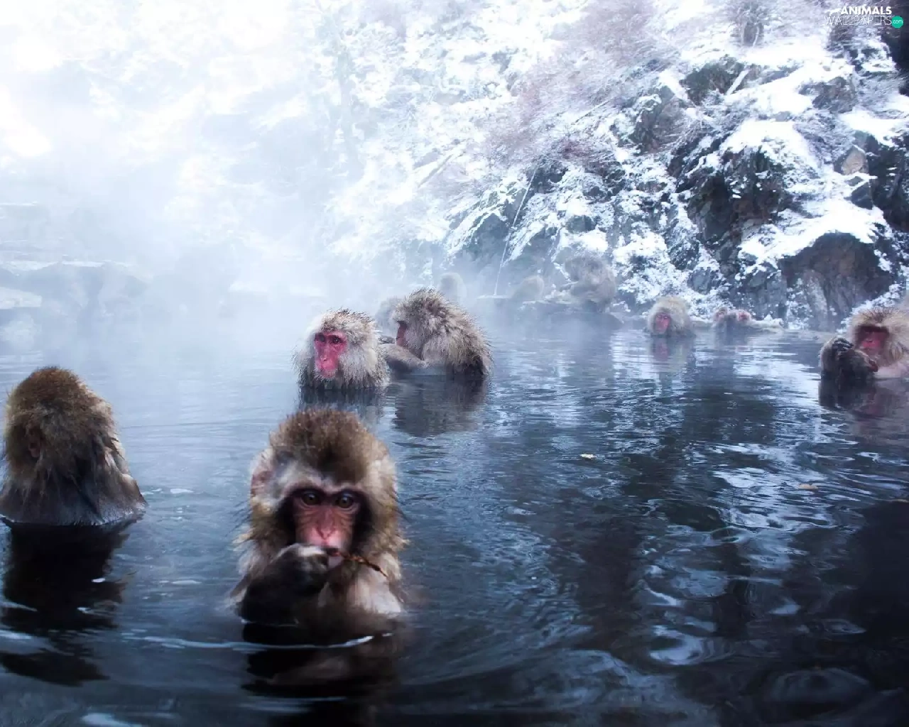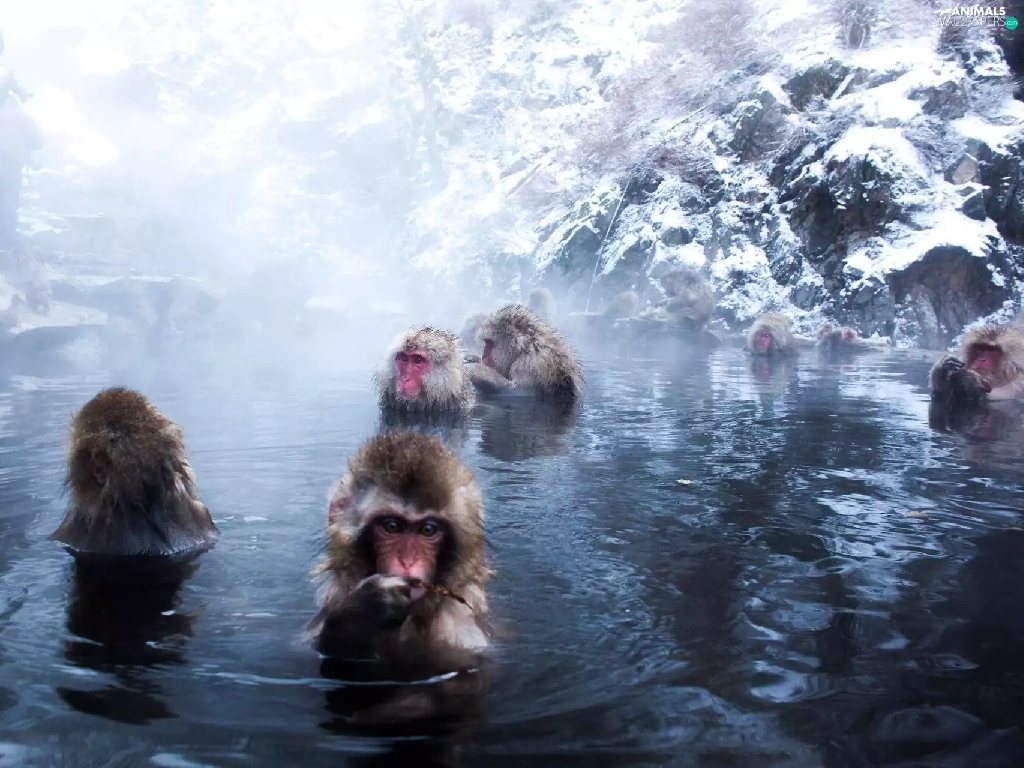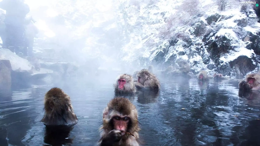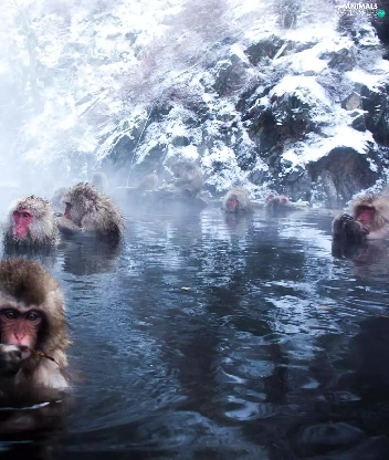 monkeys, water, rocks, bath