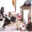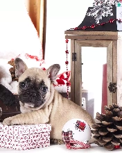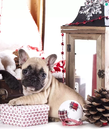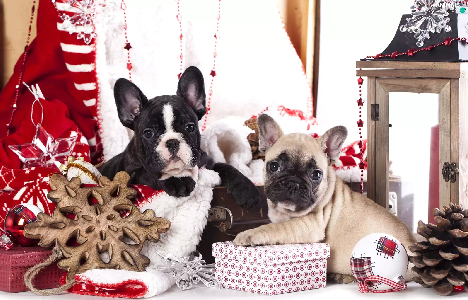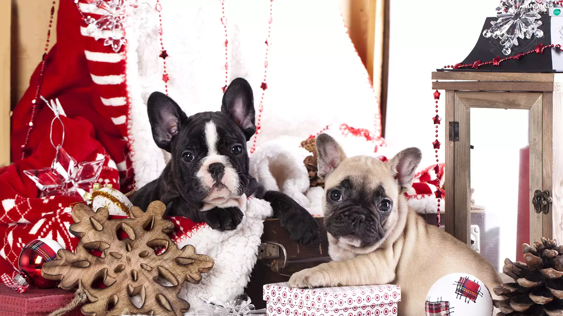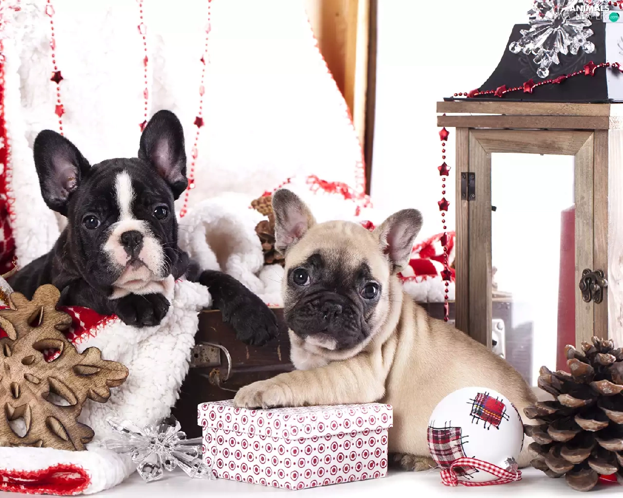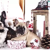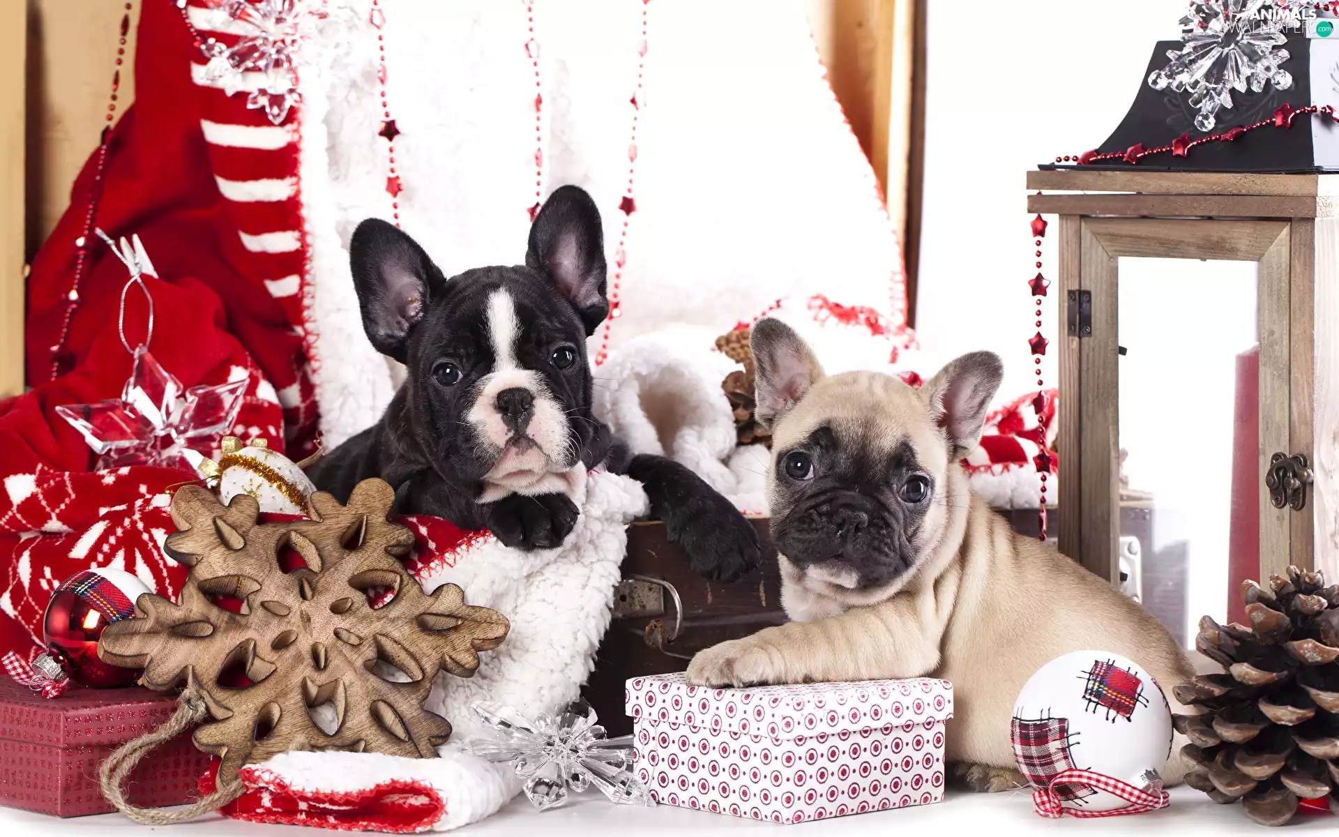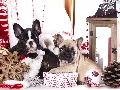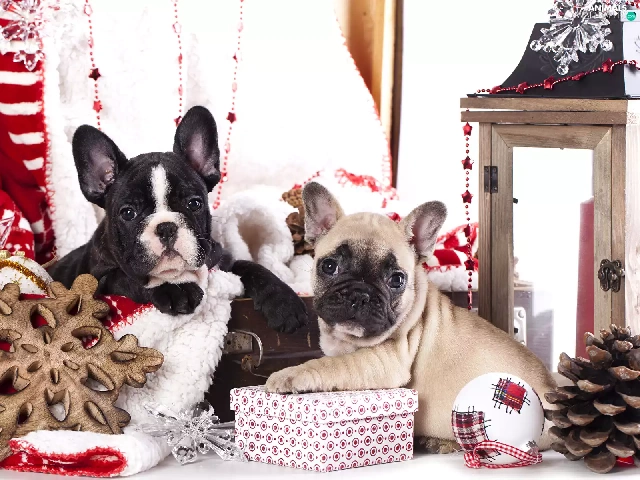 Dogs, Two cars, puppies, French Bulldogs, bauble, lantern, cones, gifts, Stars