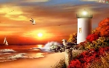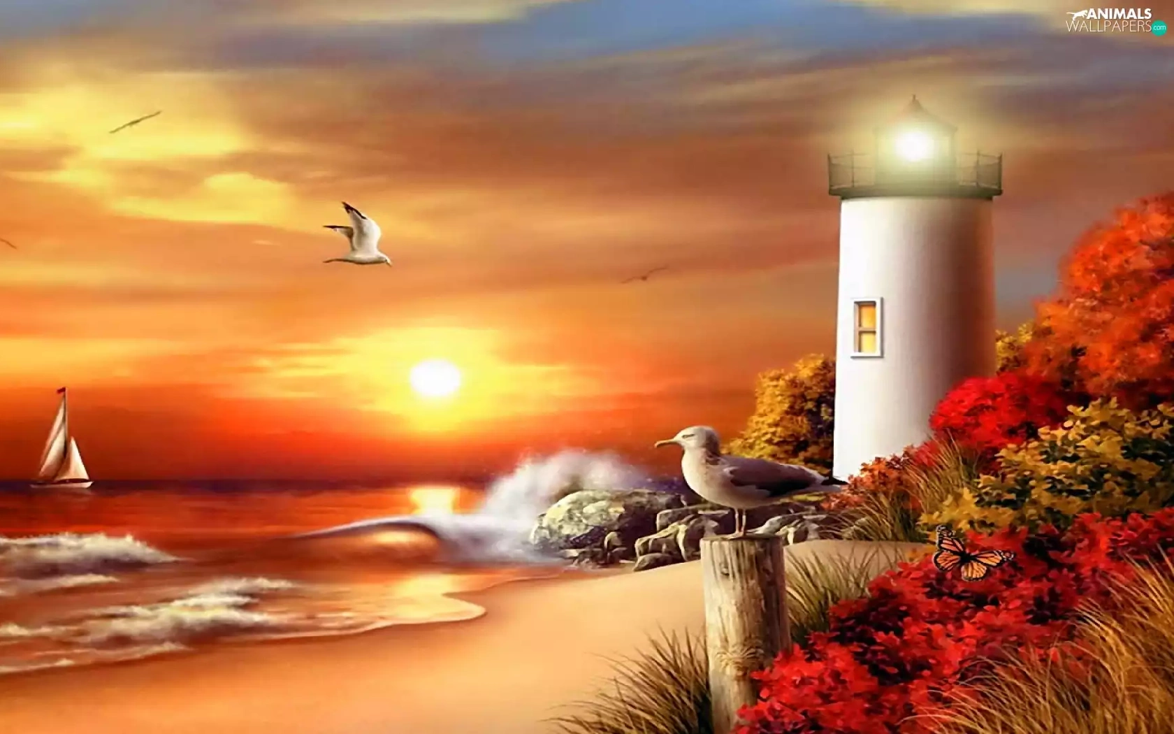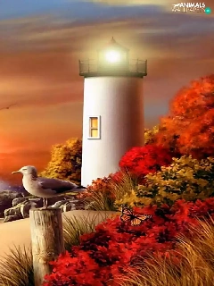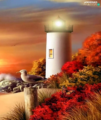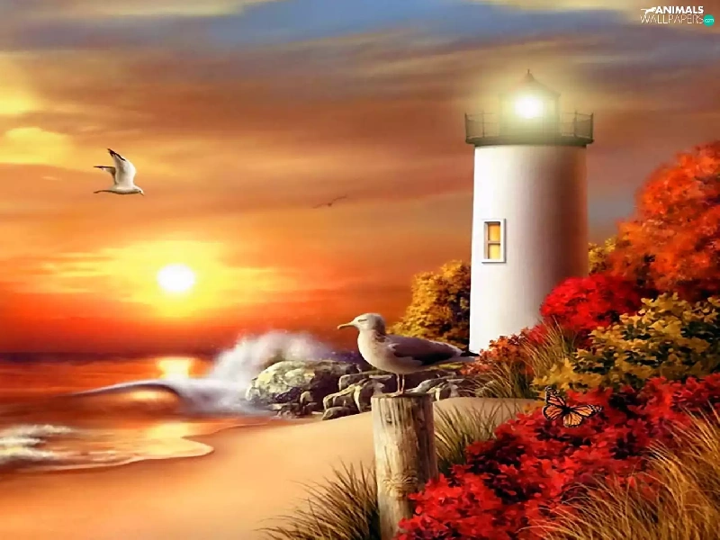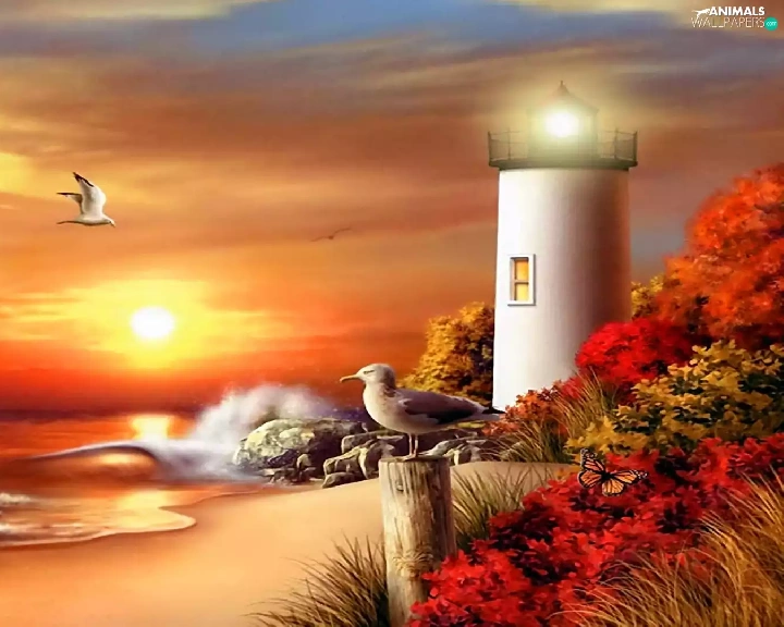 sea, maritime, west, Beaches, Lighthouse, gulls, sun