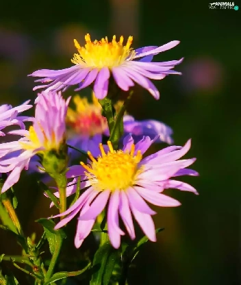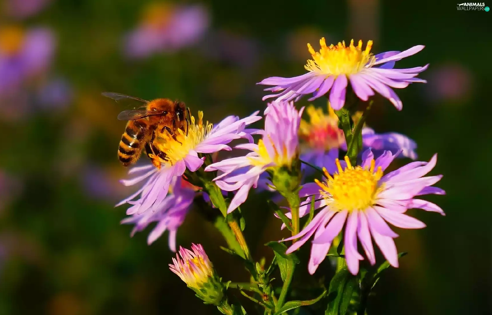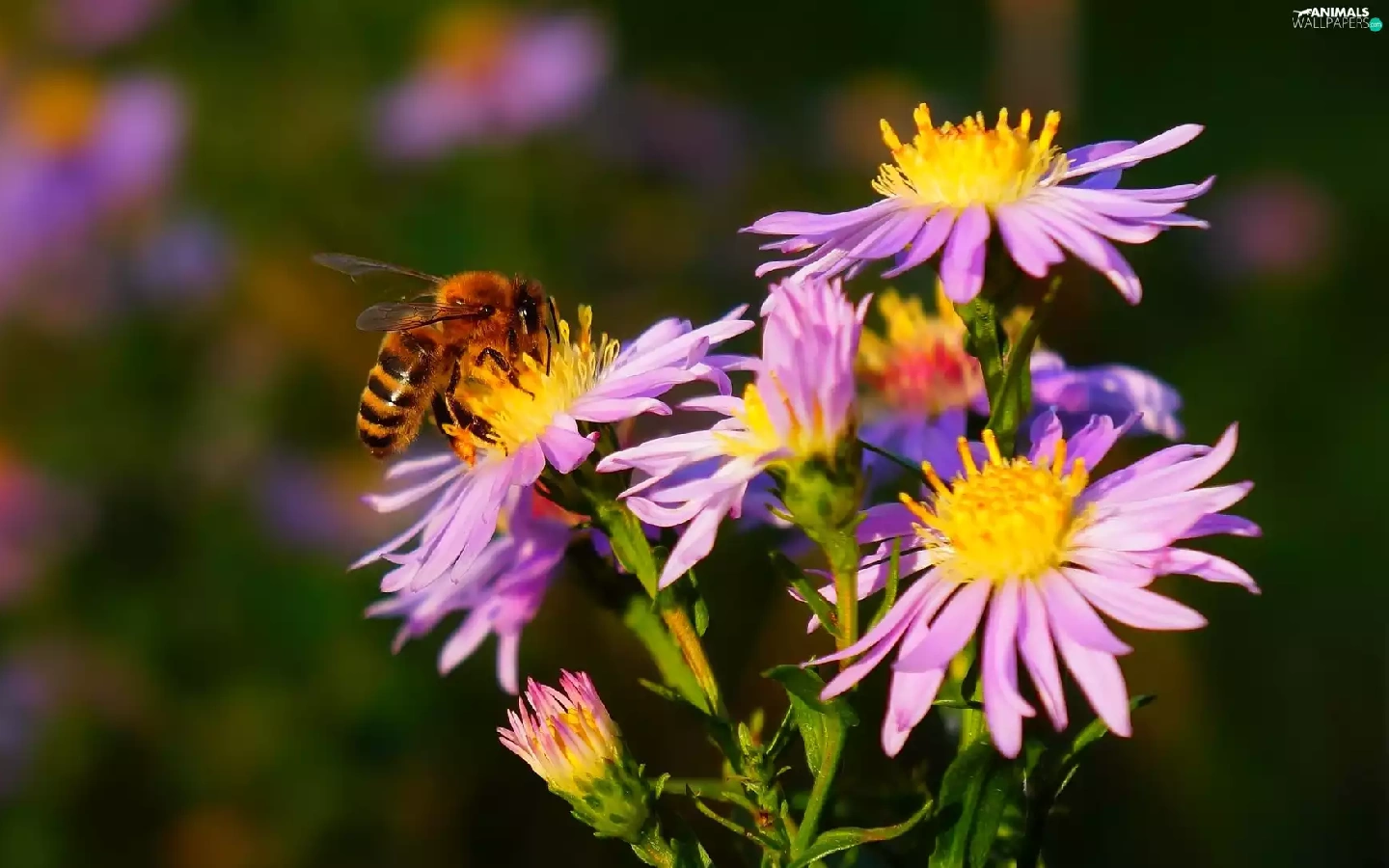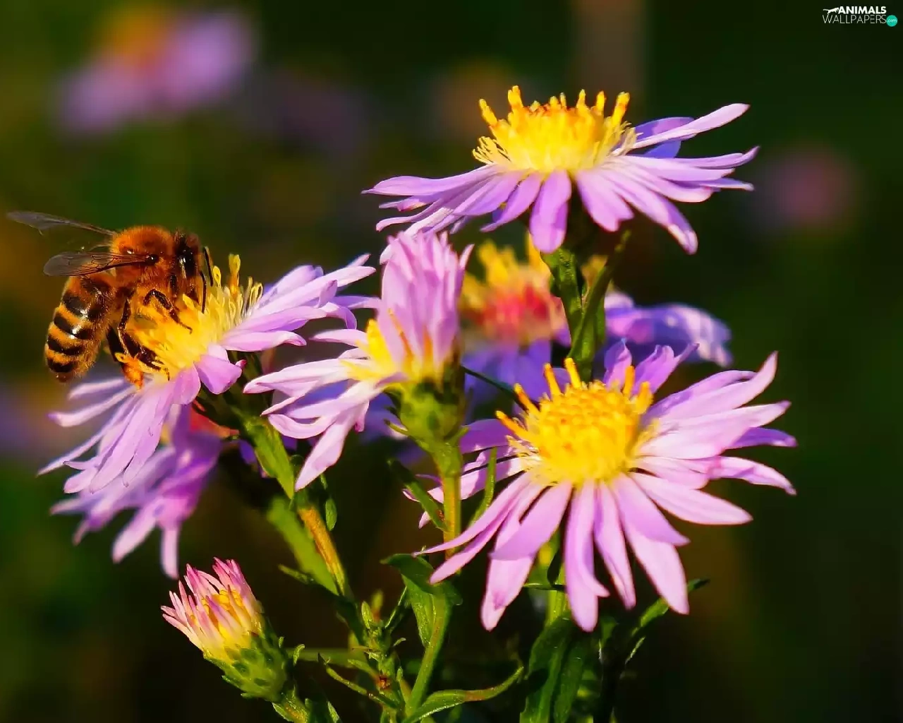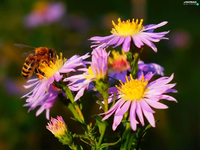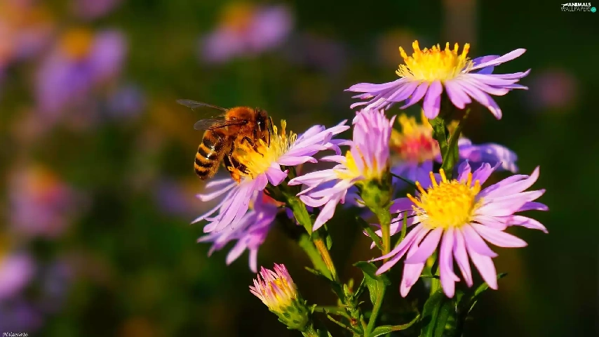 Aster, bee, purple, Autumn, Flowers