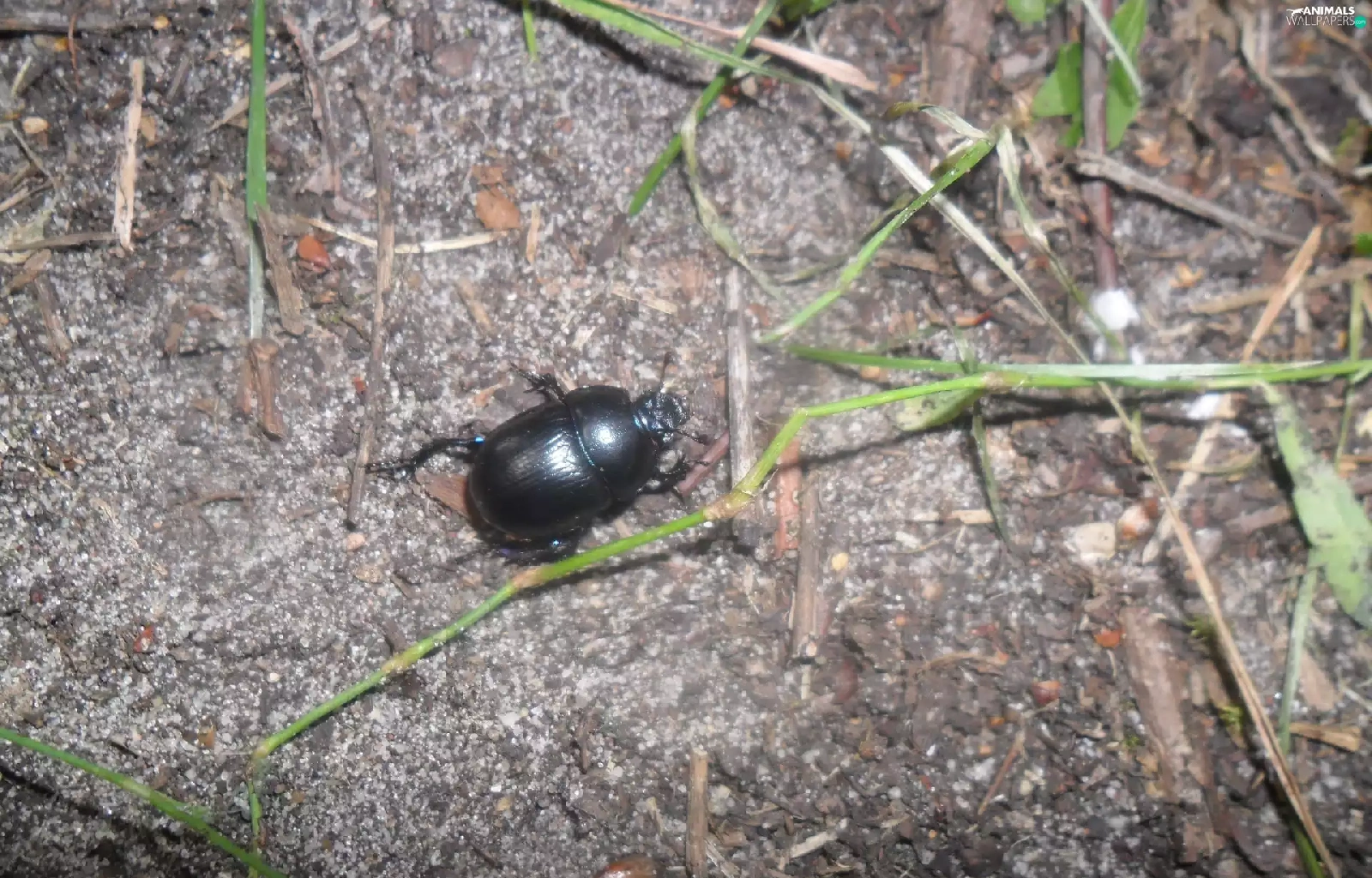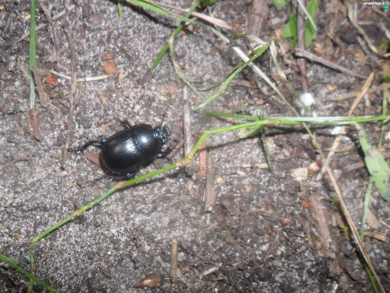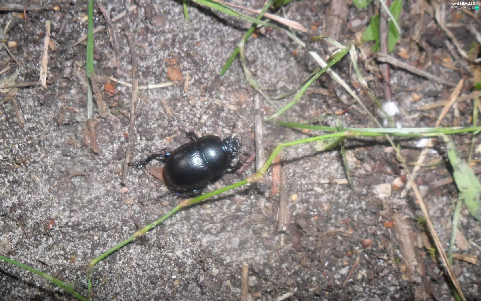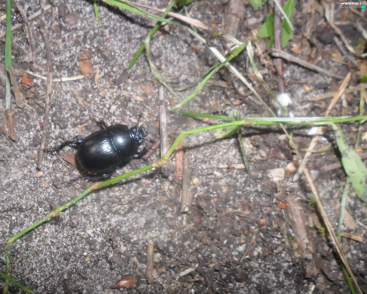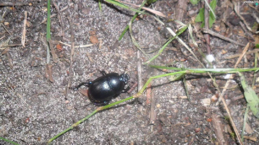 Black, grass, stick, beetle