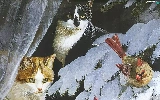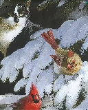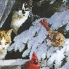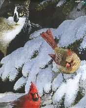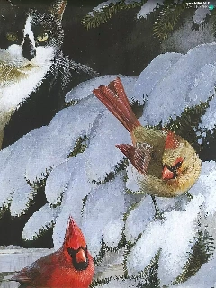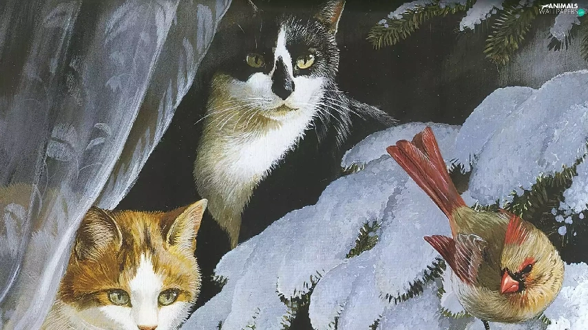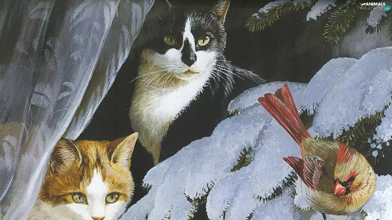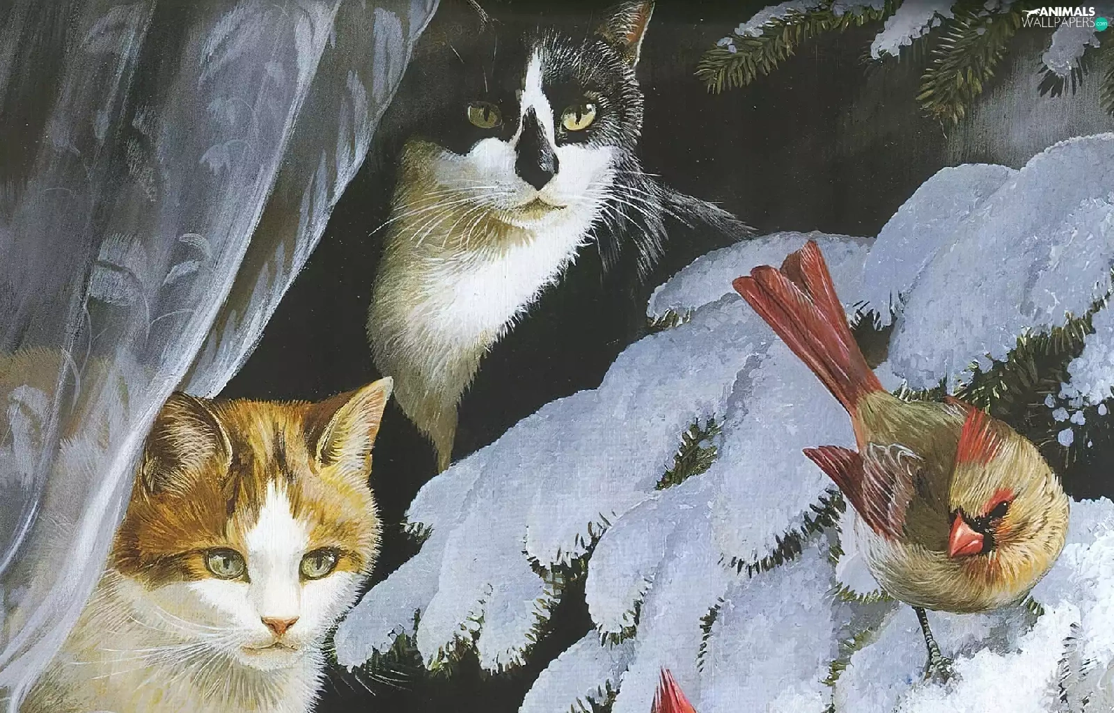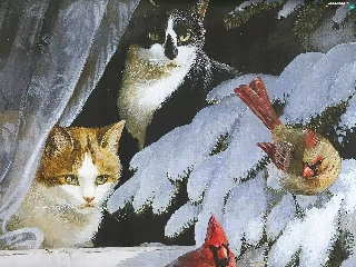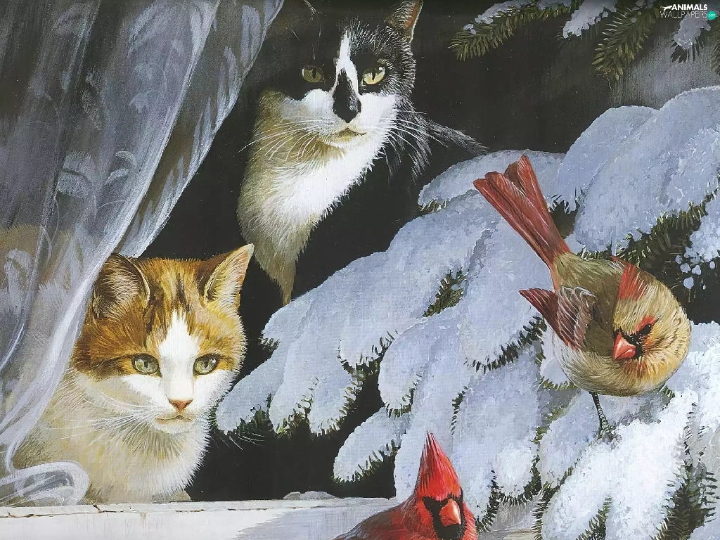 behind glass, Two cars, birds, Cardinals, Two cars, cats