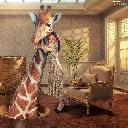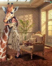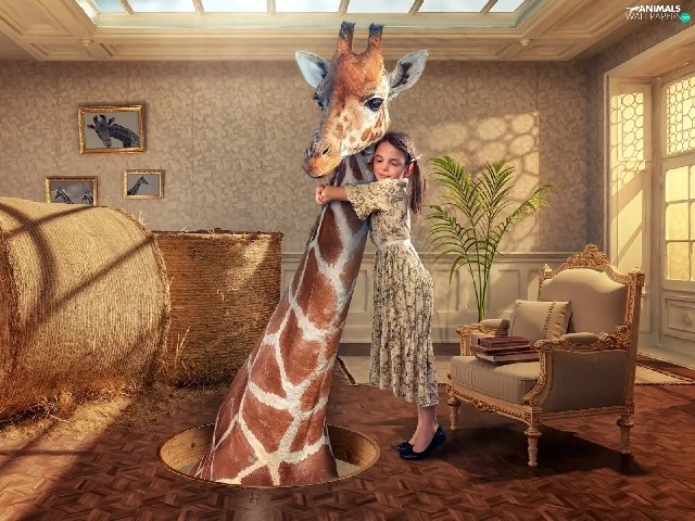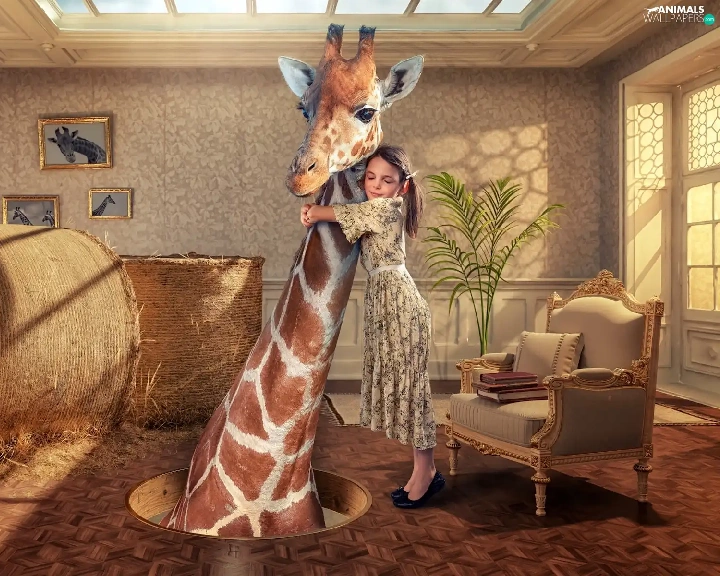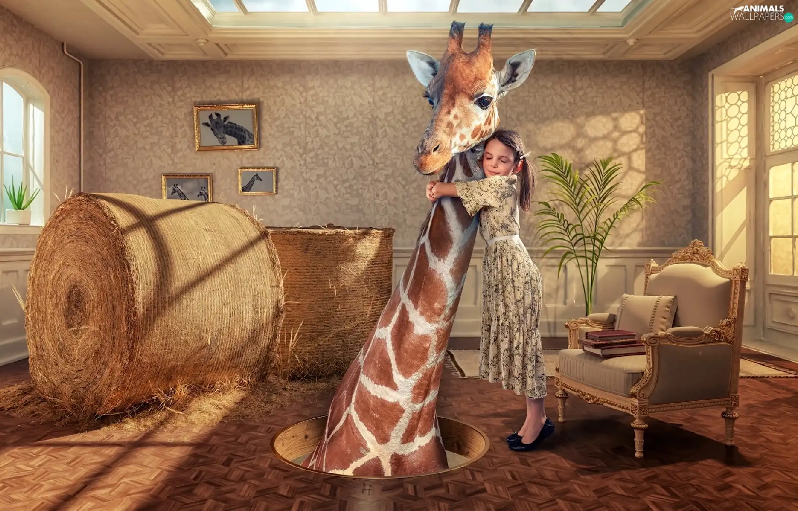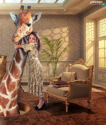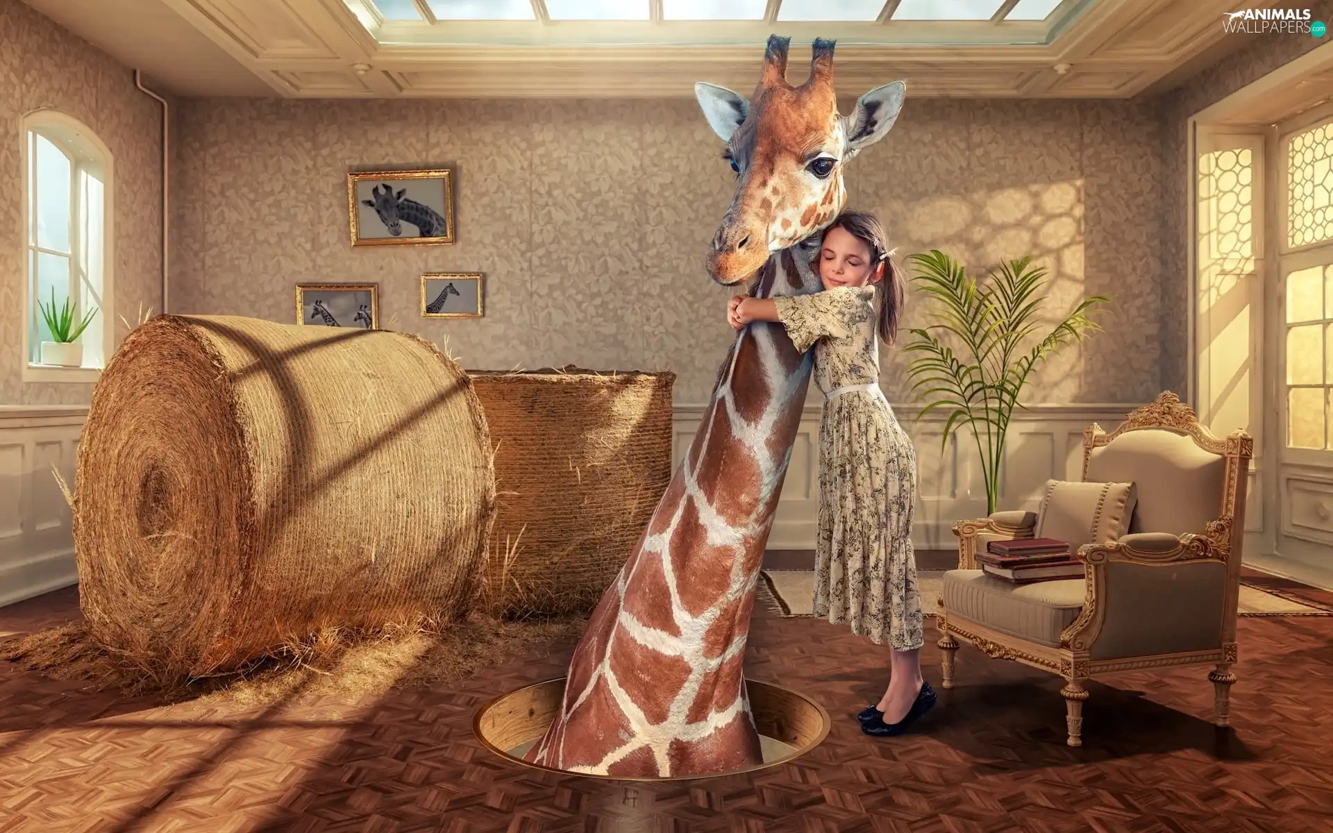interior, girl, Armchair, giraffe, straw, Room, Funny, Bele