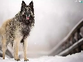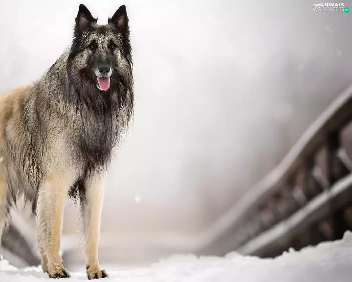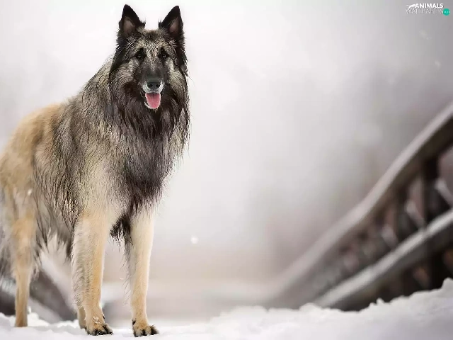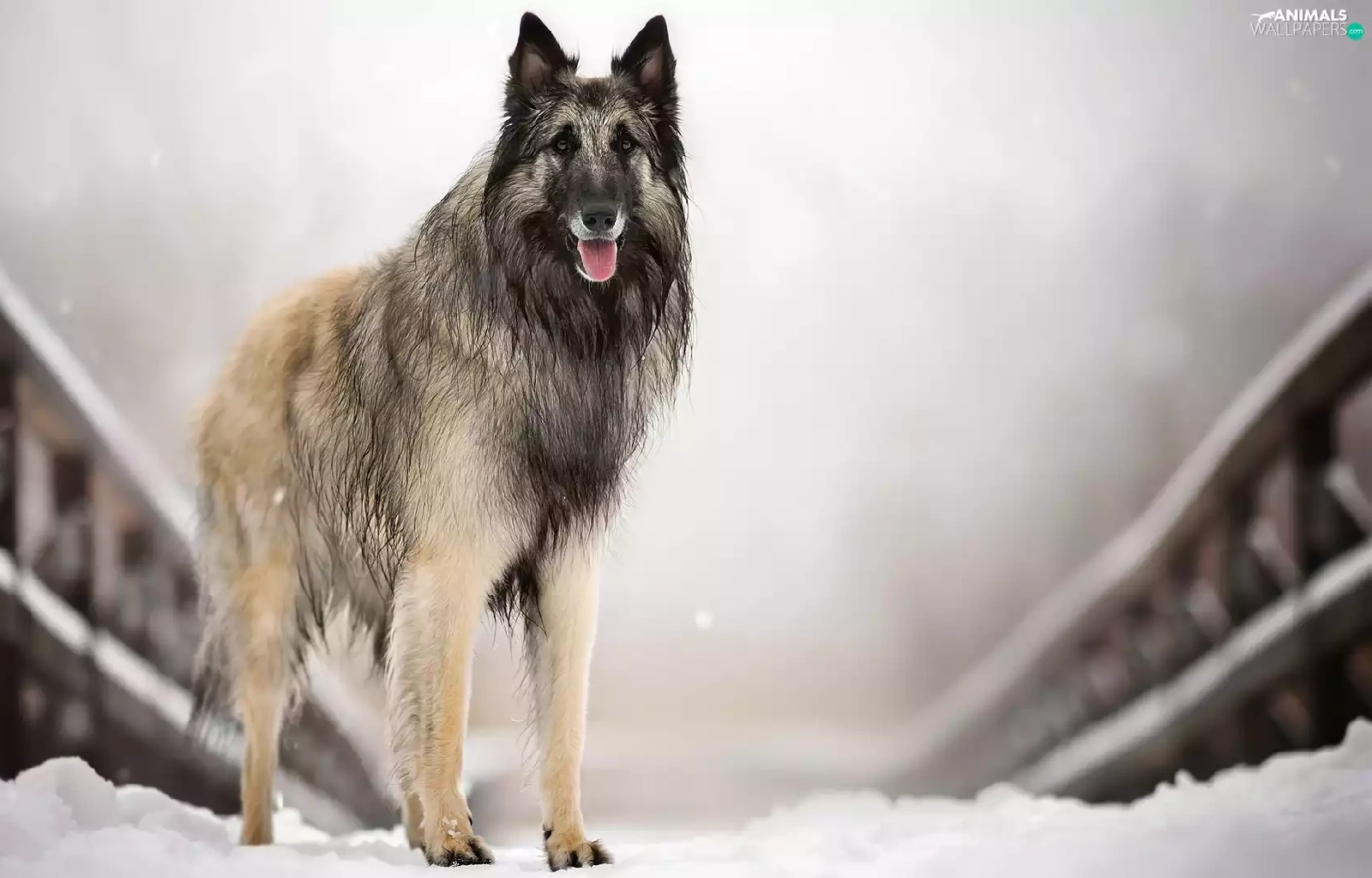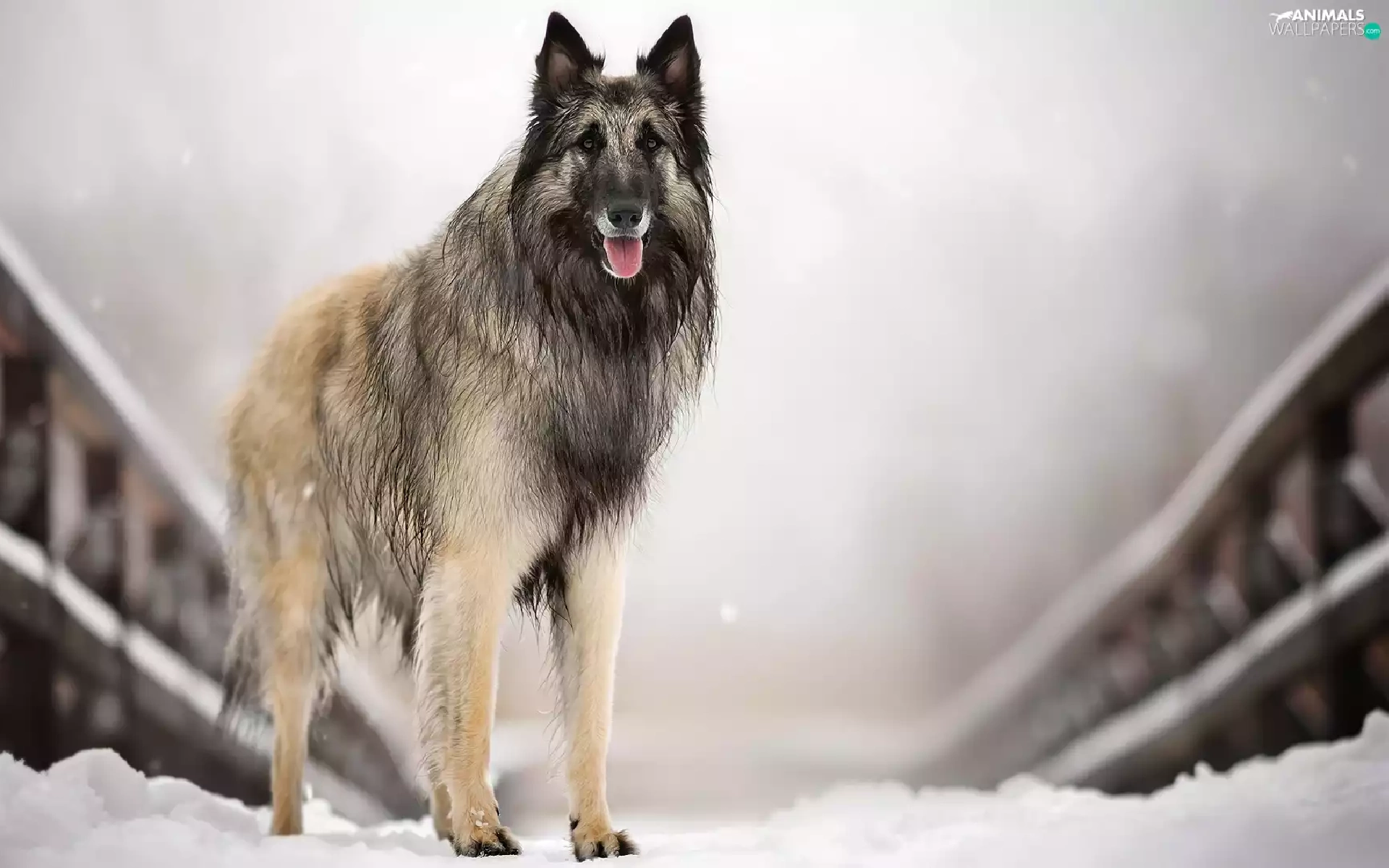 dog, bridges, snow, Belgian Shepherd Tervuren