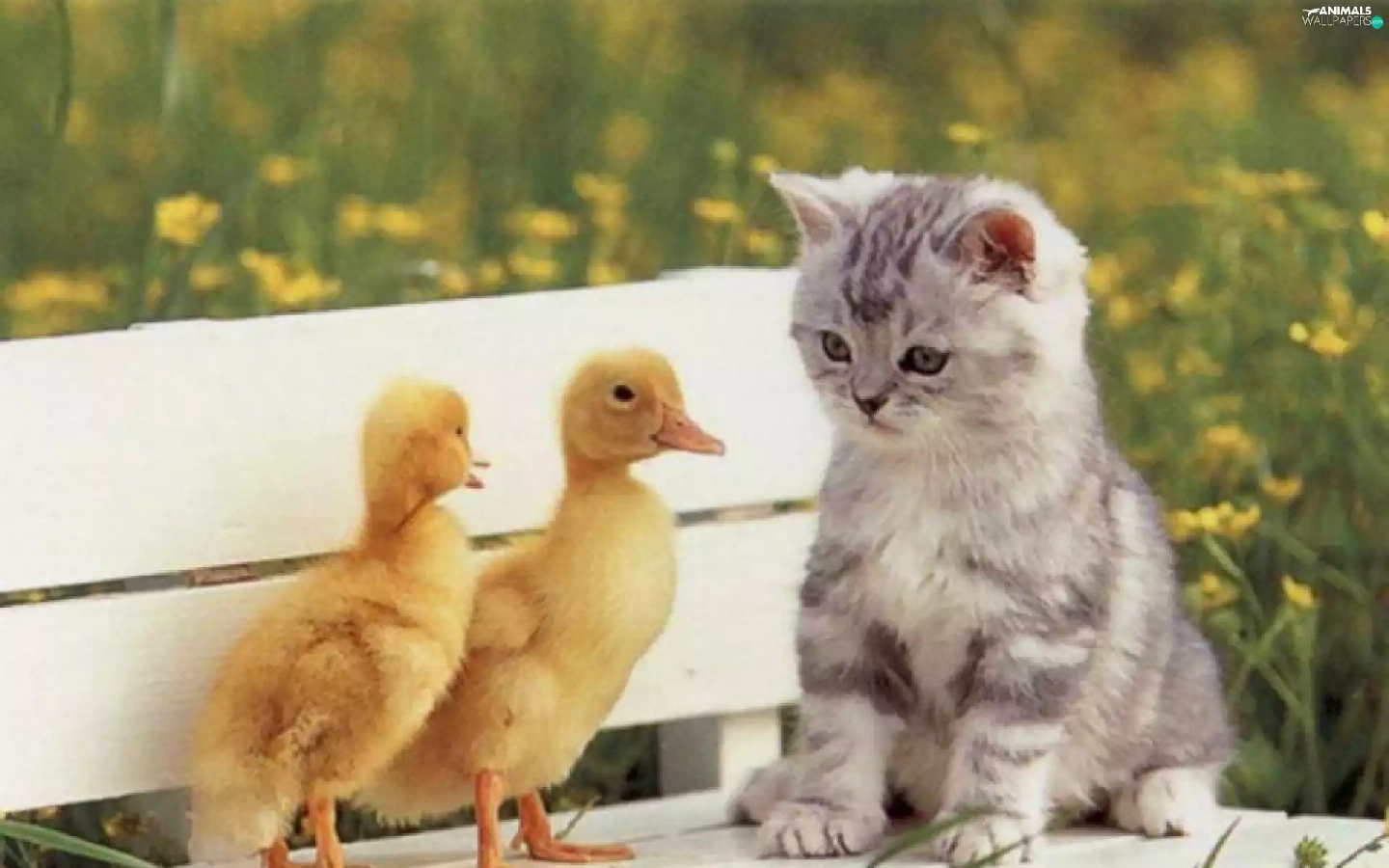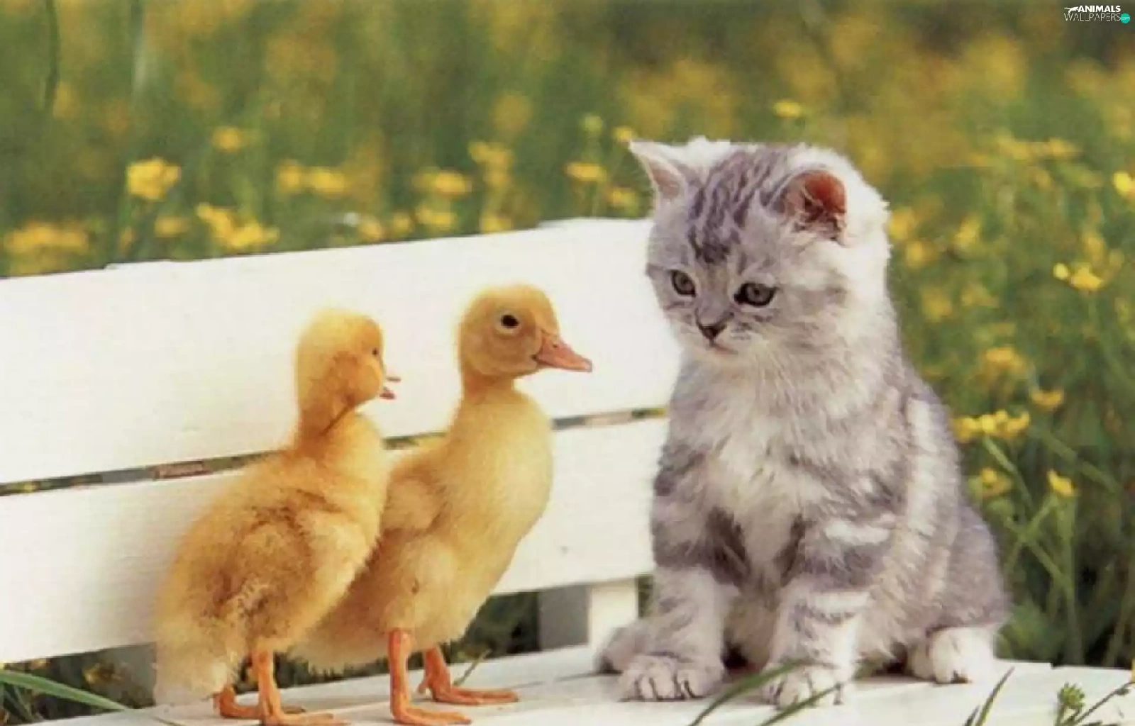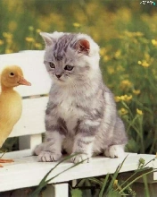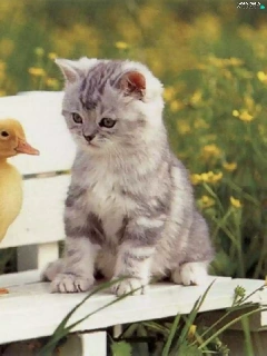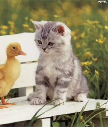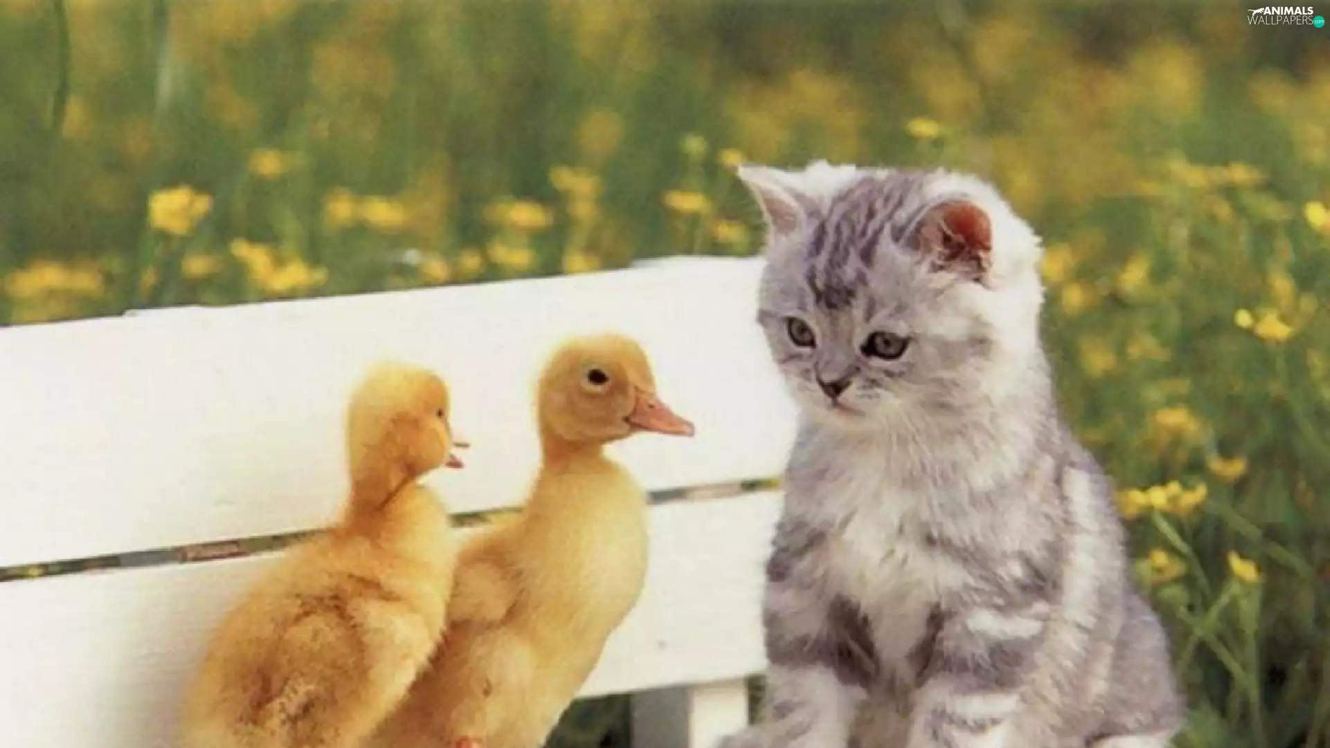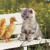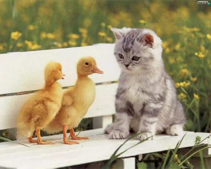 Bench, kitten, ducks