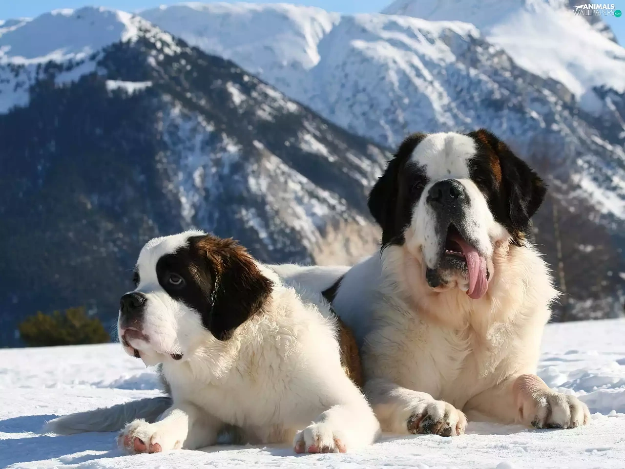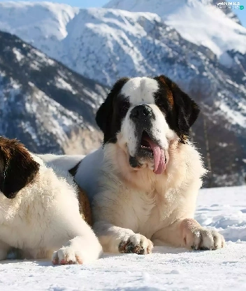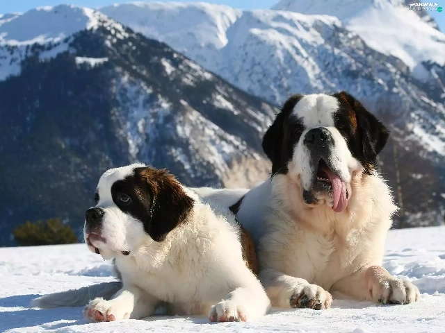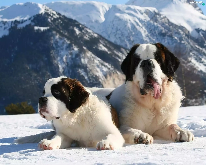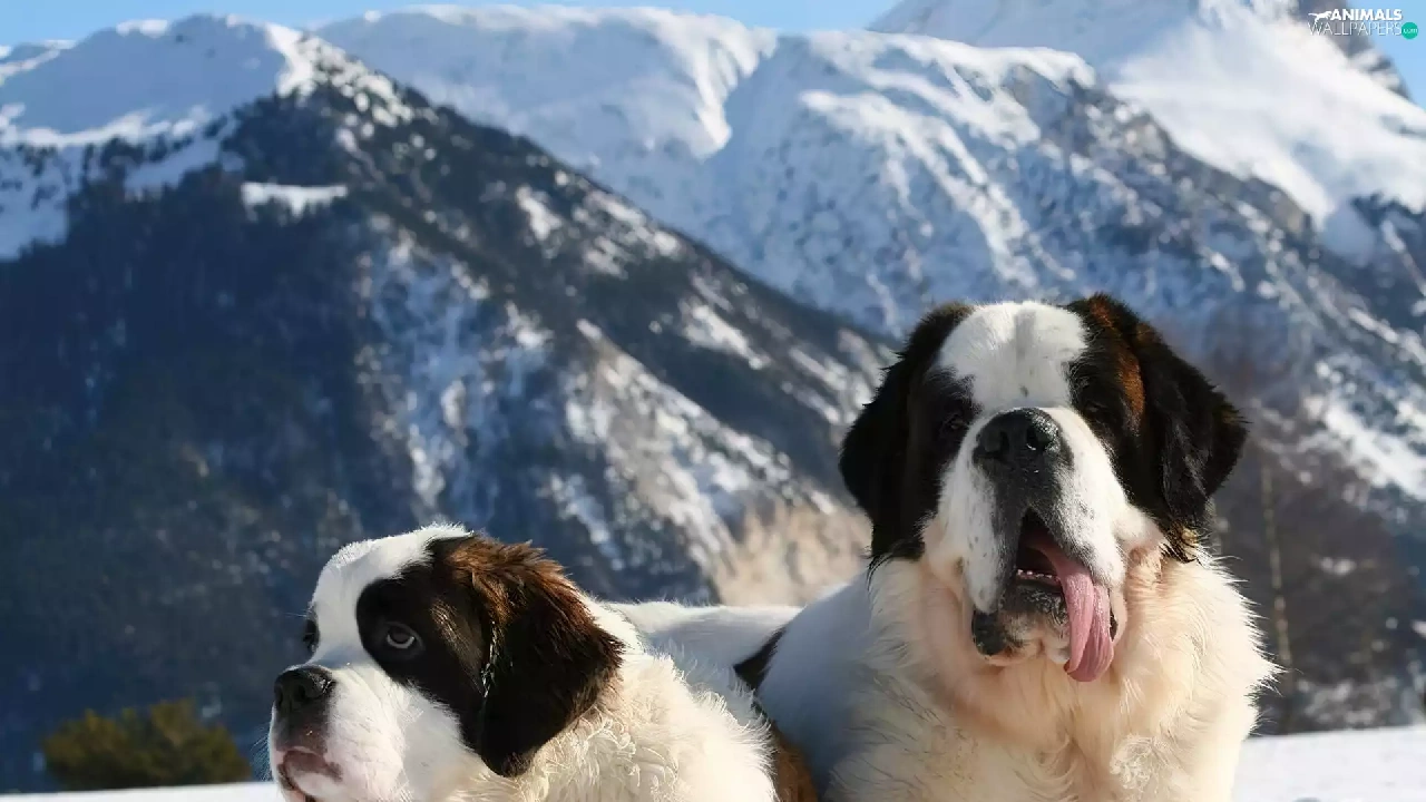 Mountains, winter, puppies, Bernards, Two cars