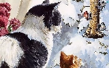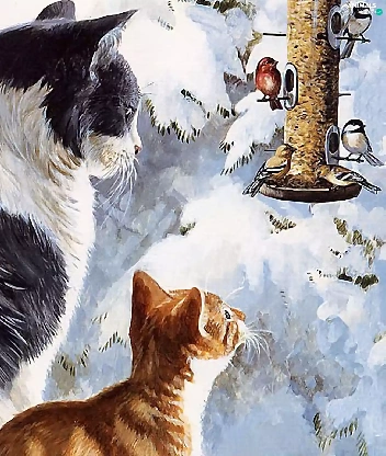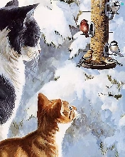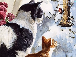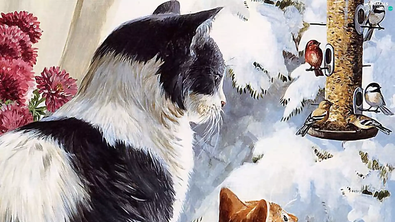 birds, winter, puss, Bird, Two cars