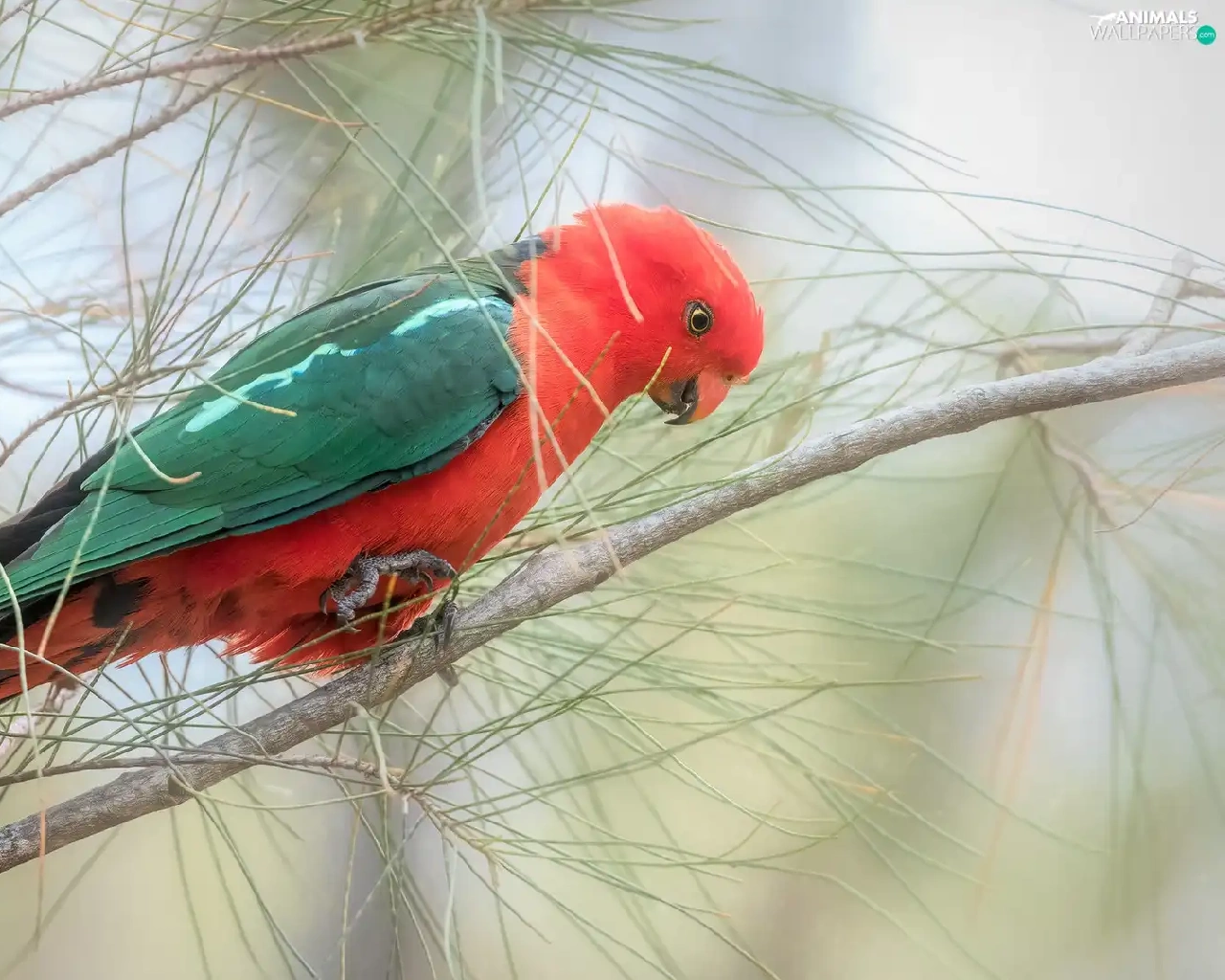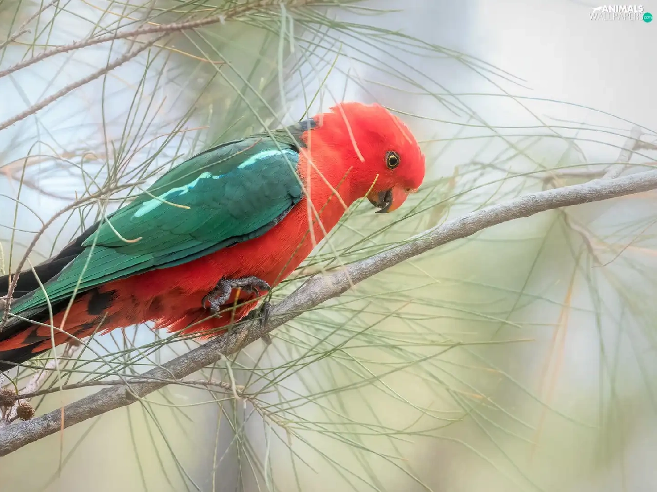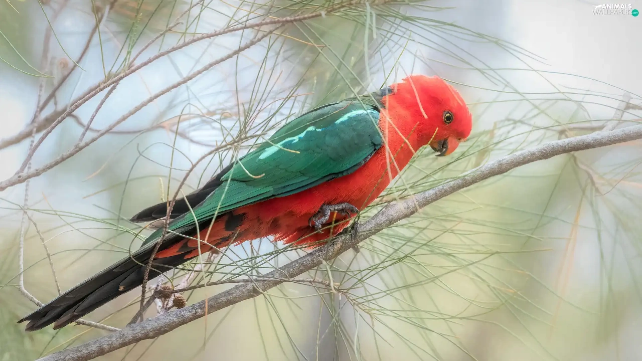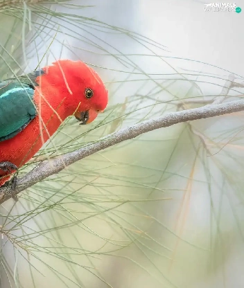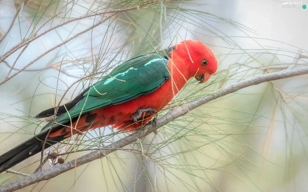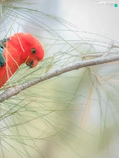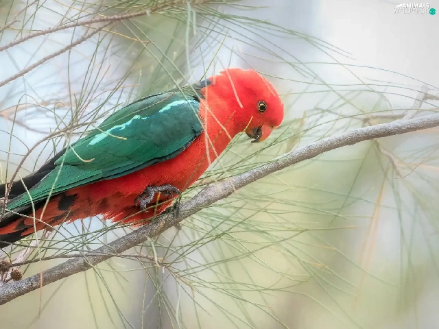 Twigs, pine, parrot, Bird, Green and red