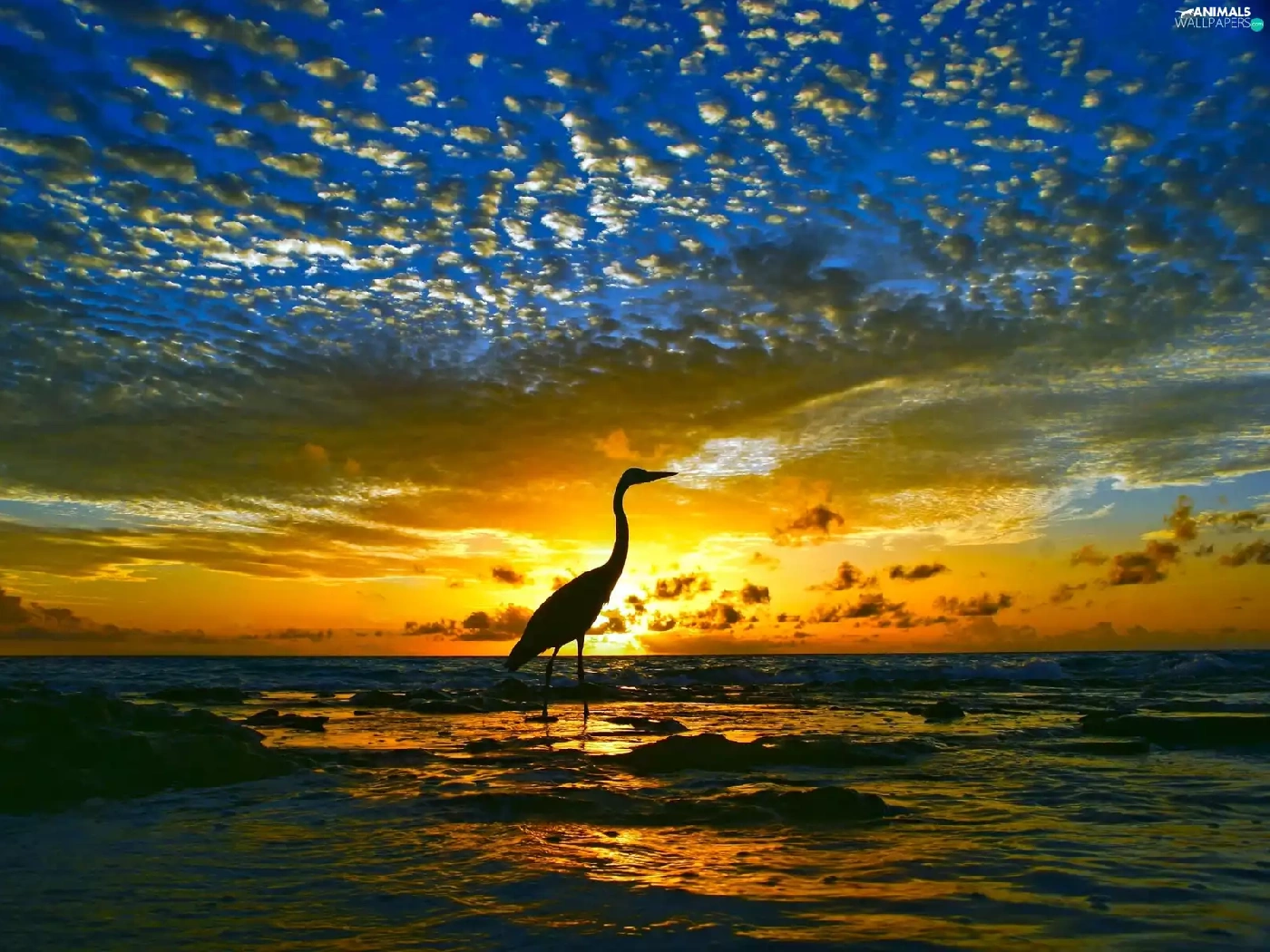 sea, Bird, sun, clouds, west