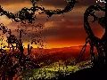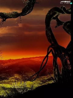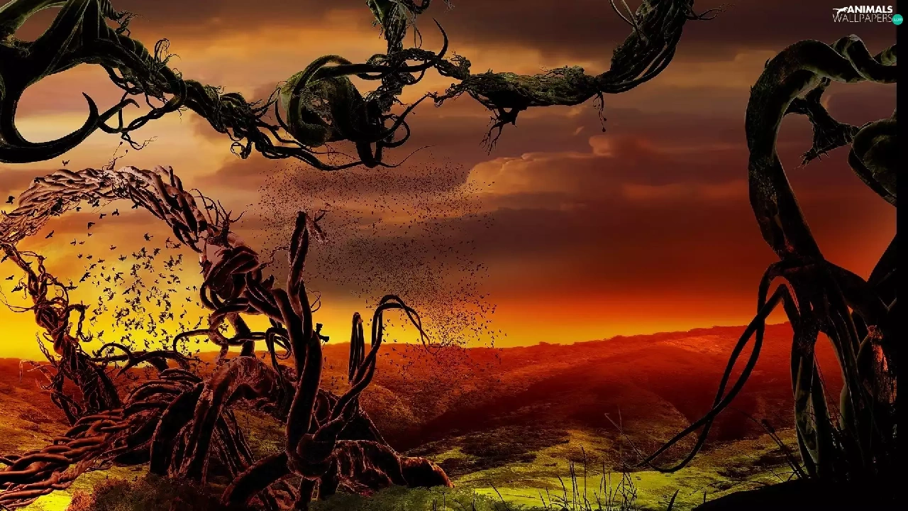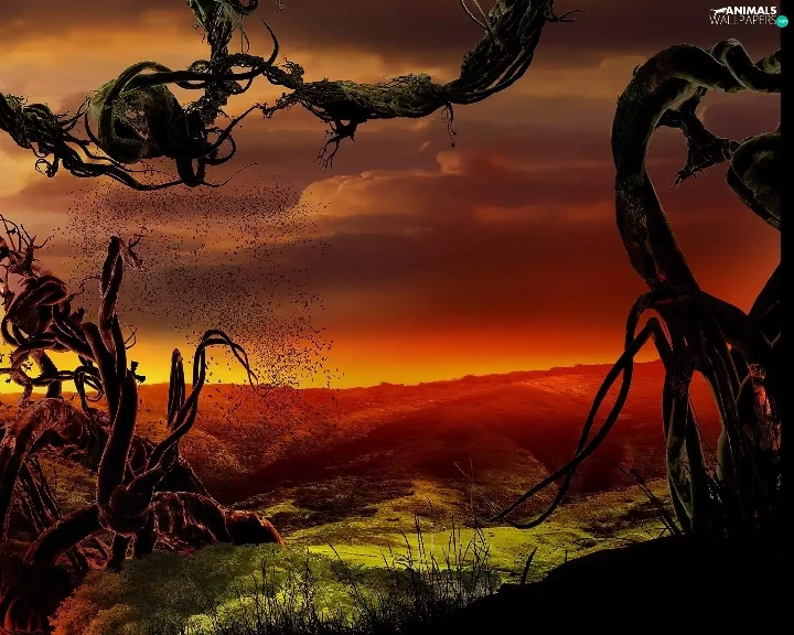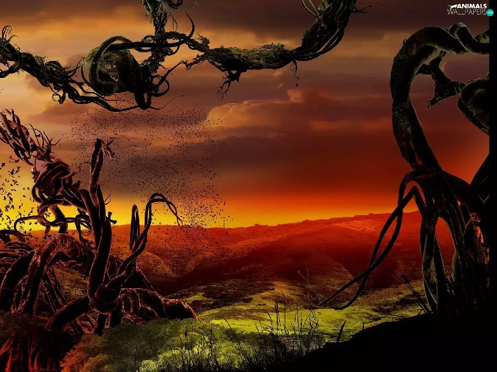 trees, dry, clouds, birds, field, branches