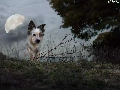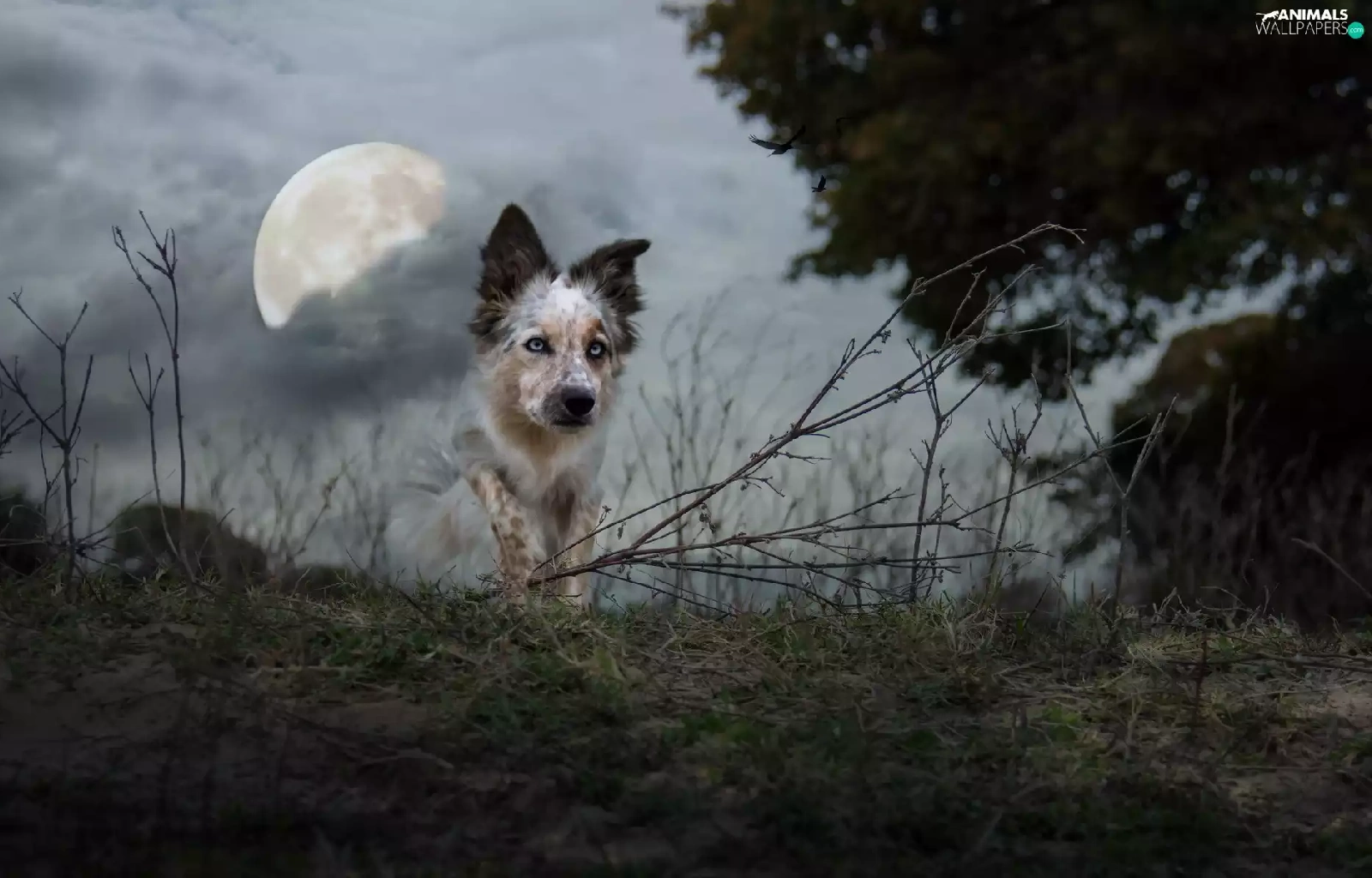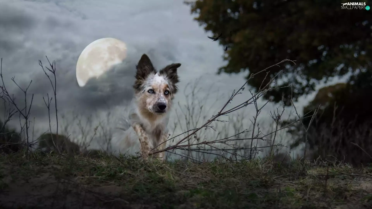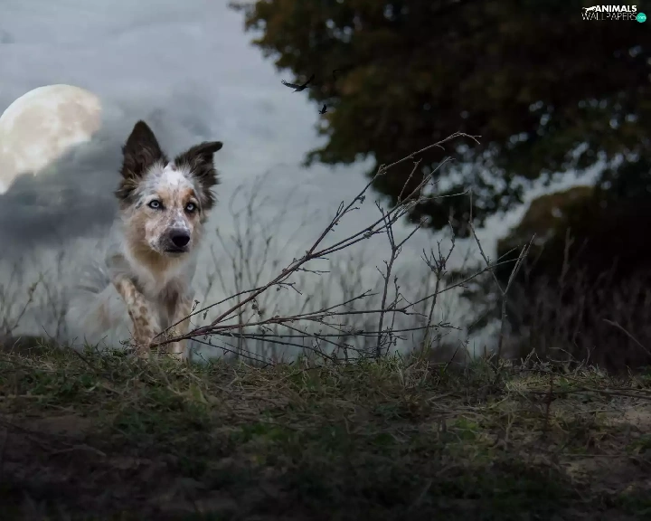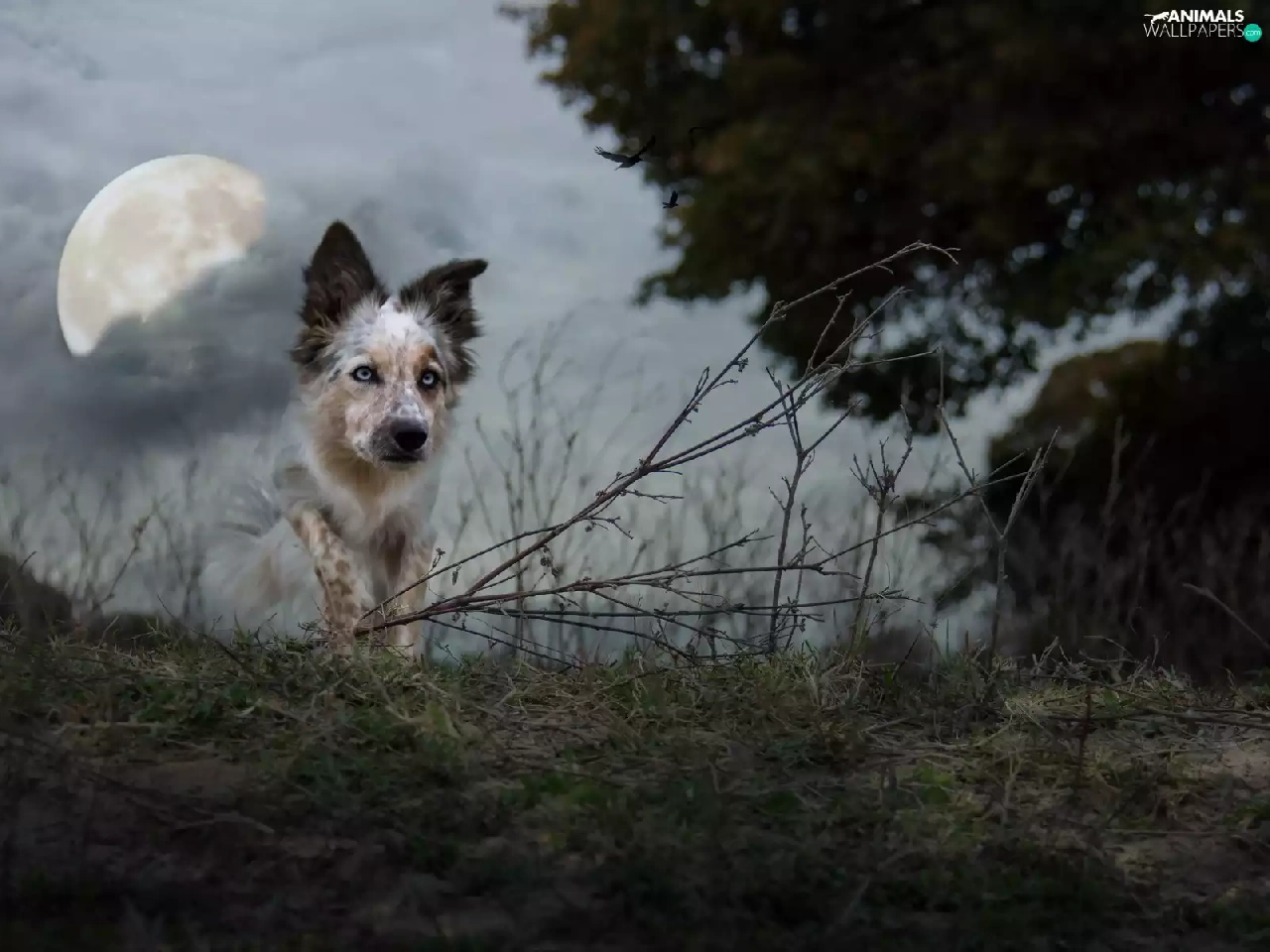 moon, birds, Collie, twilight, Border