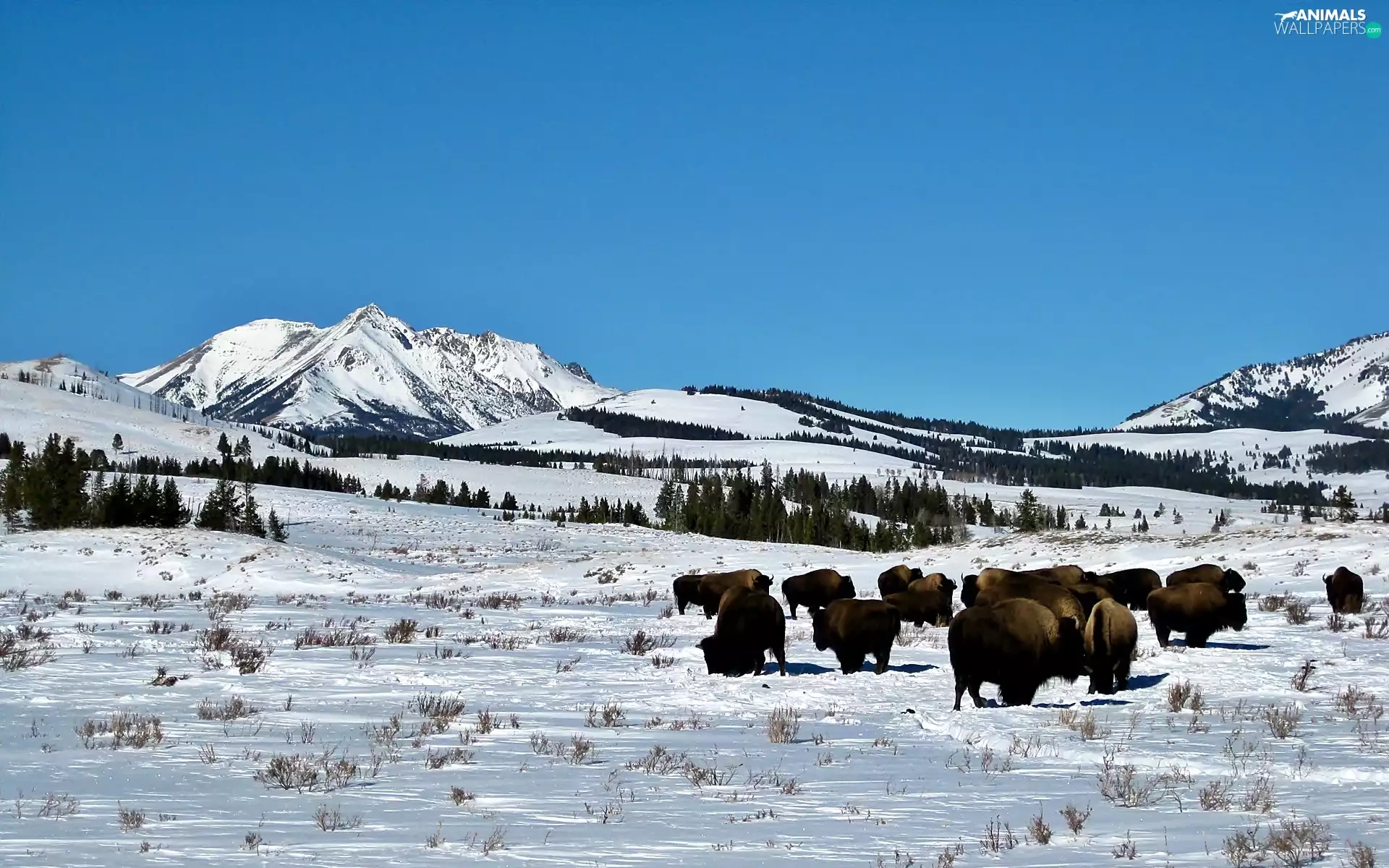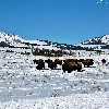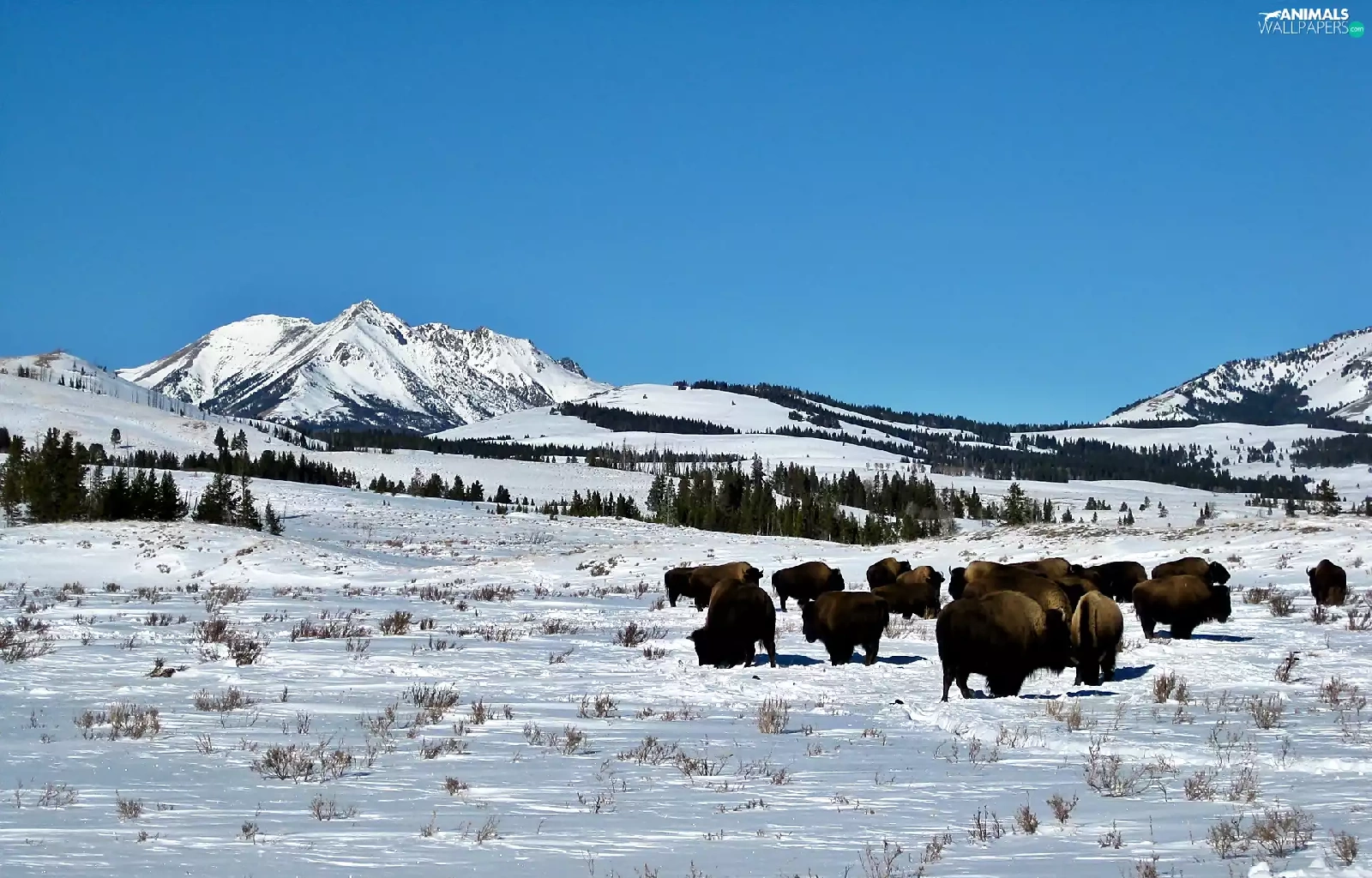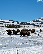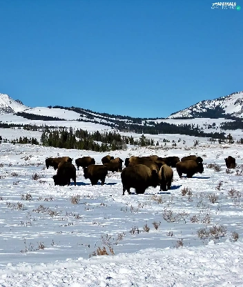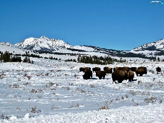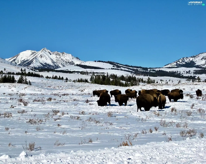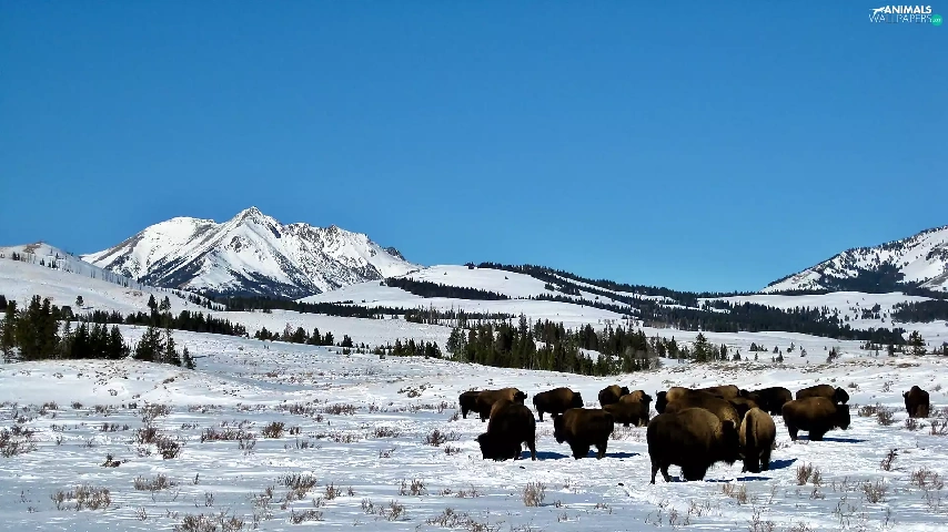 woods, winter, herd, bison, prairie, Mountains