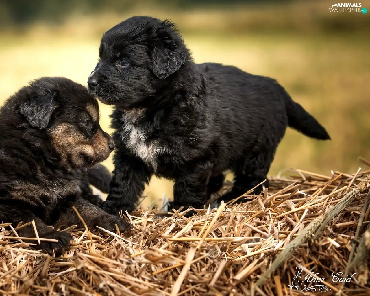 puppies, straw, Dogs, Black, Two cars