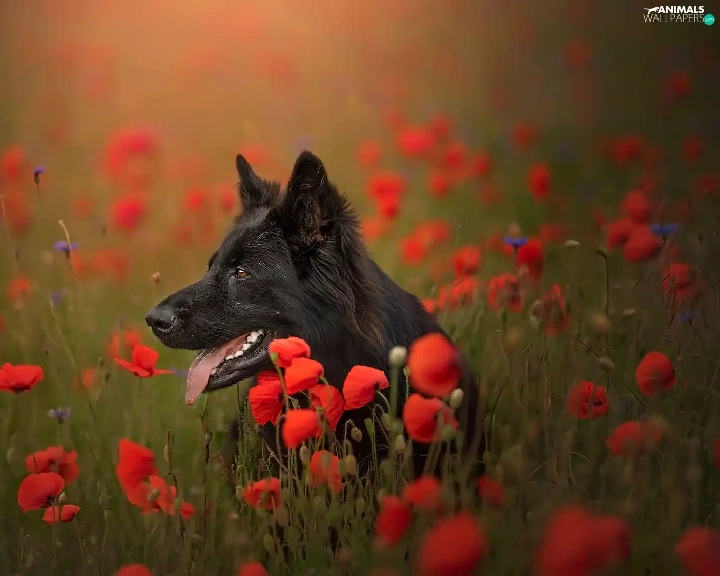 dog, Flowers, papavers, Black German Shepherd Dog