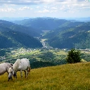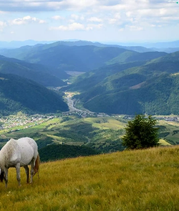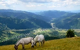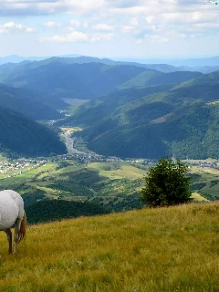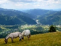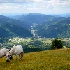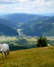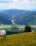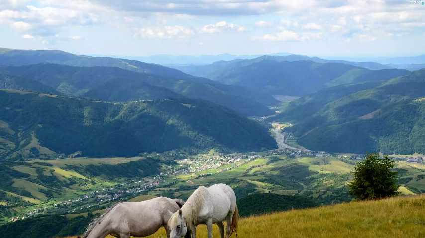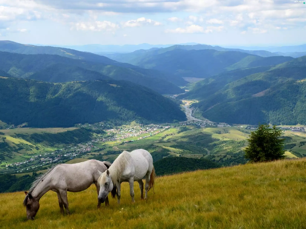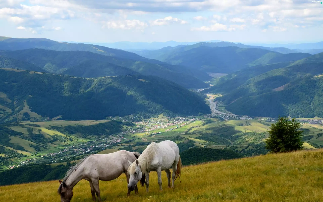 Valley, grazing, Mountains, bloodstock, Meadow, village, woods