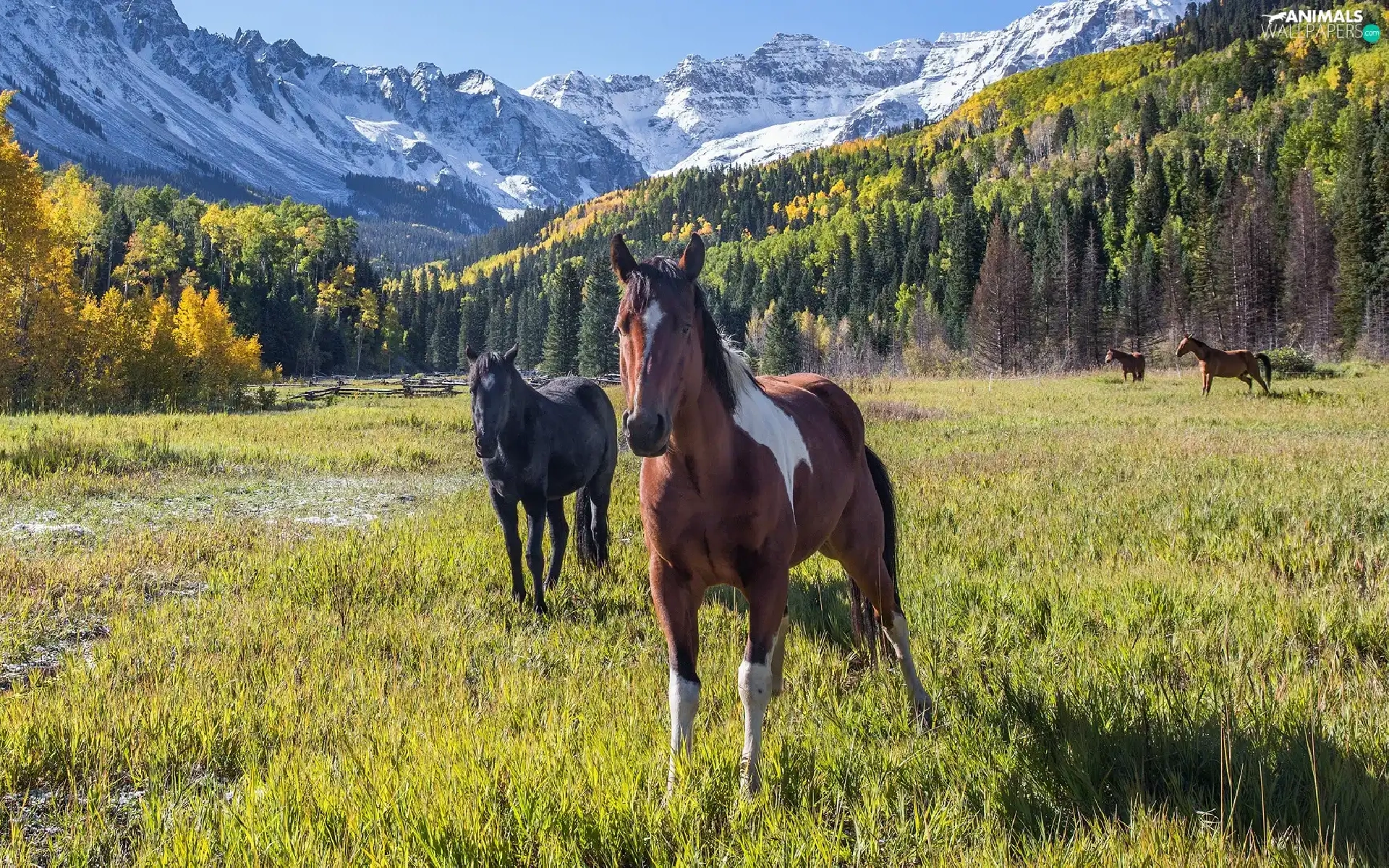 trees, autumn, Meadow, bloodstock, viewes, Mountains