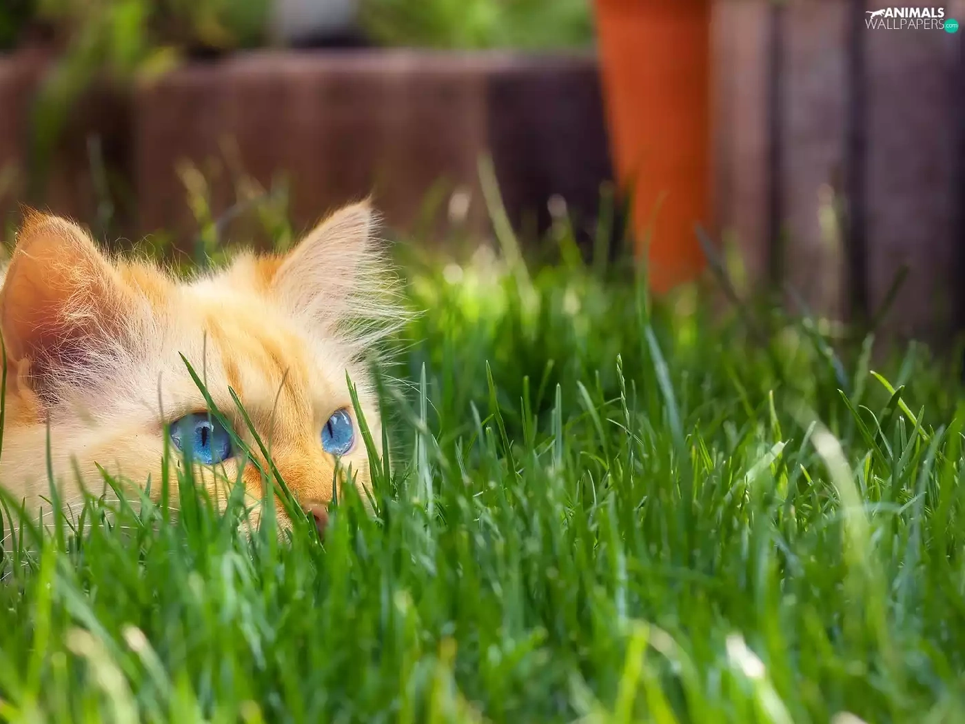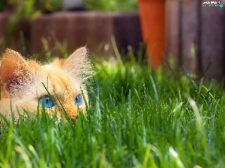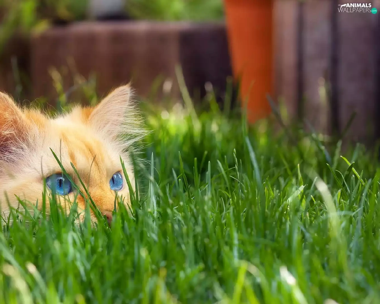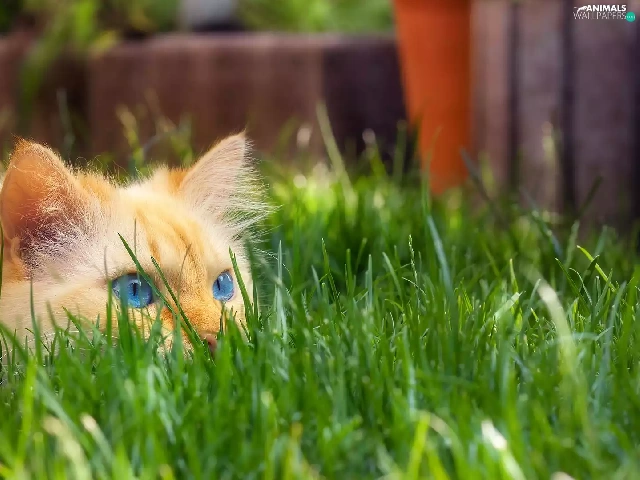 cat, grass, ginger, Blue Eyed, lurking