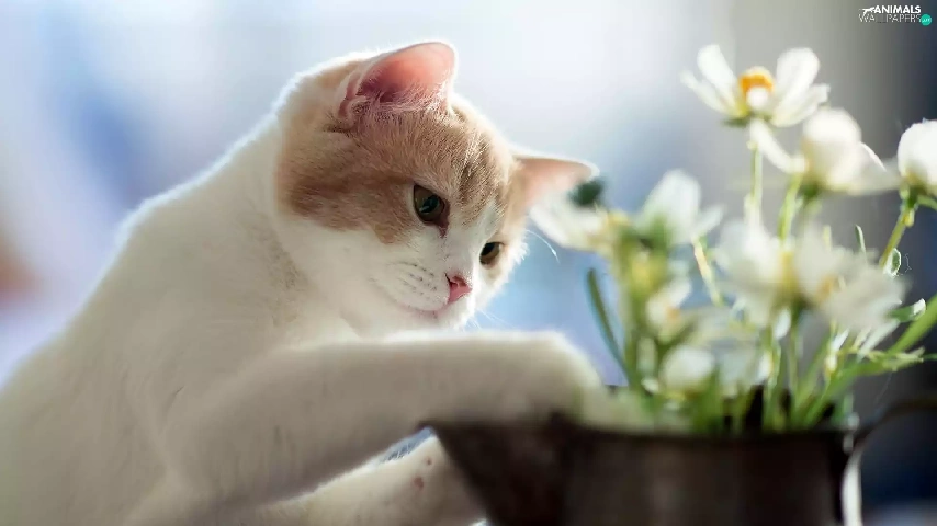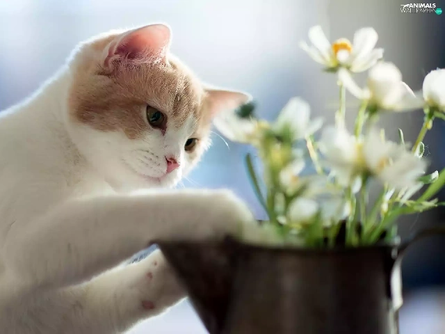 kitten, white, Flowers, blur, jug, ginger