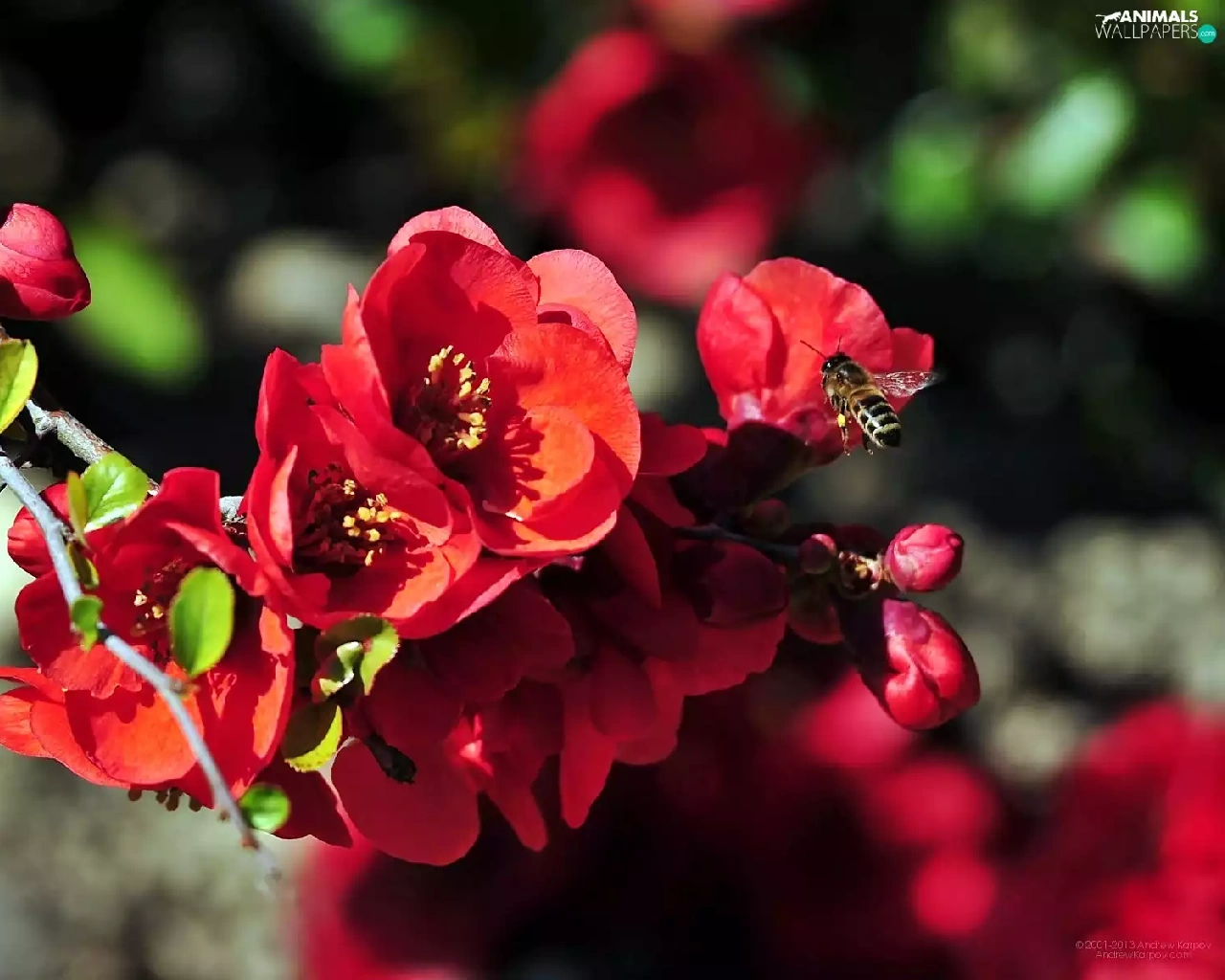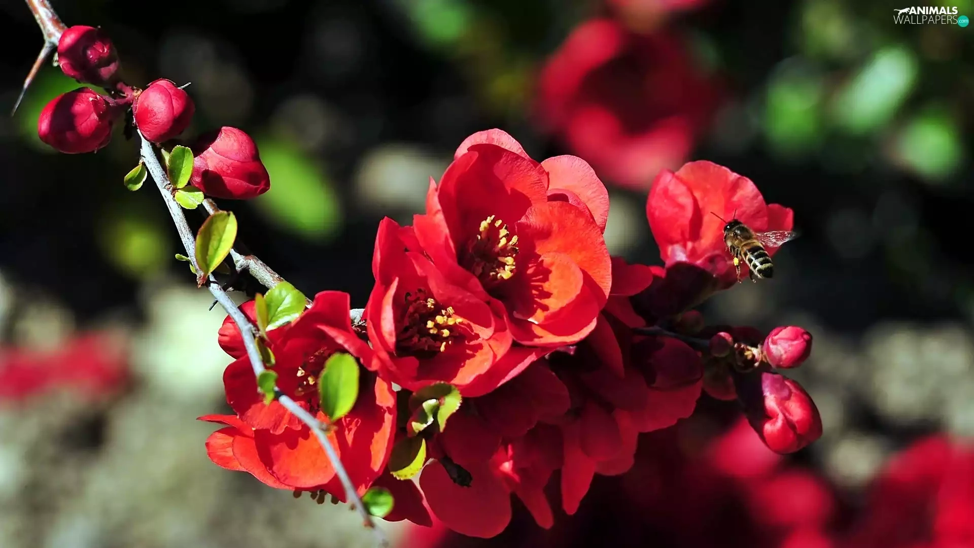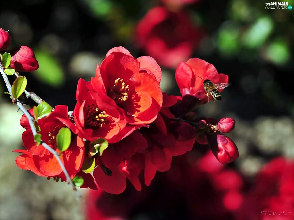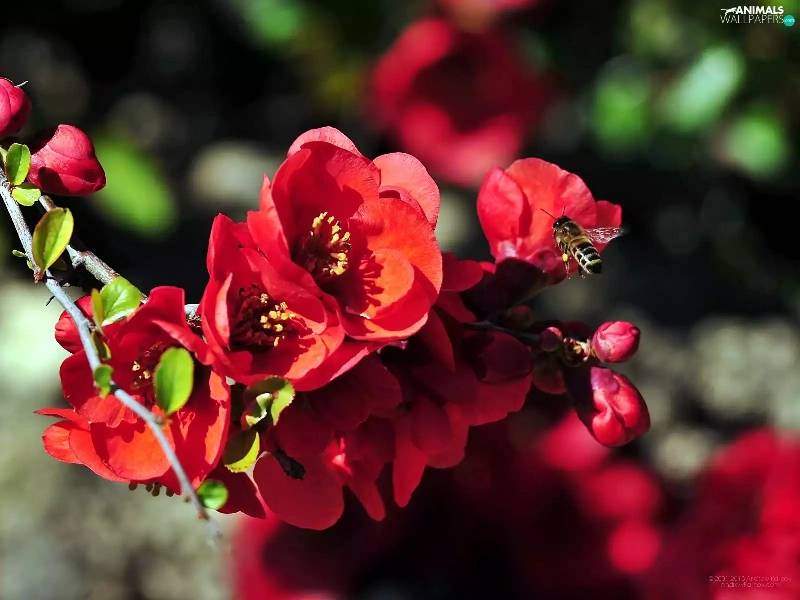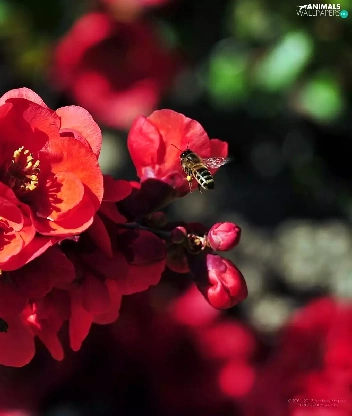 bee, blur, Red, Flowers, twig