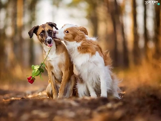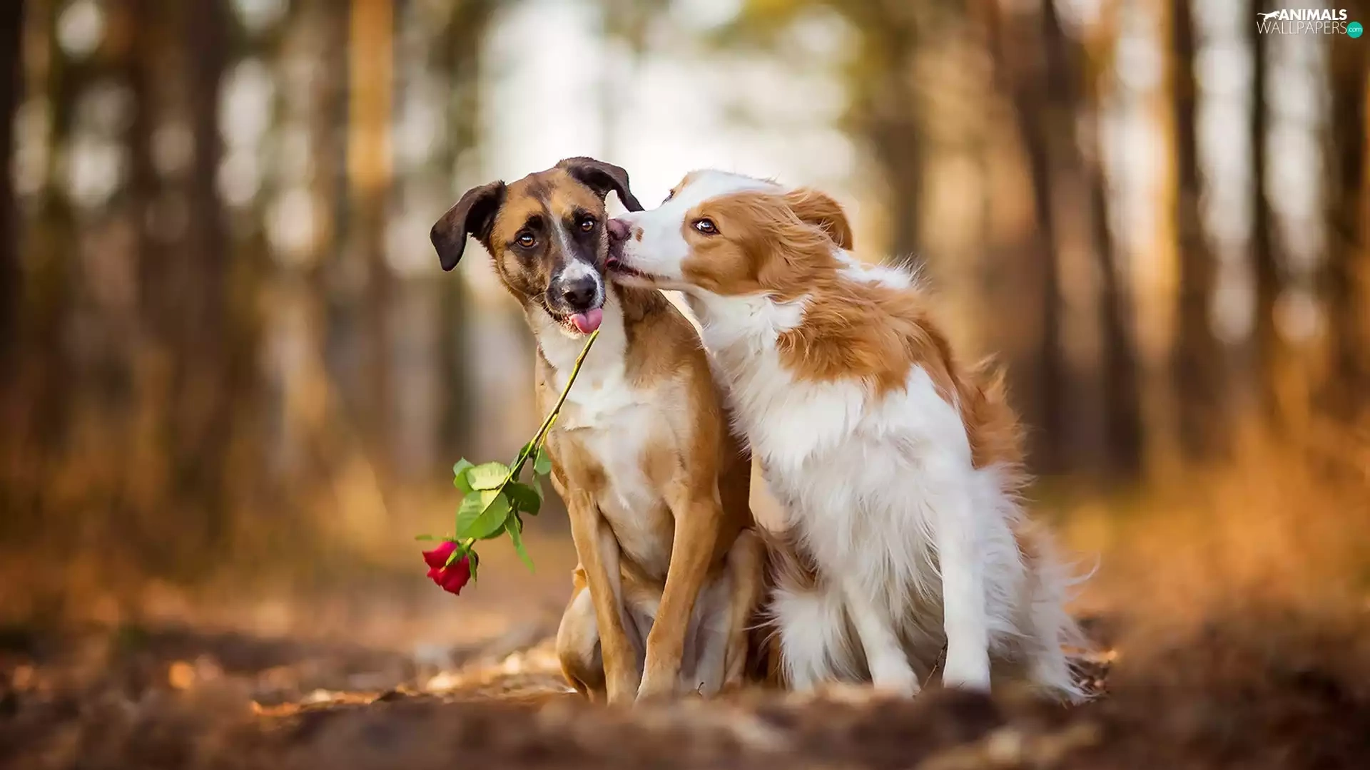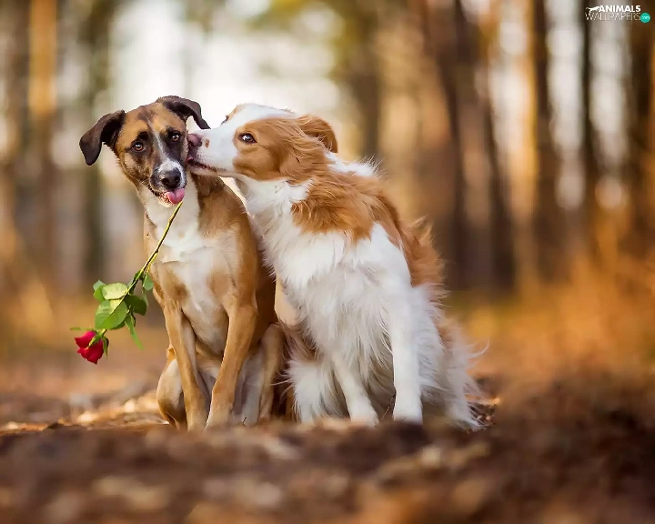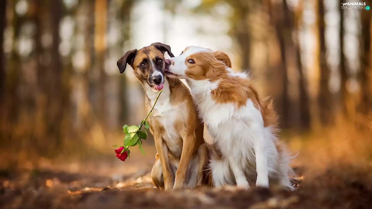 Mixed-breed dog, Two cars, rose, blurry background, Border Collie, Dogs