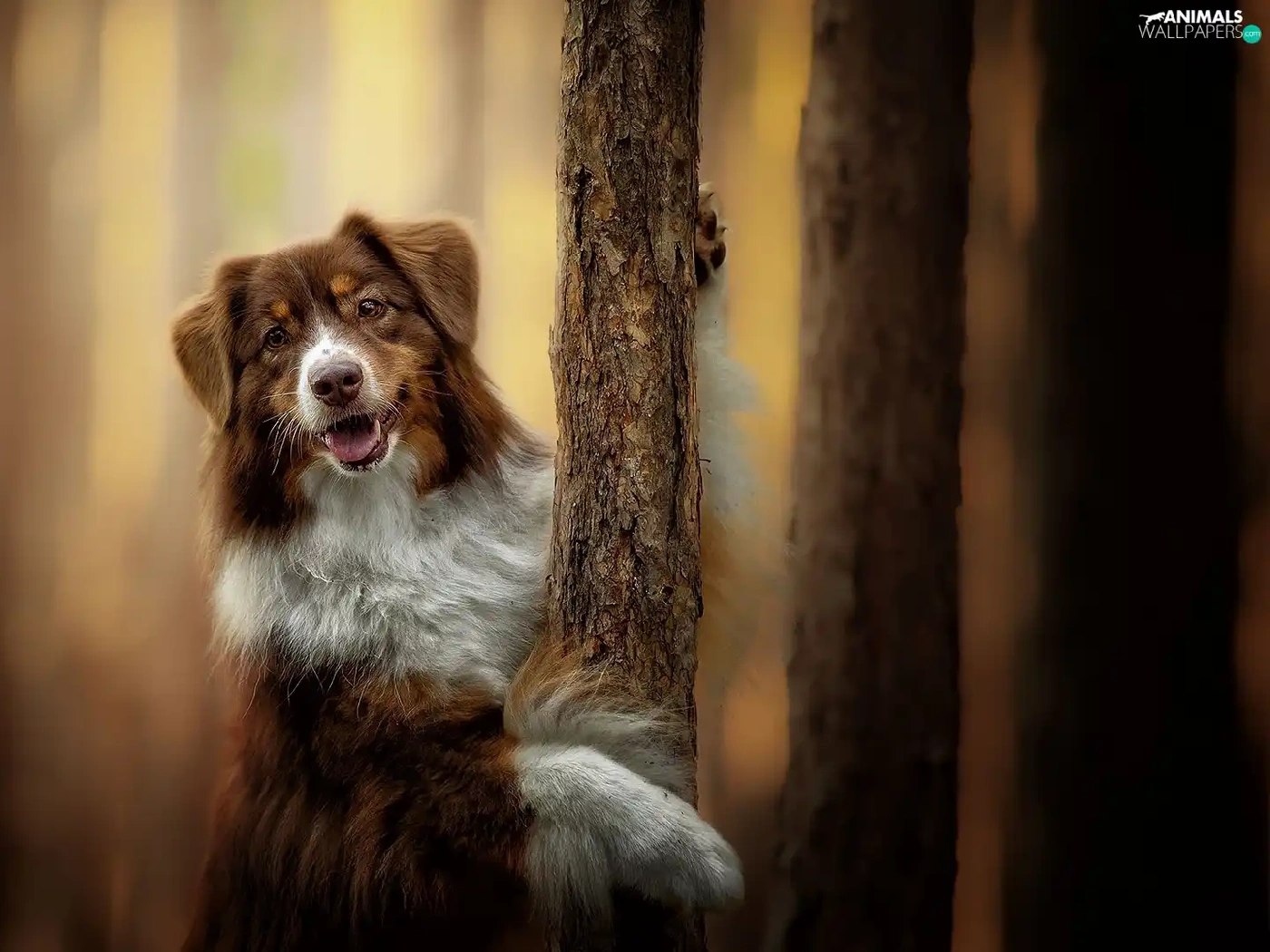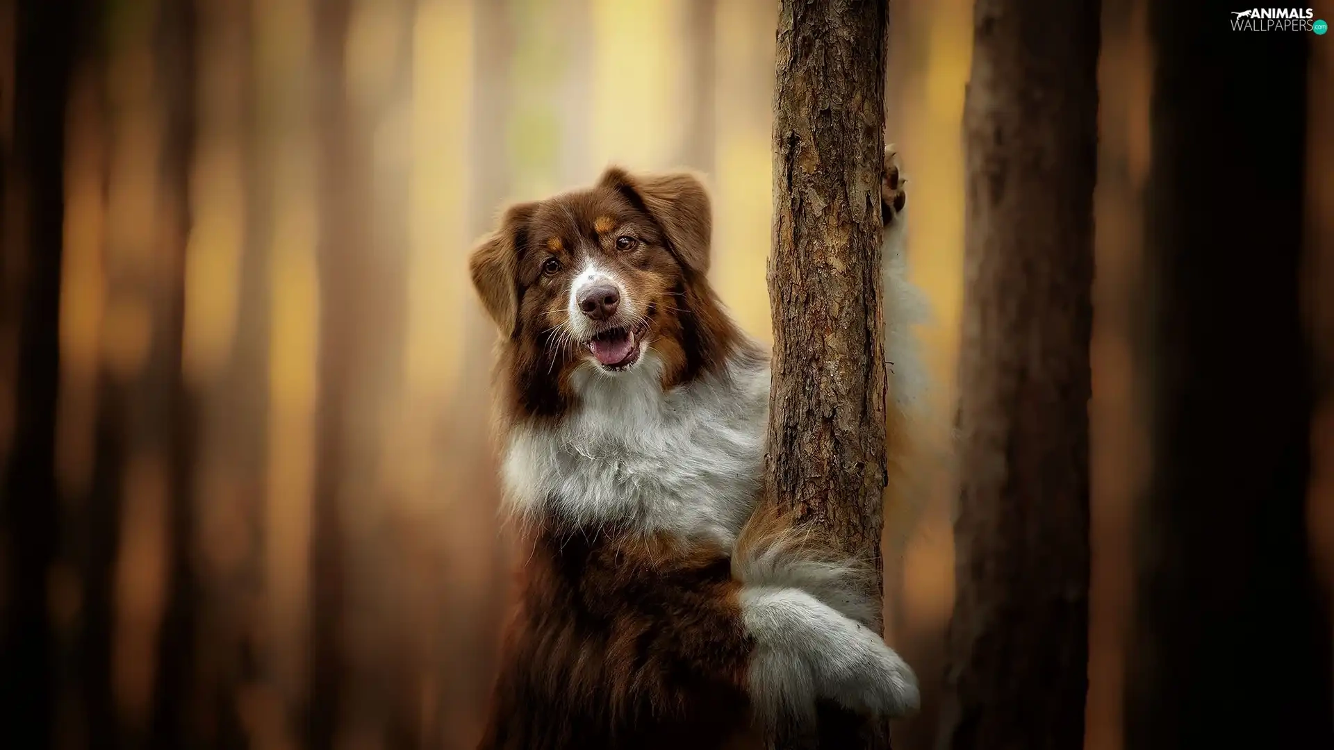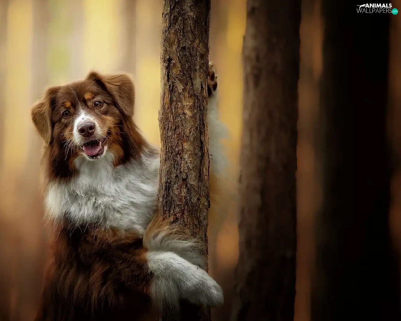 Australian Shepherd, viewes, blurry background, trees