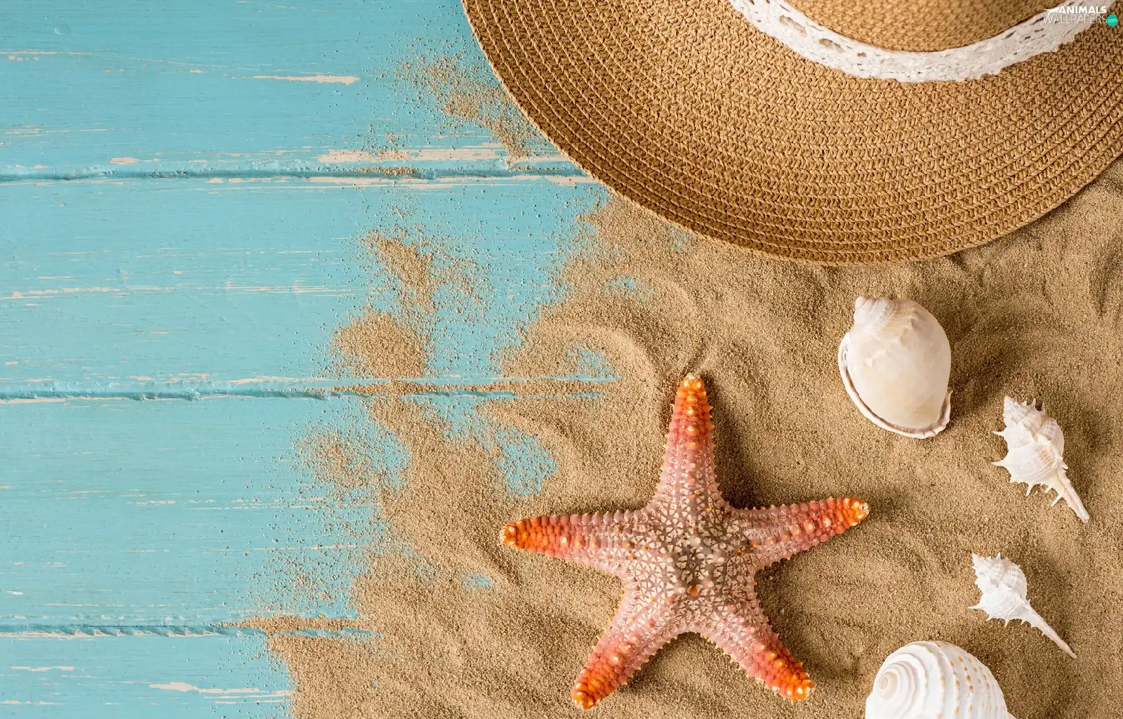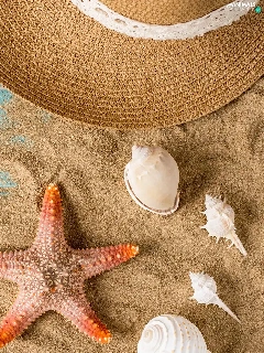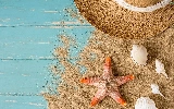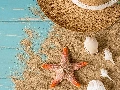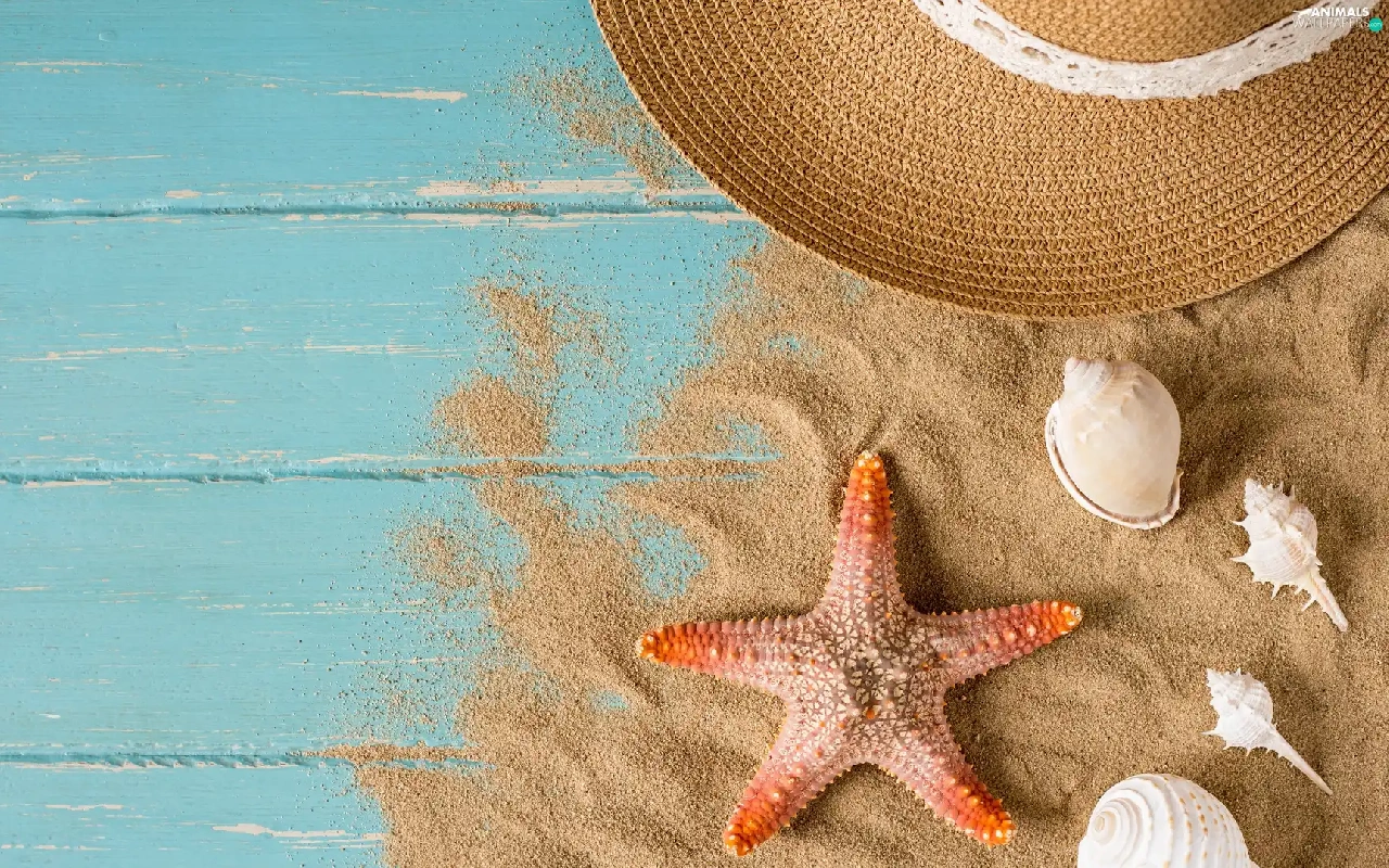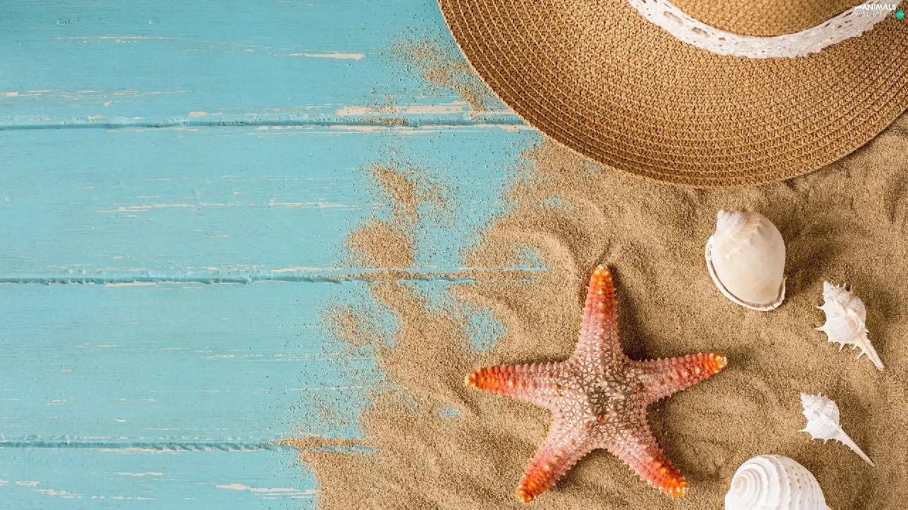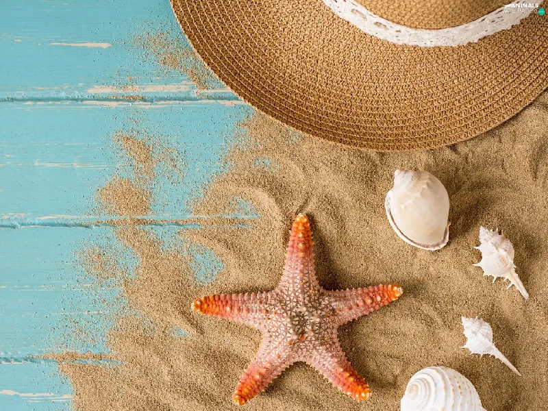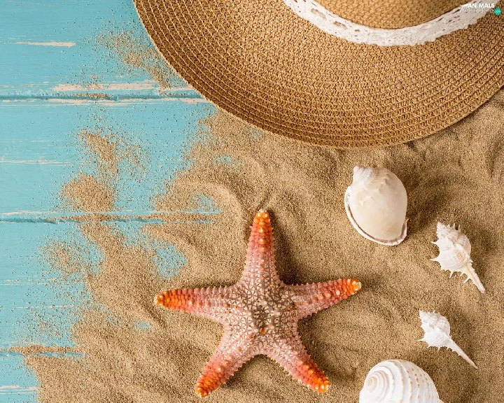 Sand, boarding, Shells, starfish, Hat