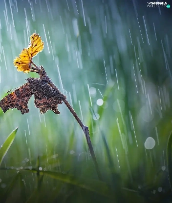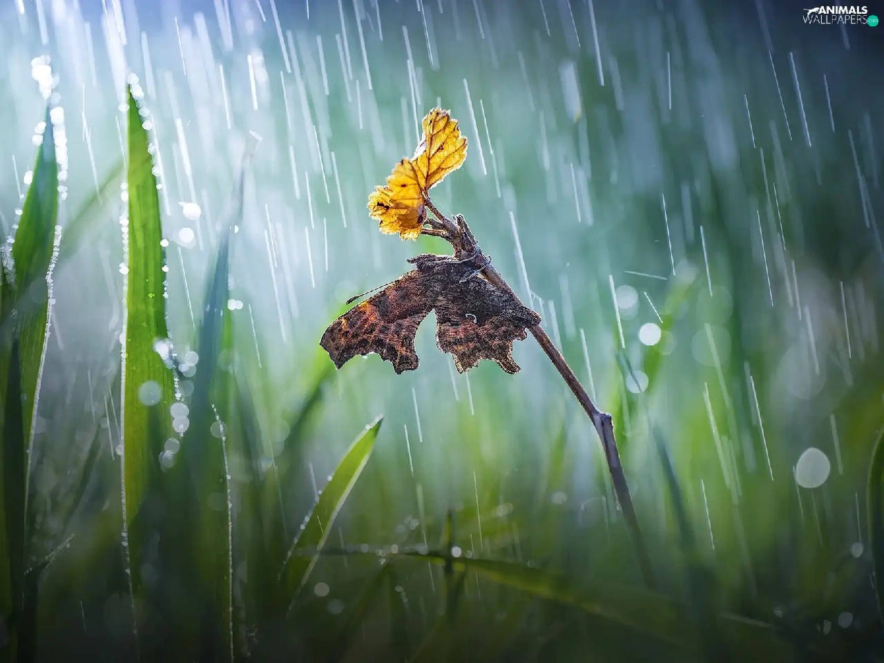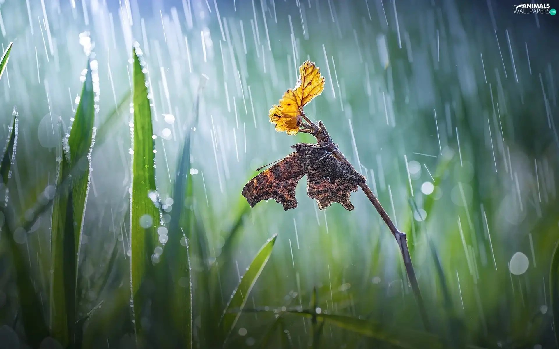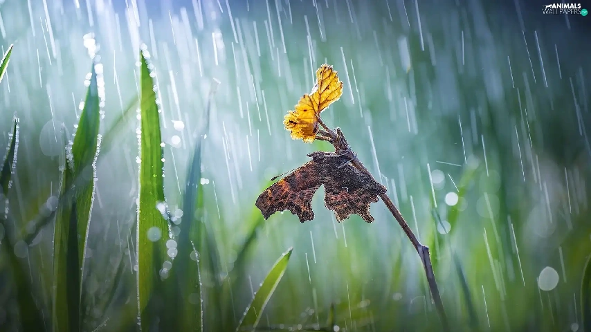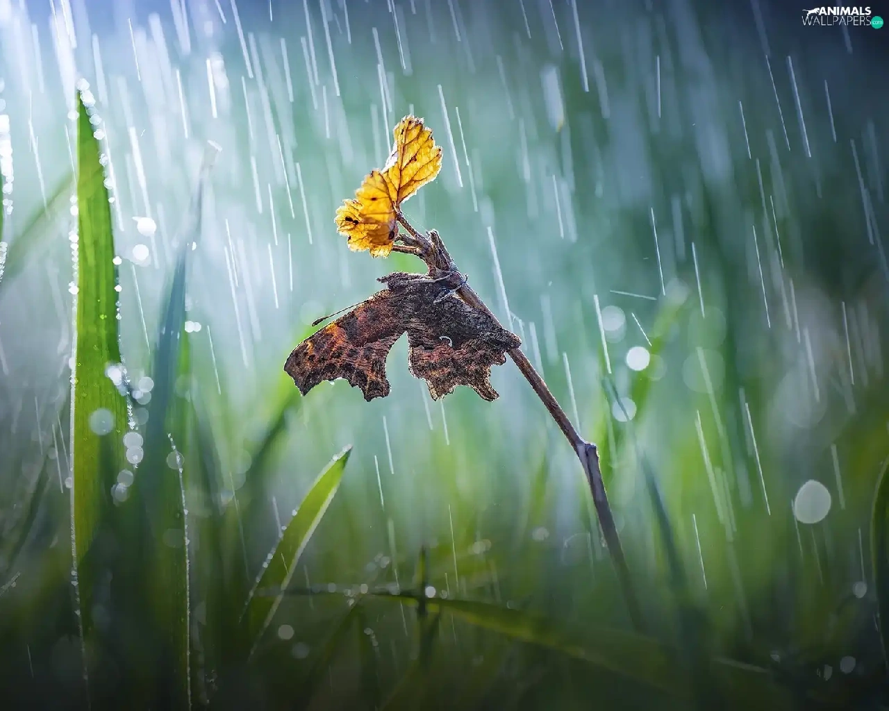 butterfly, Bokeh, twig, Rain, grass
