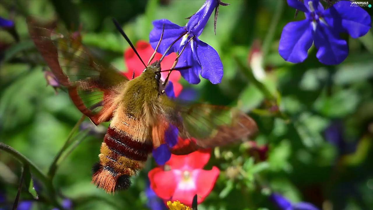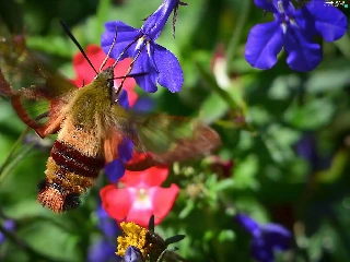 Flowers, lobelia, Hummingbird Hawk-Moth, Broad-bordered Bee Hawk-moth, butterfly