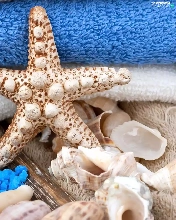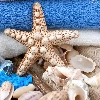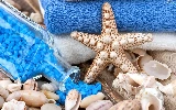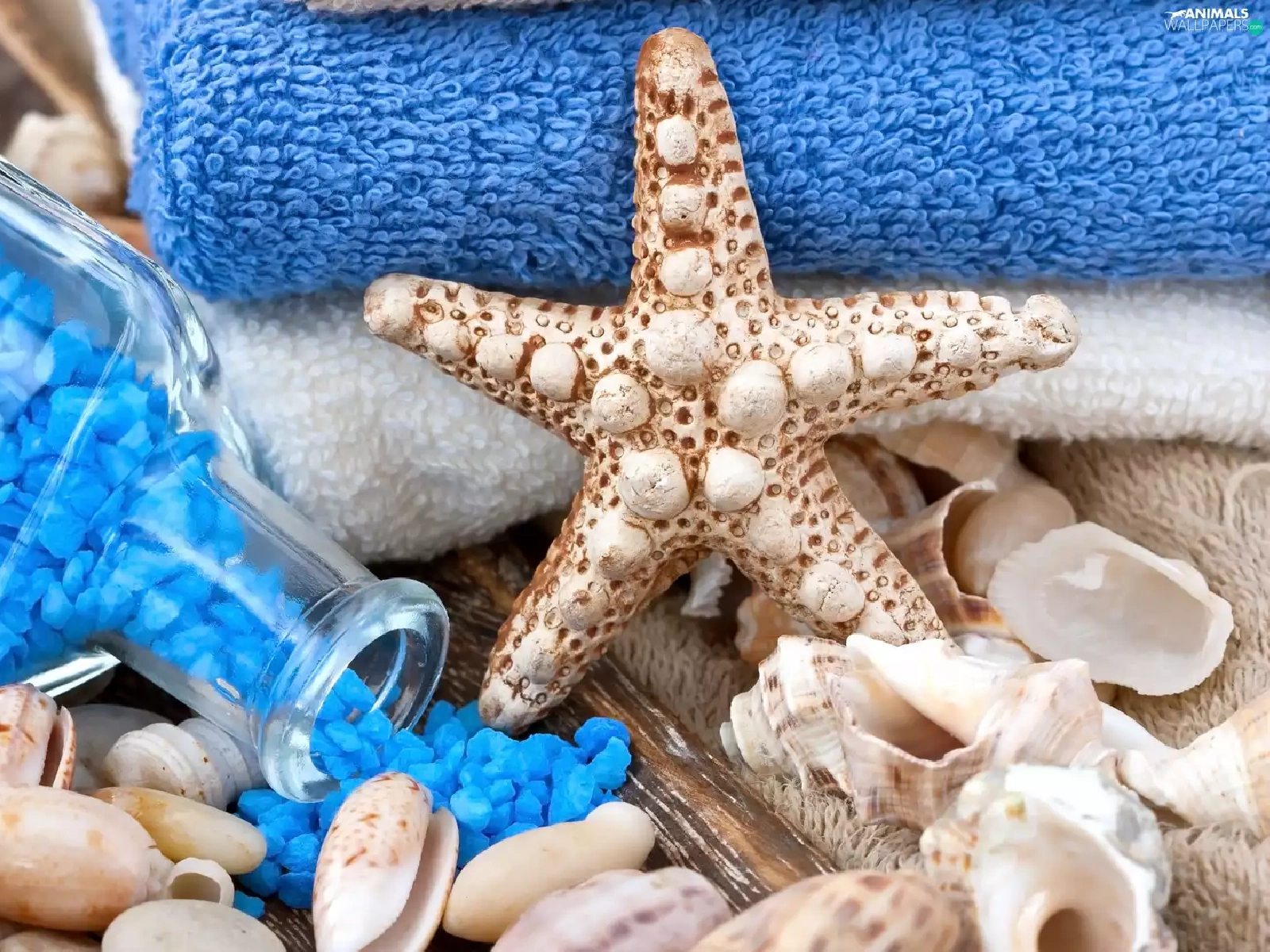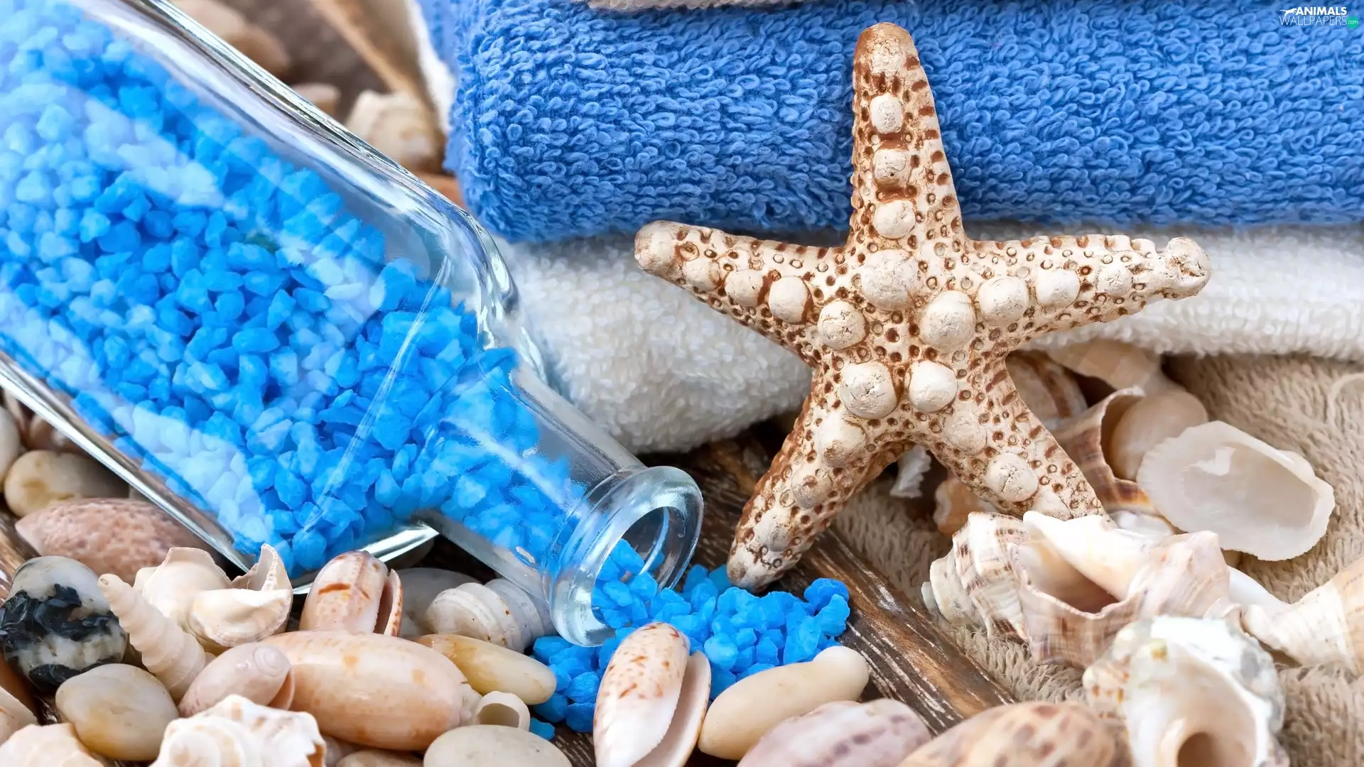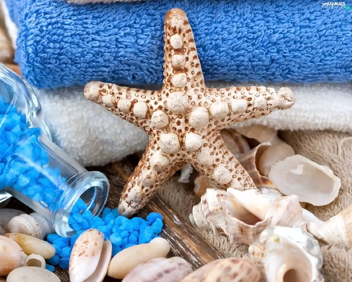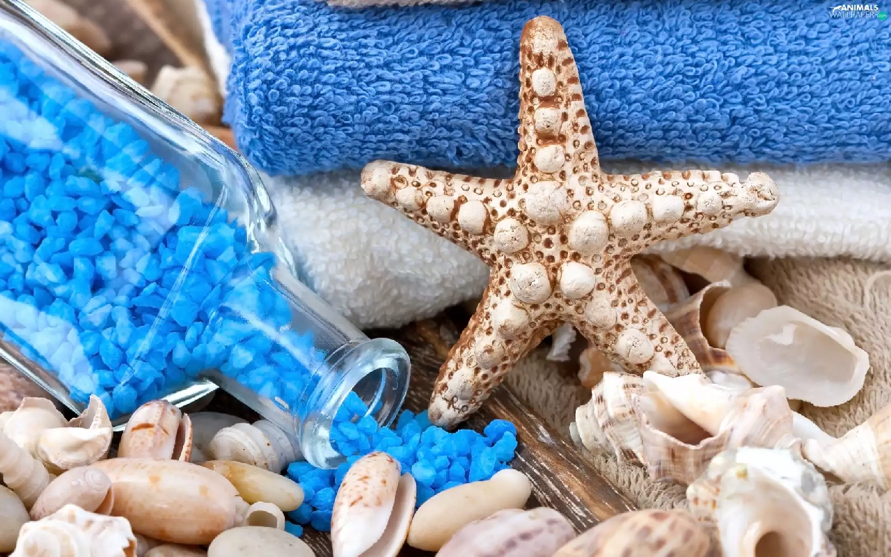Shells, salt, Spa, Bottle, Blue, starfish, Towels