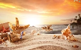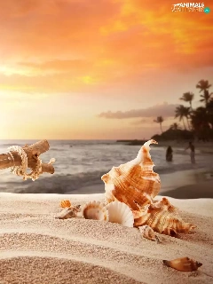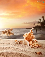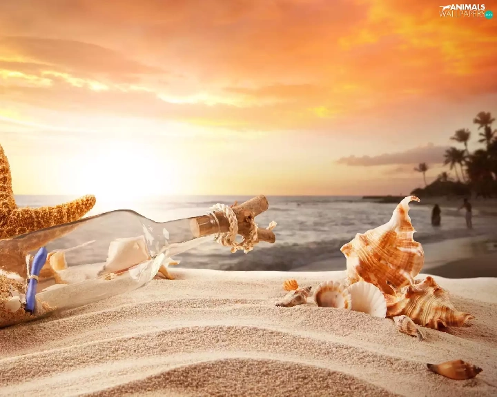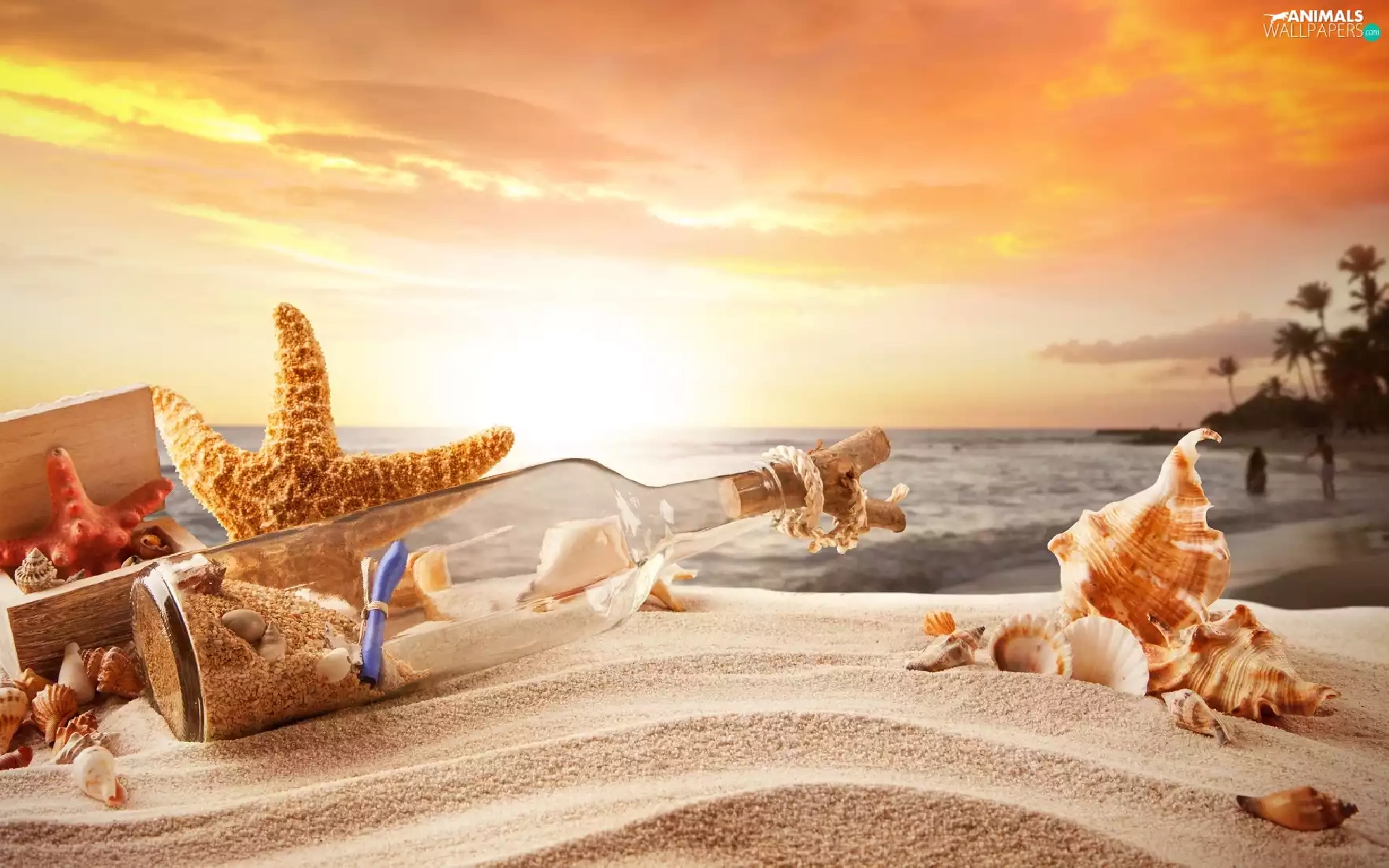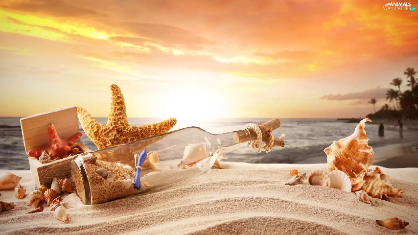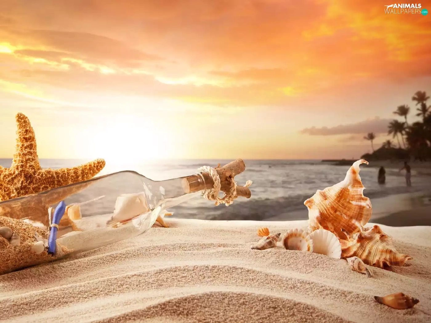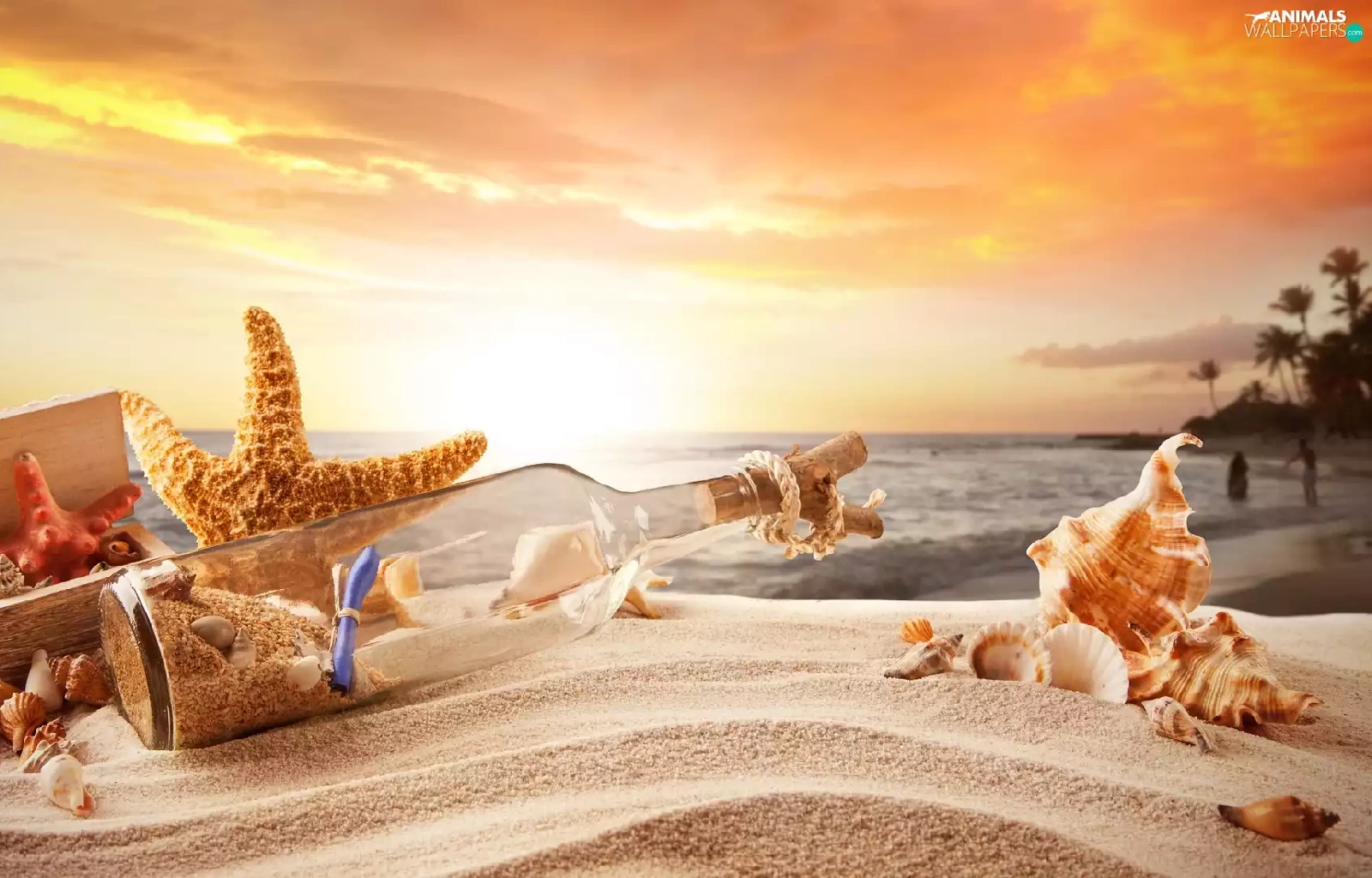 Beaches, Great Sunsets, Bottle, starfish, Shells, sea