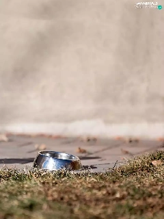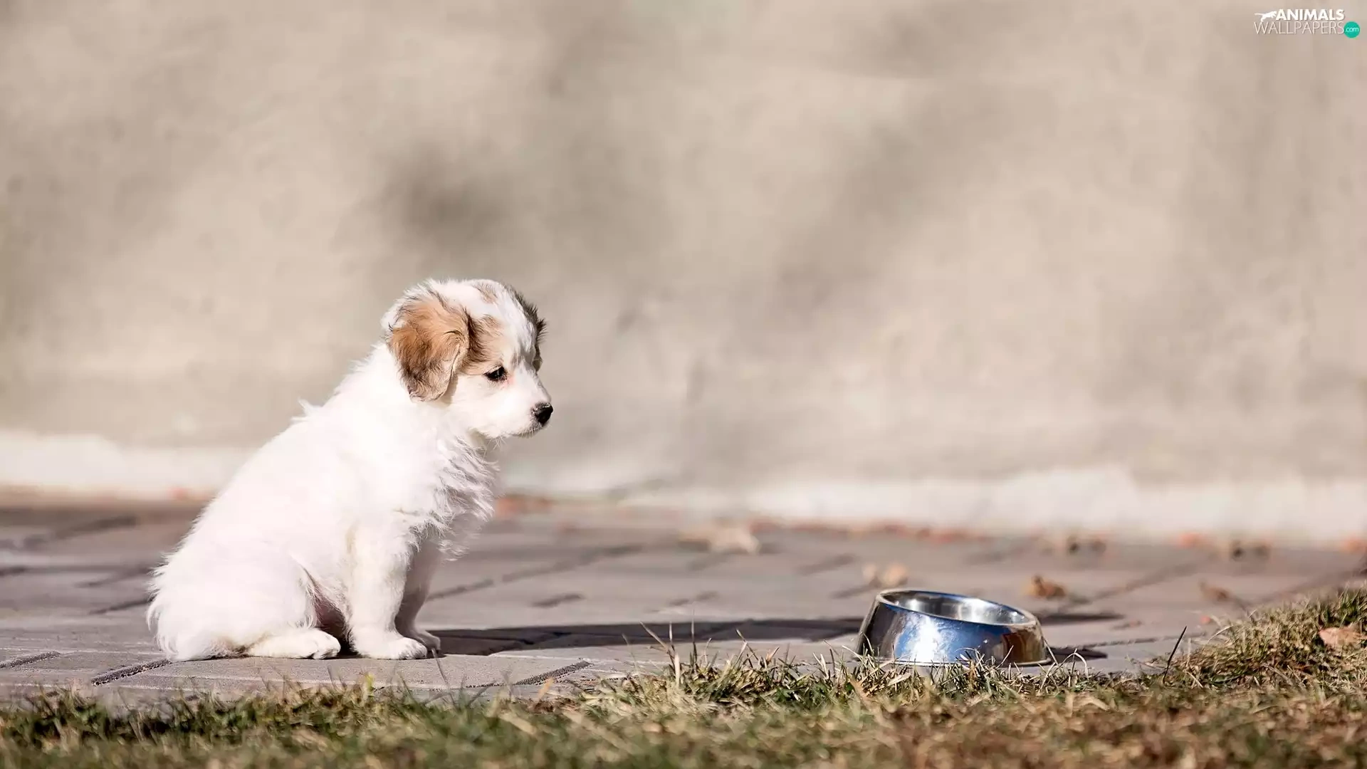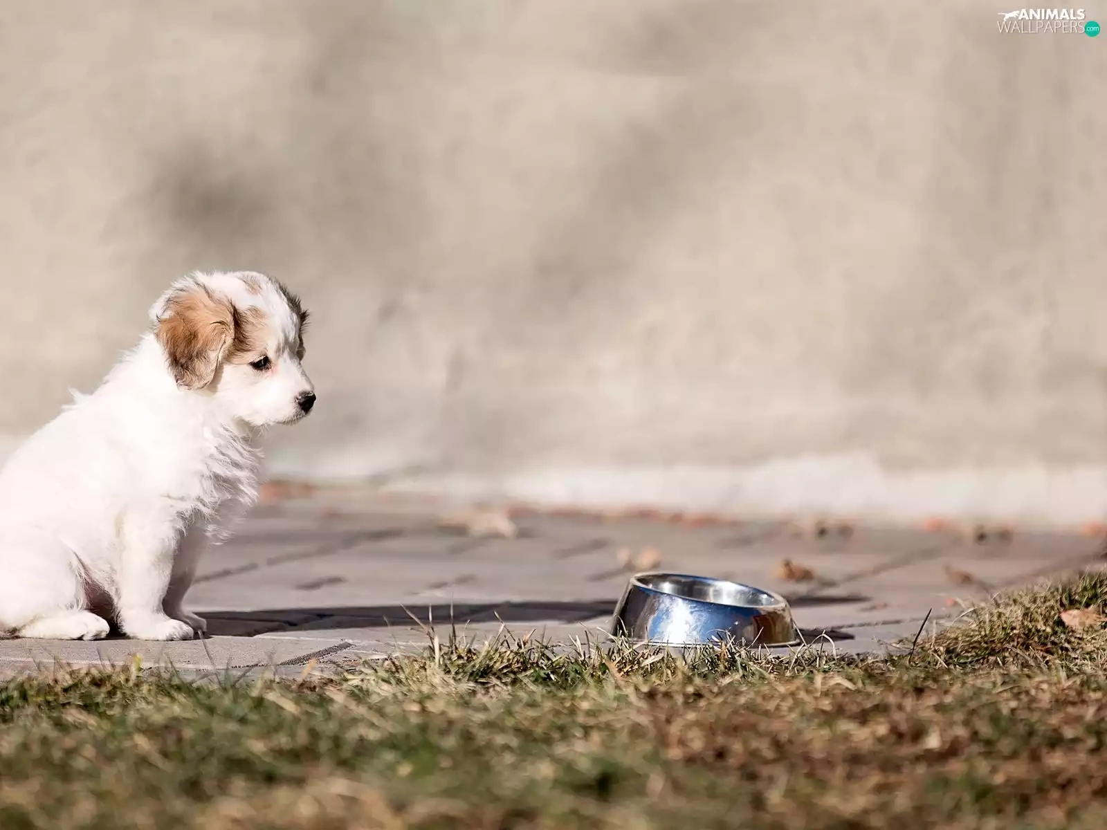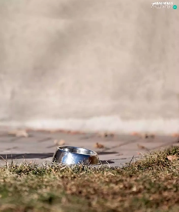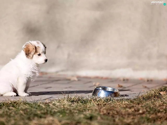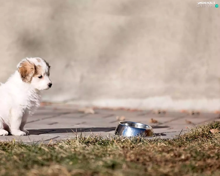 Puppy, Pavement, grass, bowl