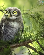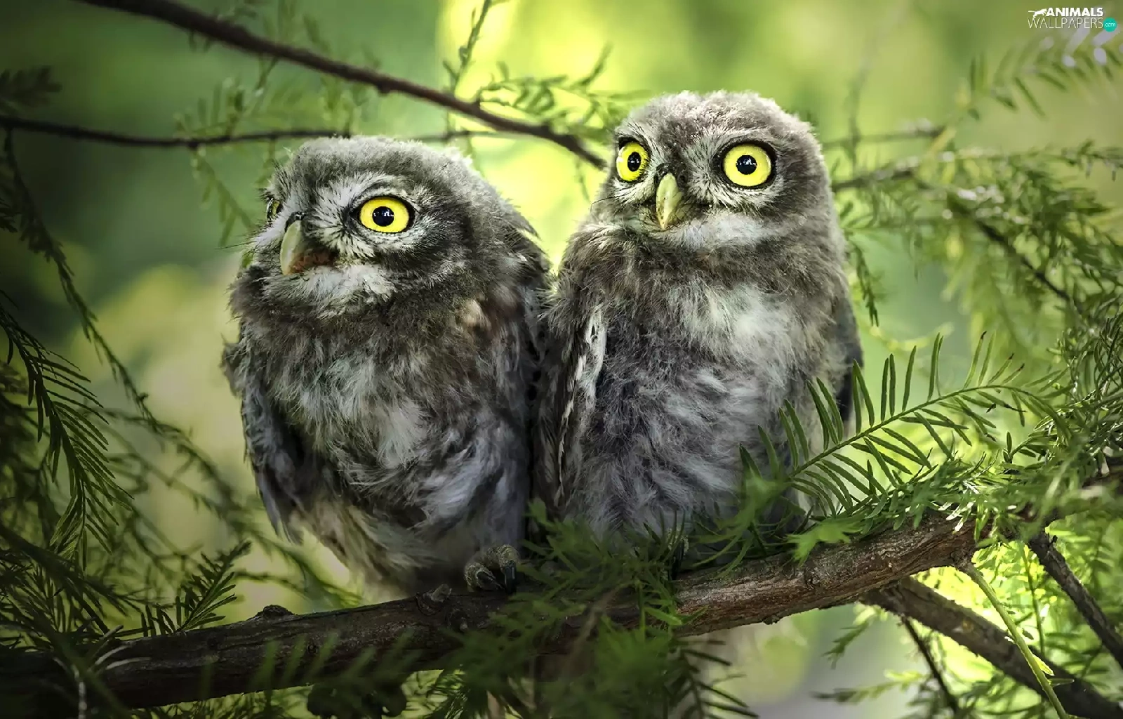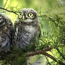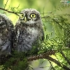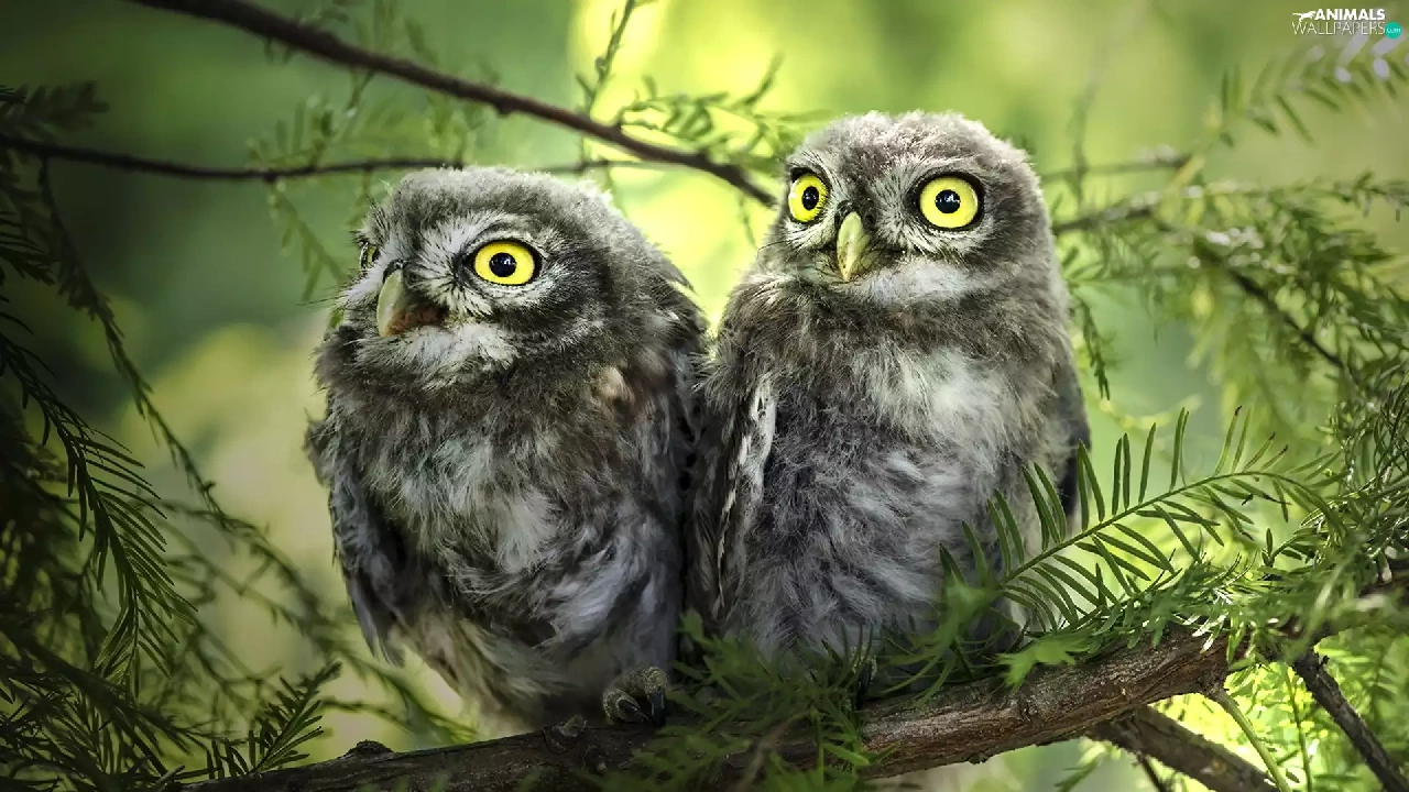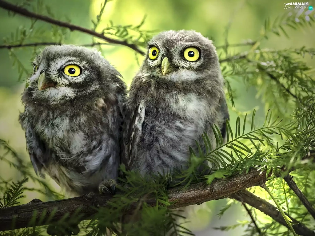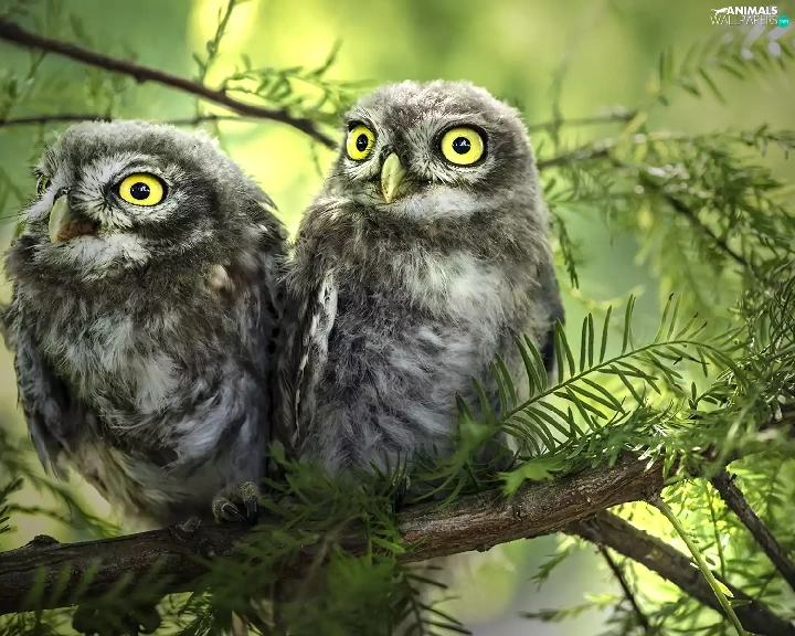 conifer, Two Owls, branch