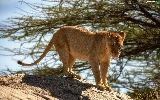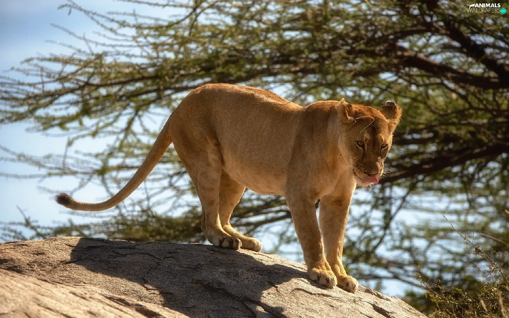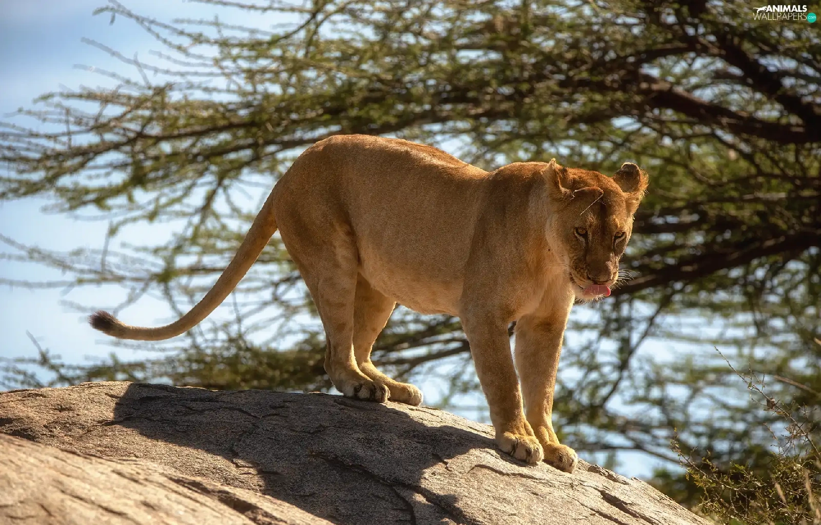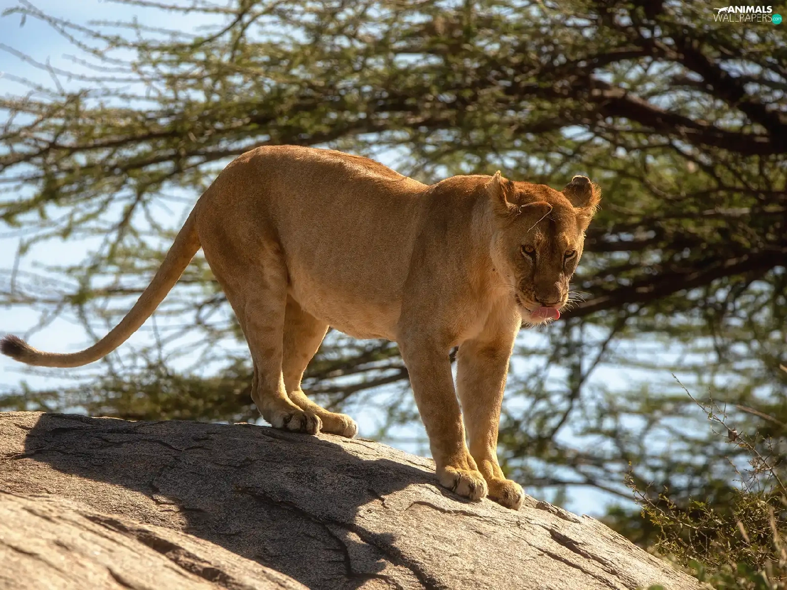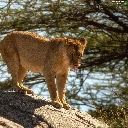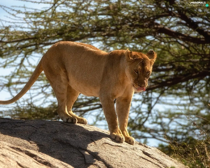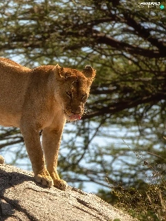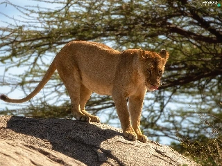 Lioness, branch pics, trees, Rocks