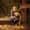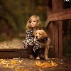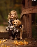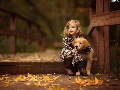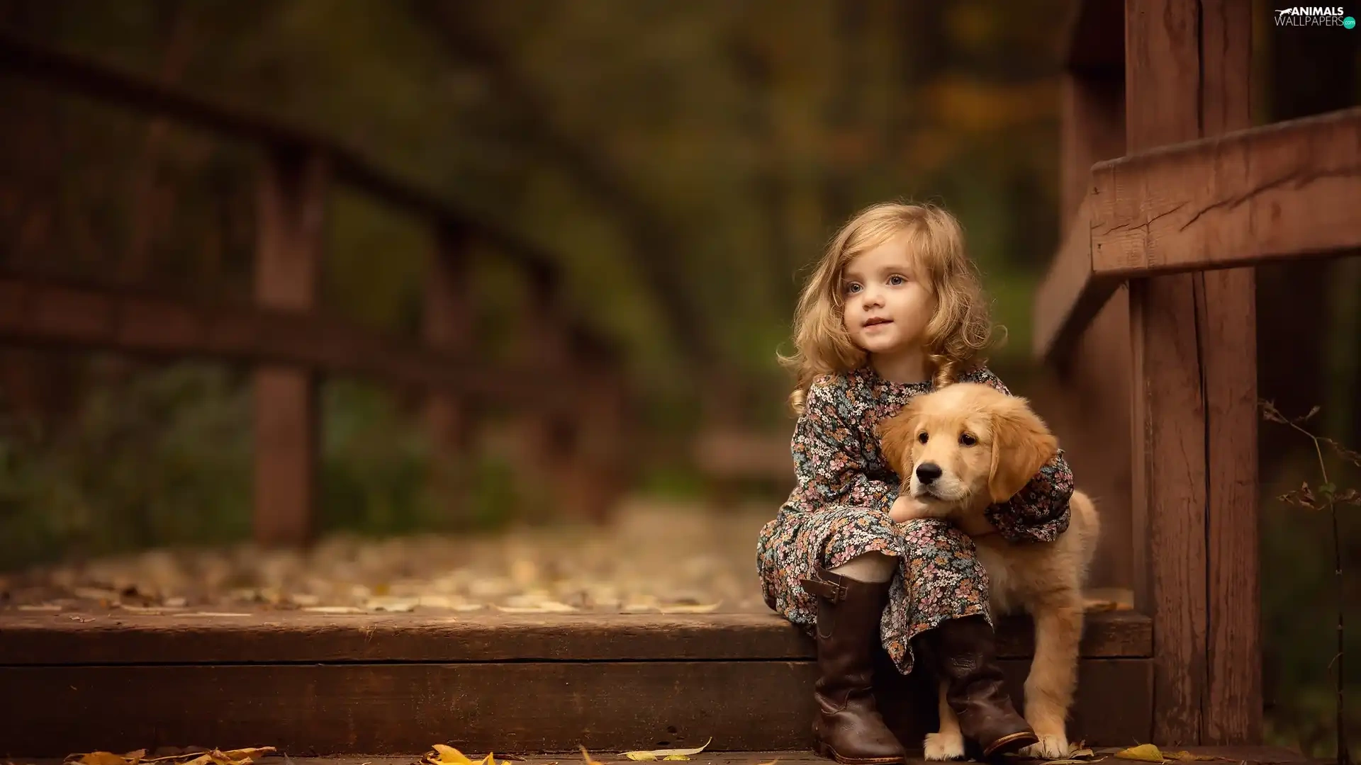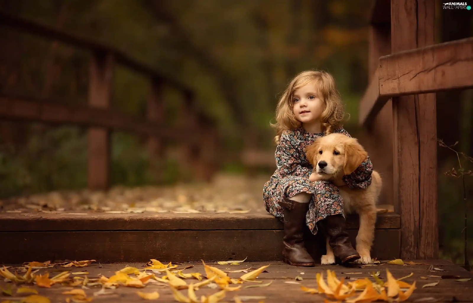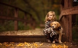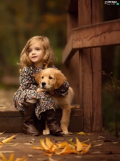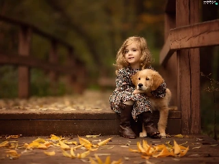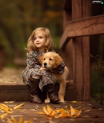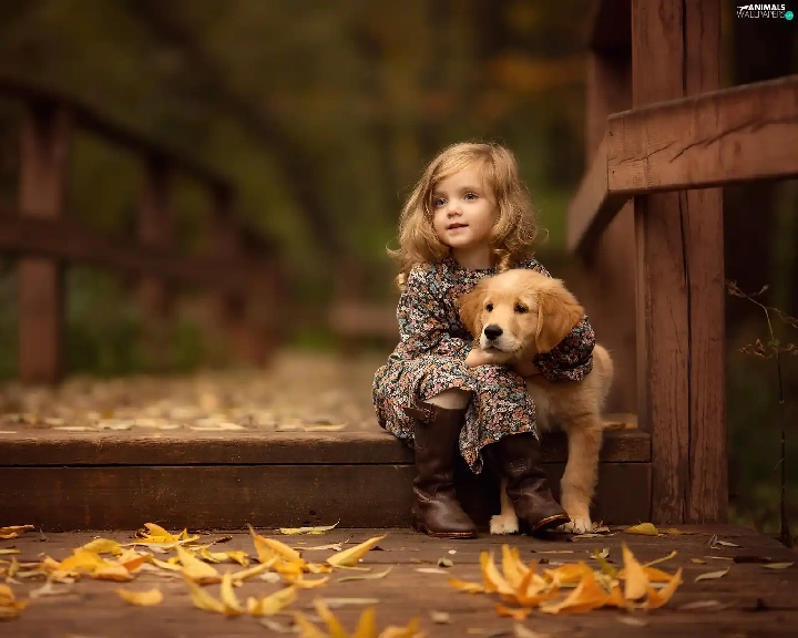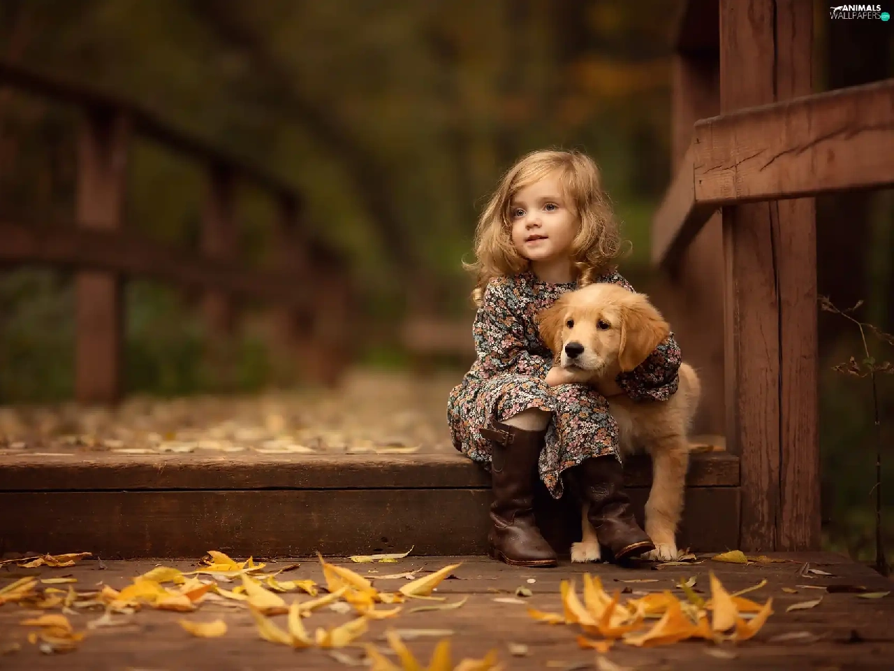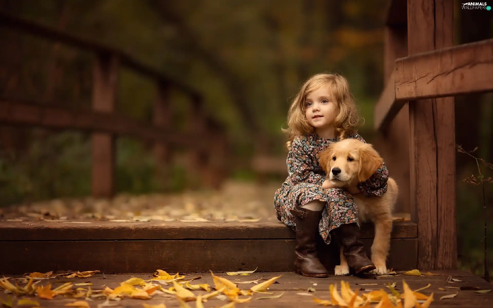 friend, Golden Retriever, Leaf, puppie, girl, bridge, autumn