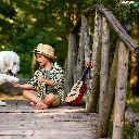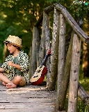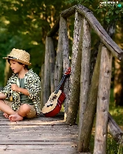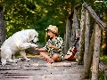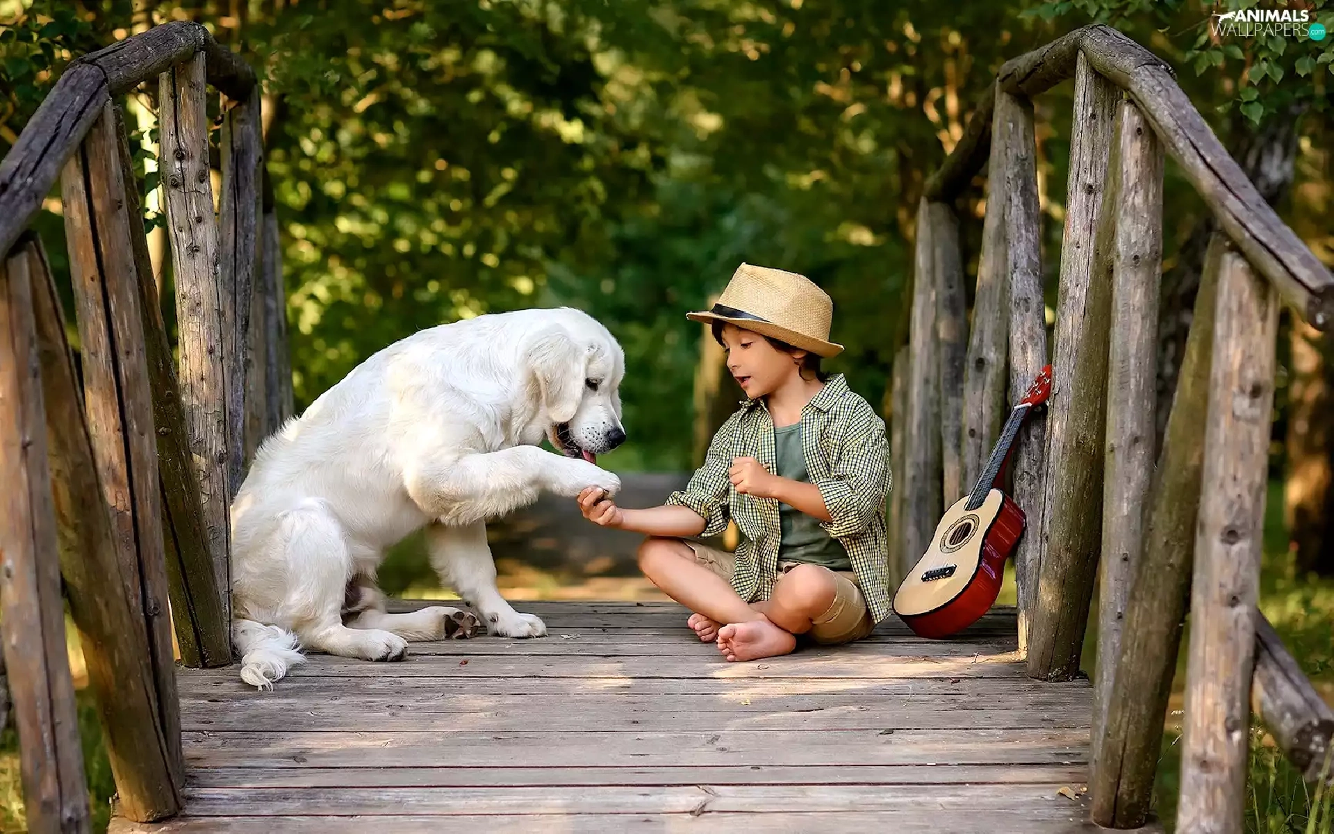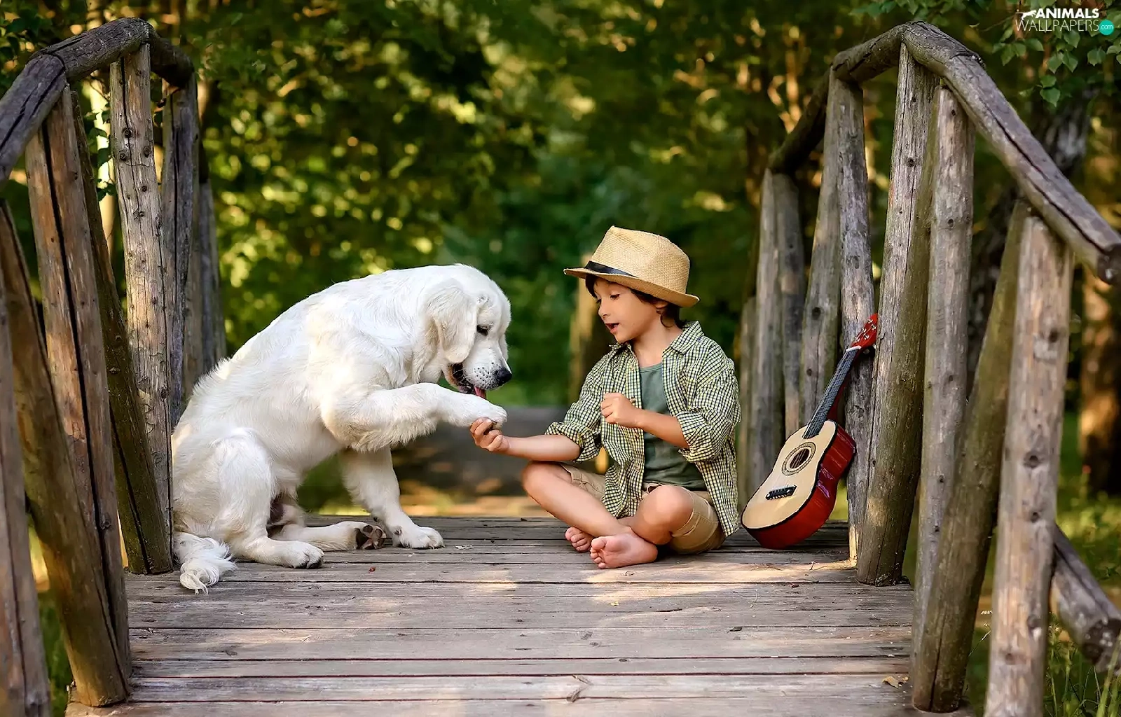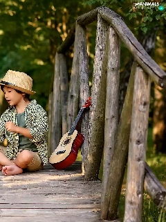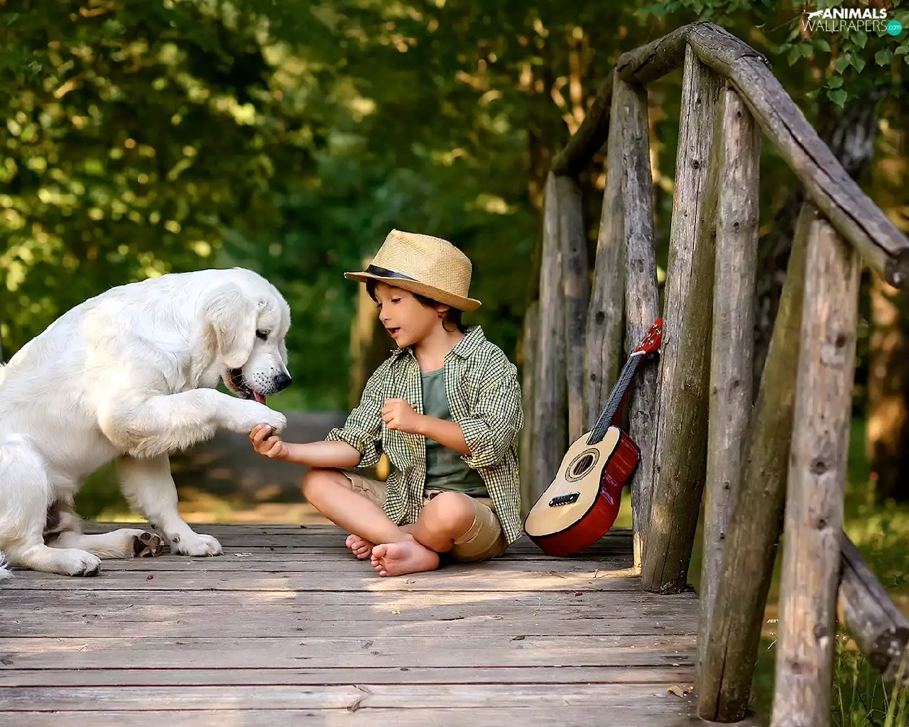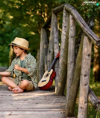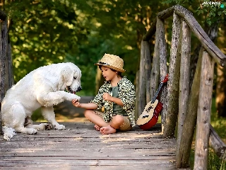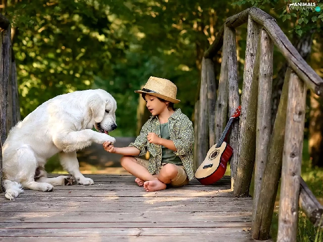 Labrador Retriever, boy, bridges, Guitar, footbridge, dog